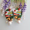 Orecchini piastrelle ceramica Caltagirone con grappolo perle bianche  , orecchini siciliani