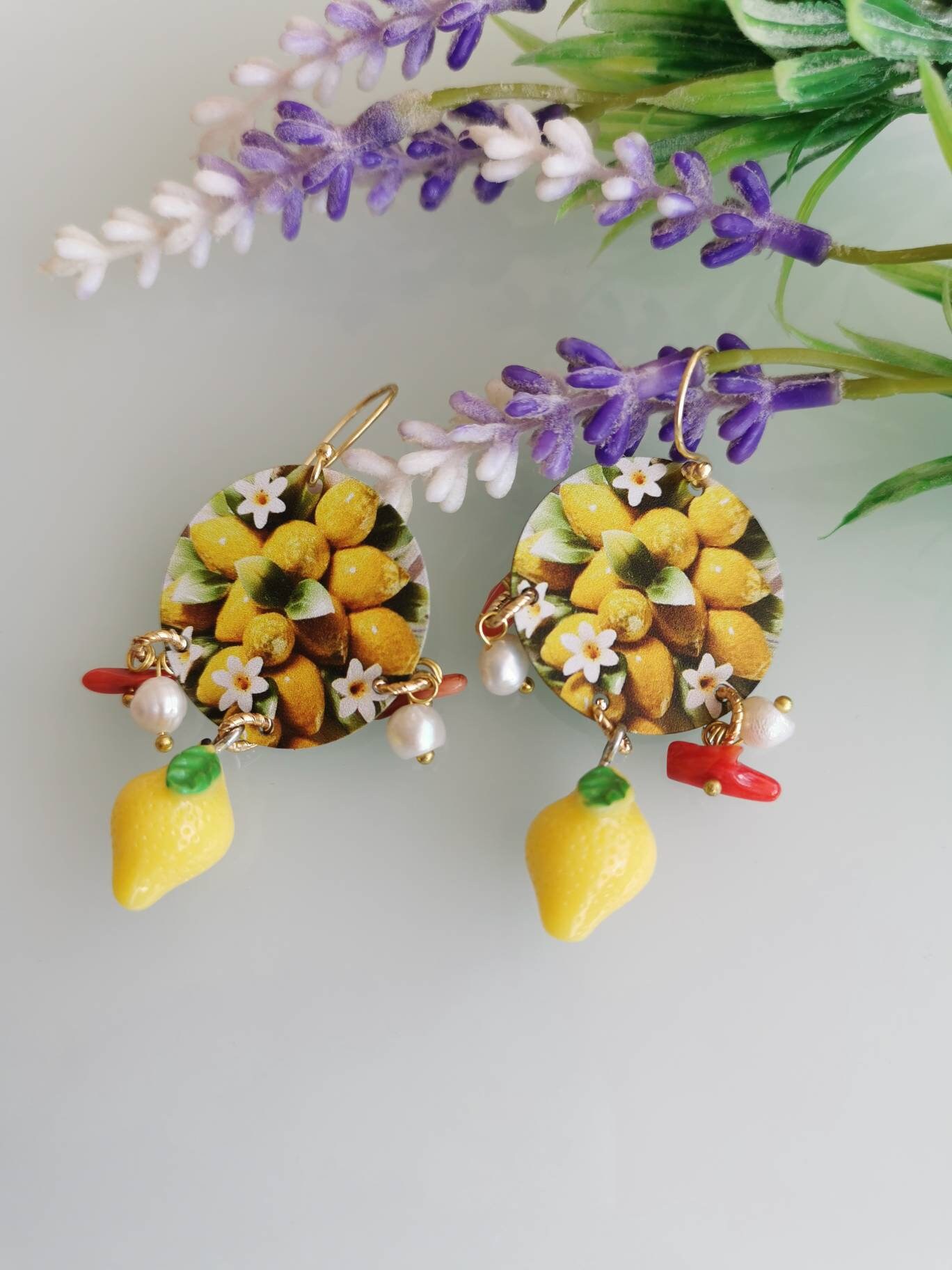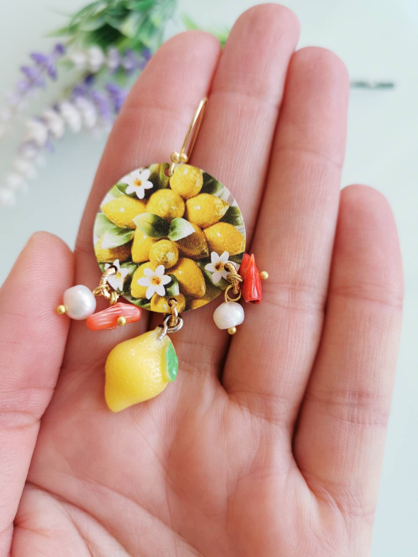 Orecchini pendenti realizzati con dischi metallo stampato 3 cm diametro , limoni resina, perle bianche e corallo rosso bambù , chiusure a monachelle in ottone. .