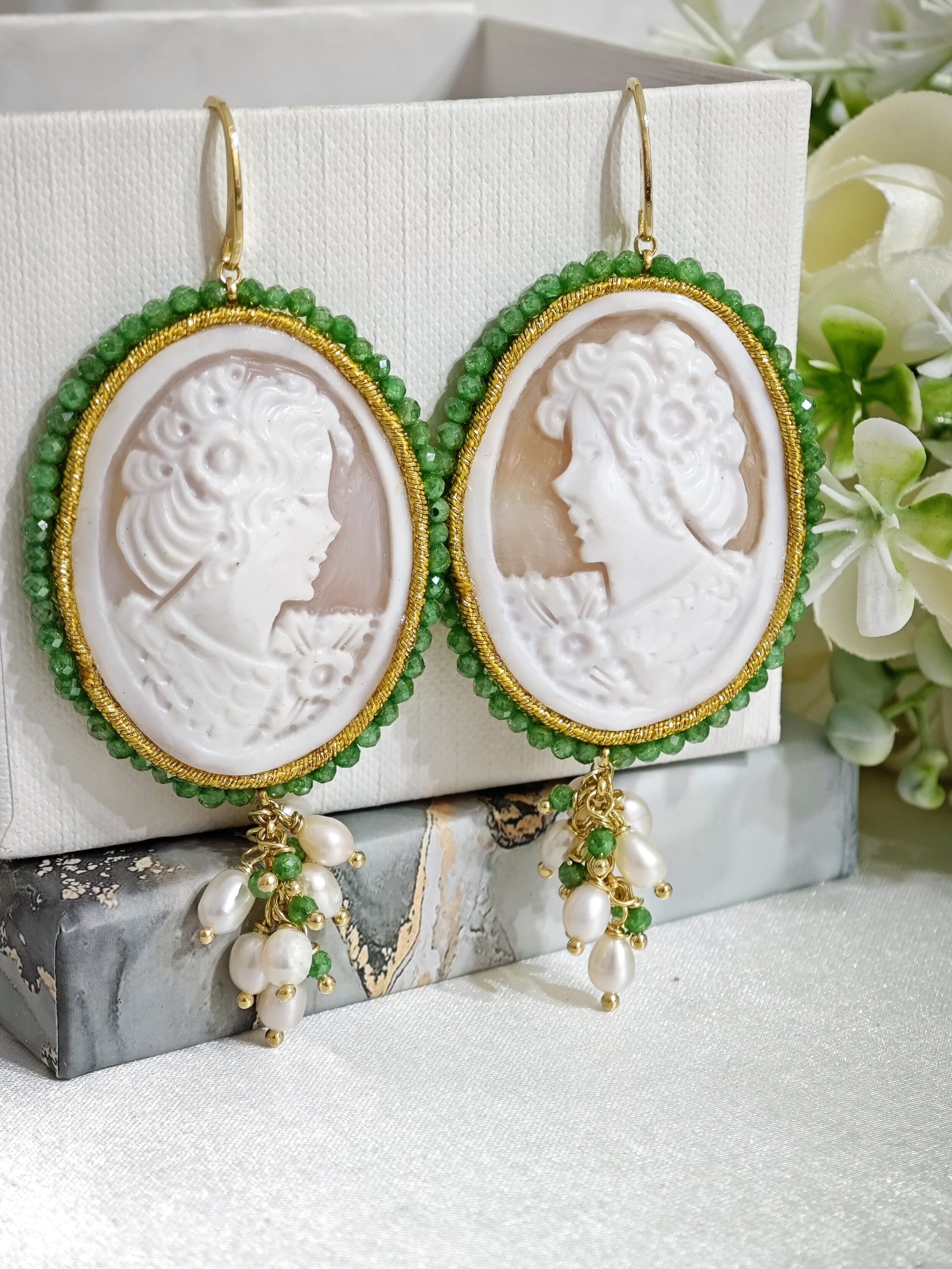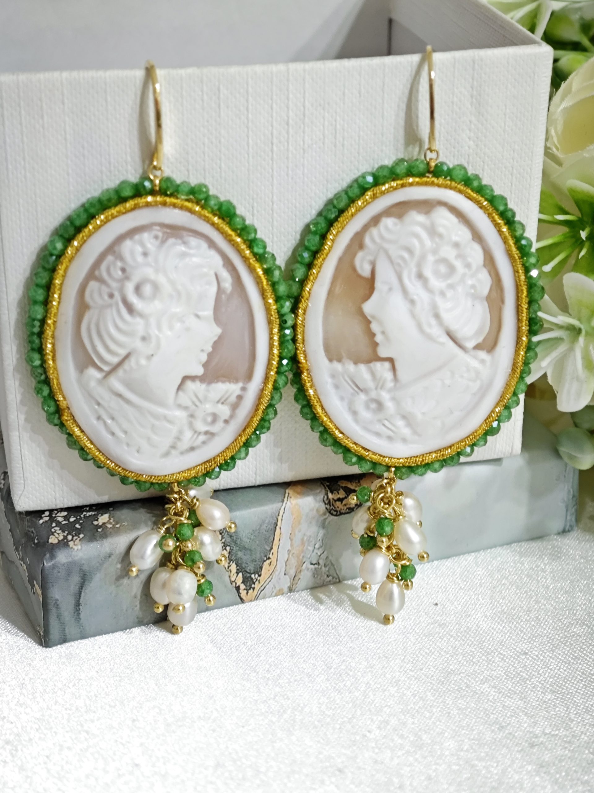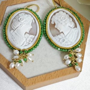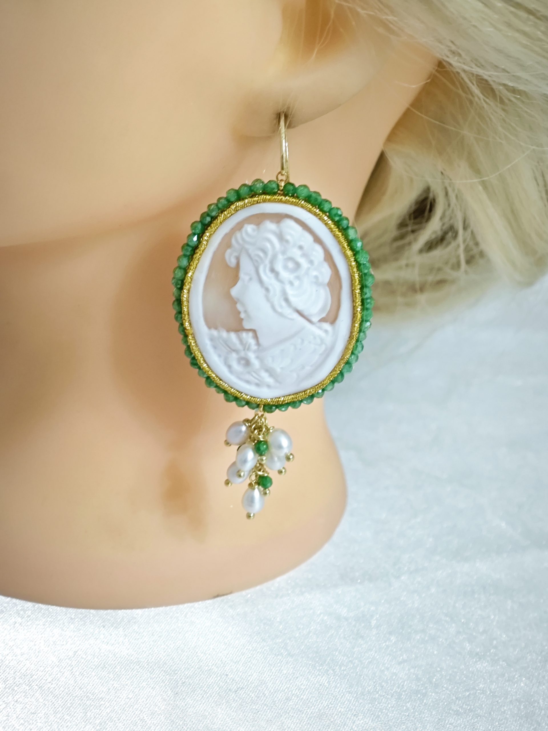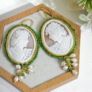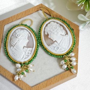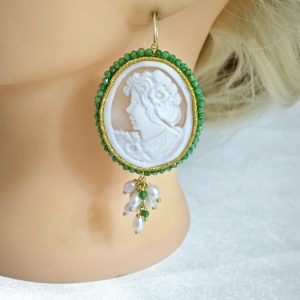 Orecchini pendenti maxi con cammeo autentico in conchiglia sardonica , realizzati a mano a Torre del greco raffigurante volto di donna, con cornice perline quarzo verde  4,8×3,8 cm dimensioni , grappolo perle naturali bianche e pietre quarzo verde, chiusura a monachella in argento 925 placcato oro.