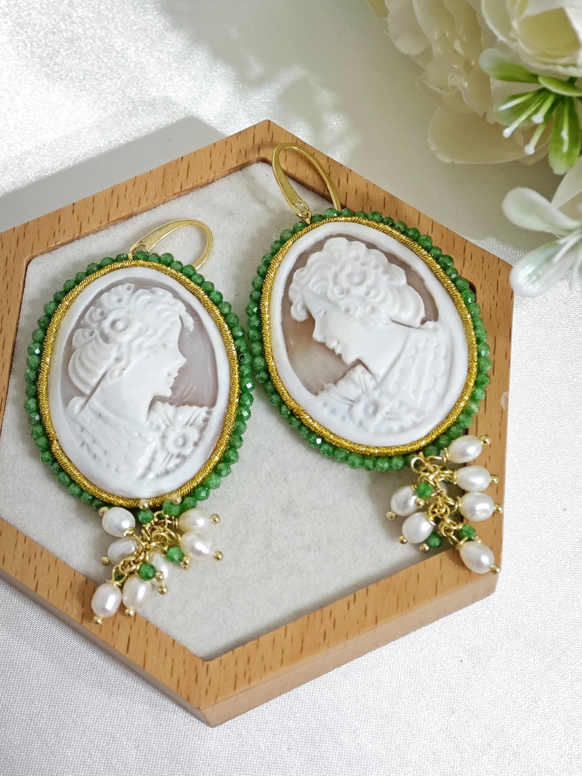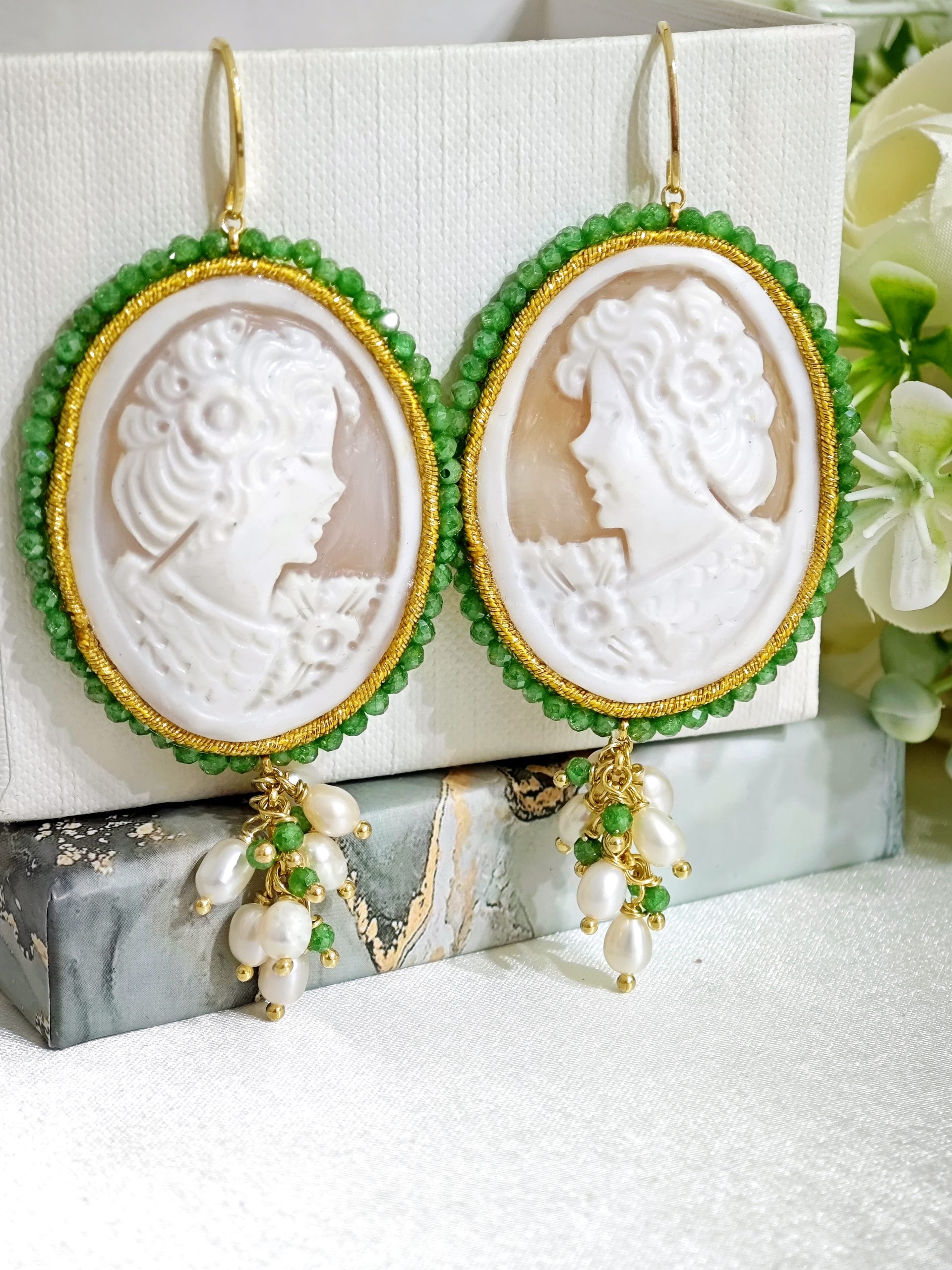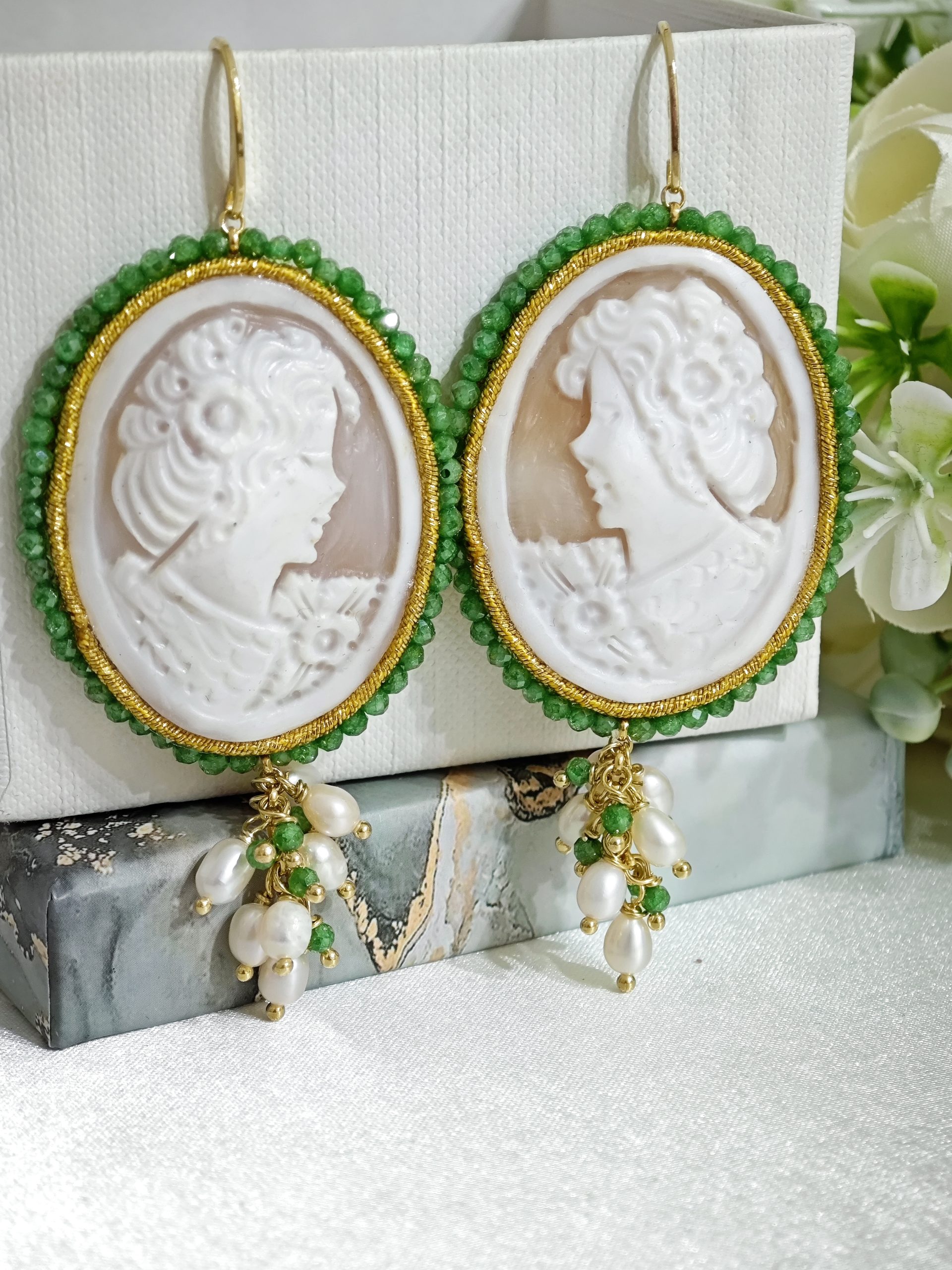 Orecchini pendenti maxi con cammeo autentico in conchiglia sardonica , realizzati a mano a Torre del greco raffigurante volto di donna, con cornice perline quarzo verde  4,8×3,8 cm dimensioni , grappolo perle naturali bianche e pietre quarzo verde, chiusura a monachella in argento 925 placcato oro.