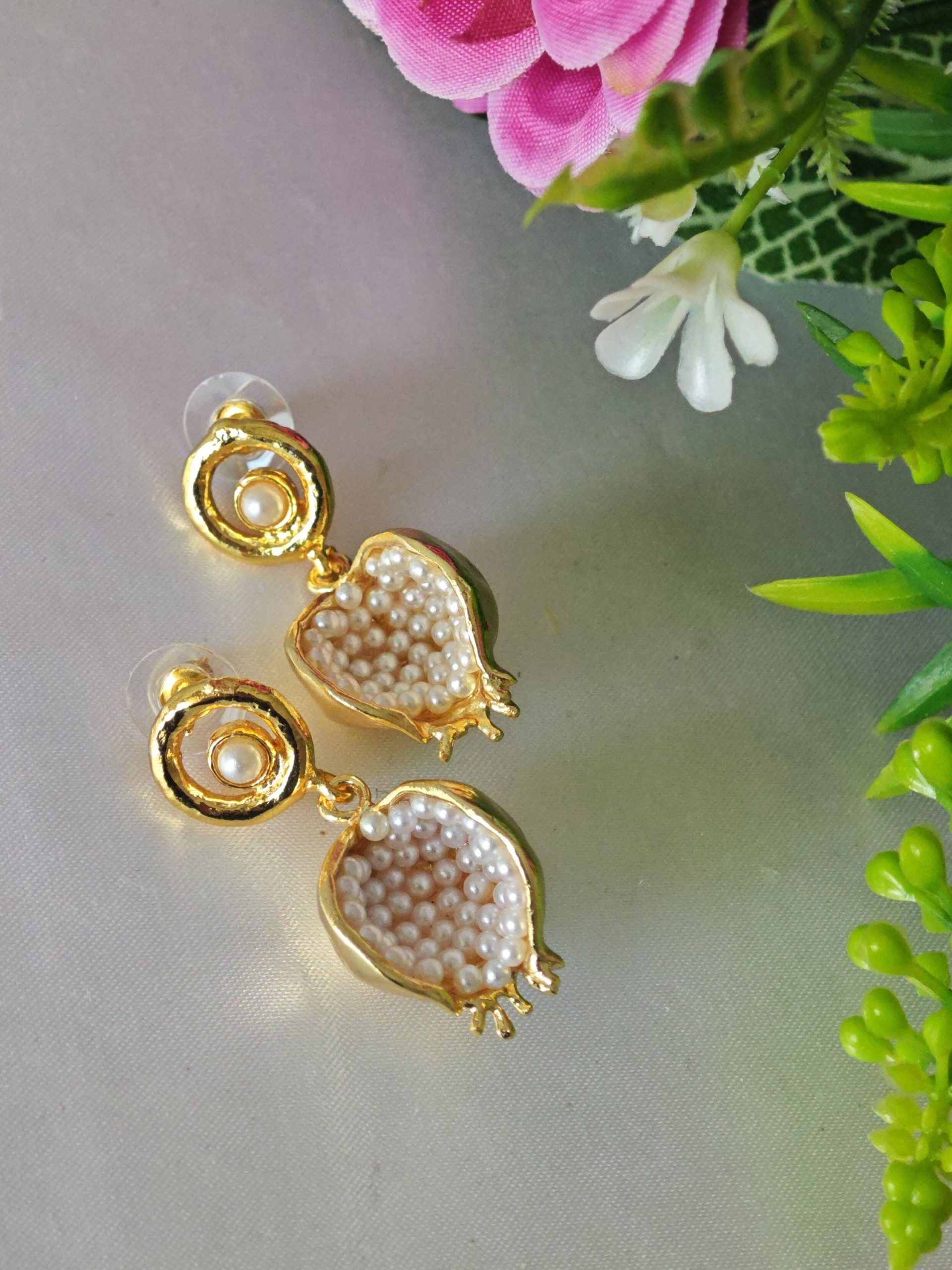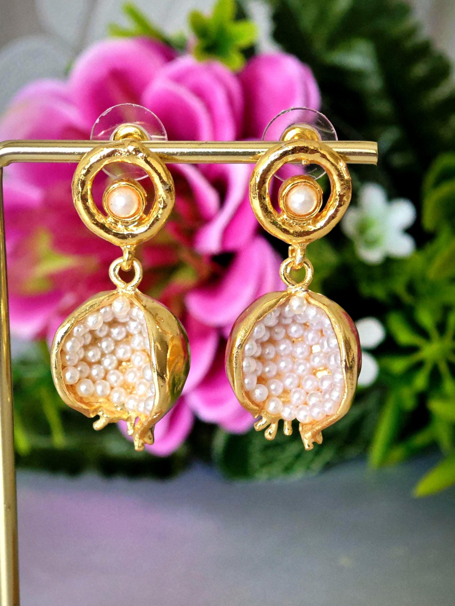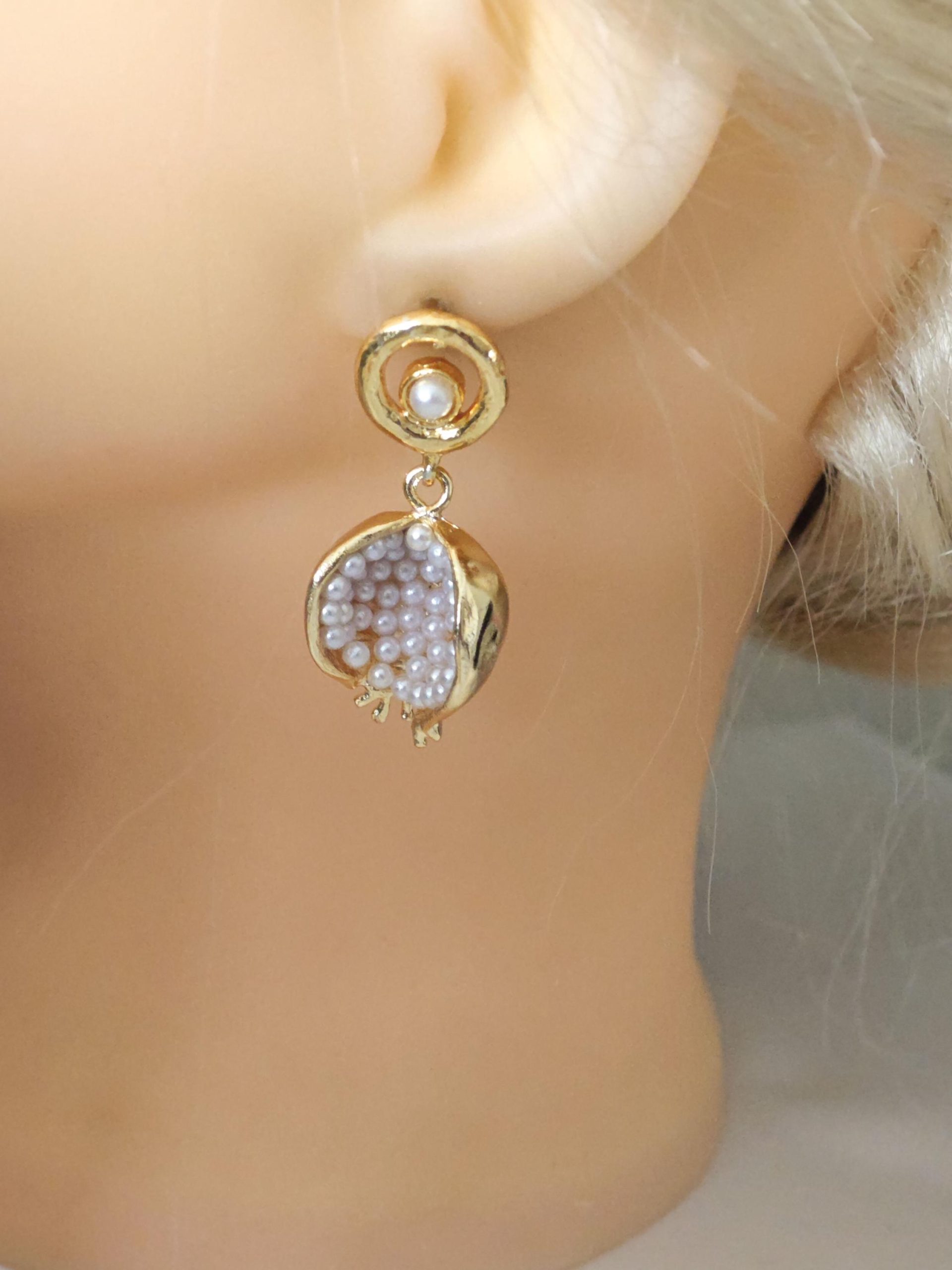 Orecchini pendenti artigianali con melograni in ottone dorato , pave perline bianche .