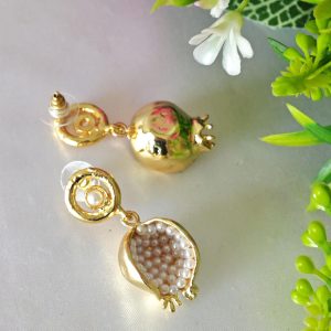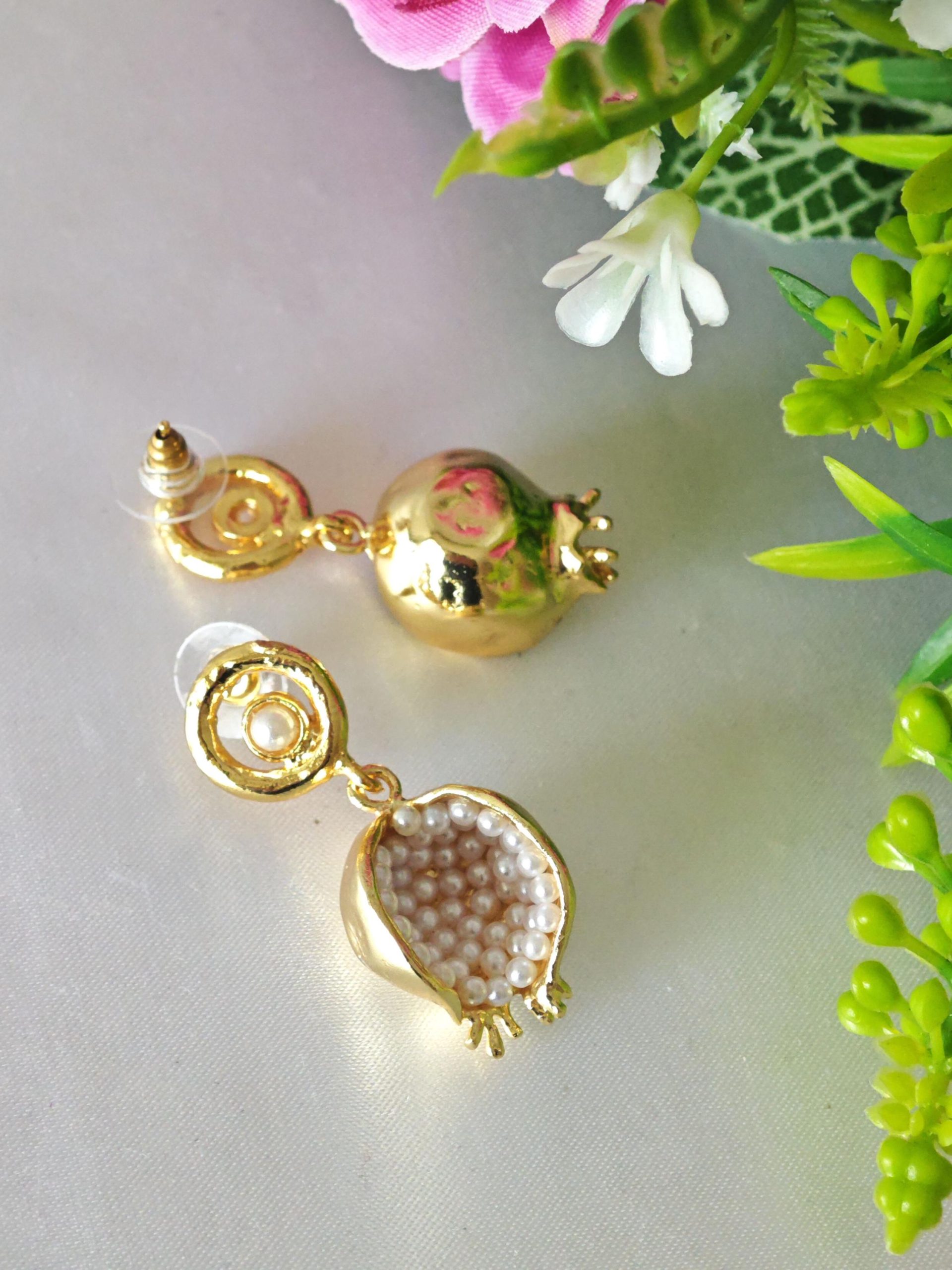 Orecchini melograni ottone dorato e perle bianche, orecchini portafortuna
