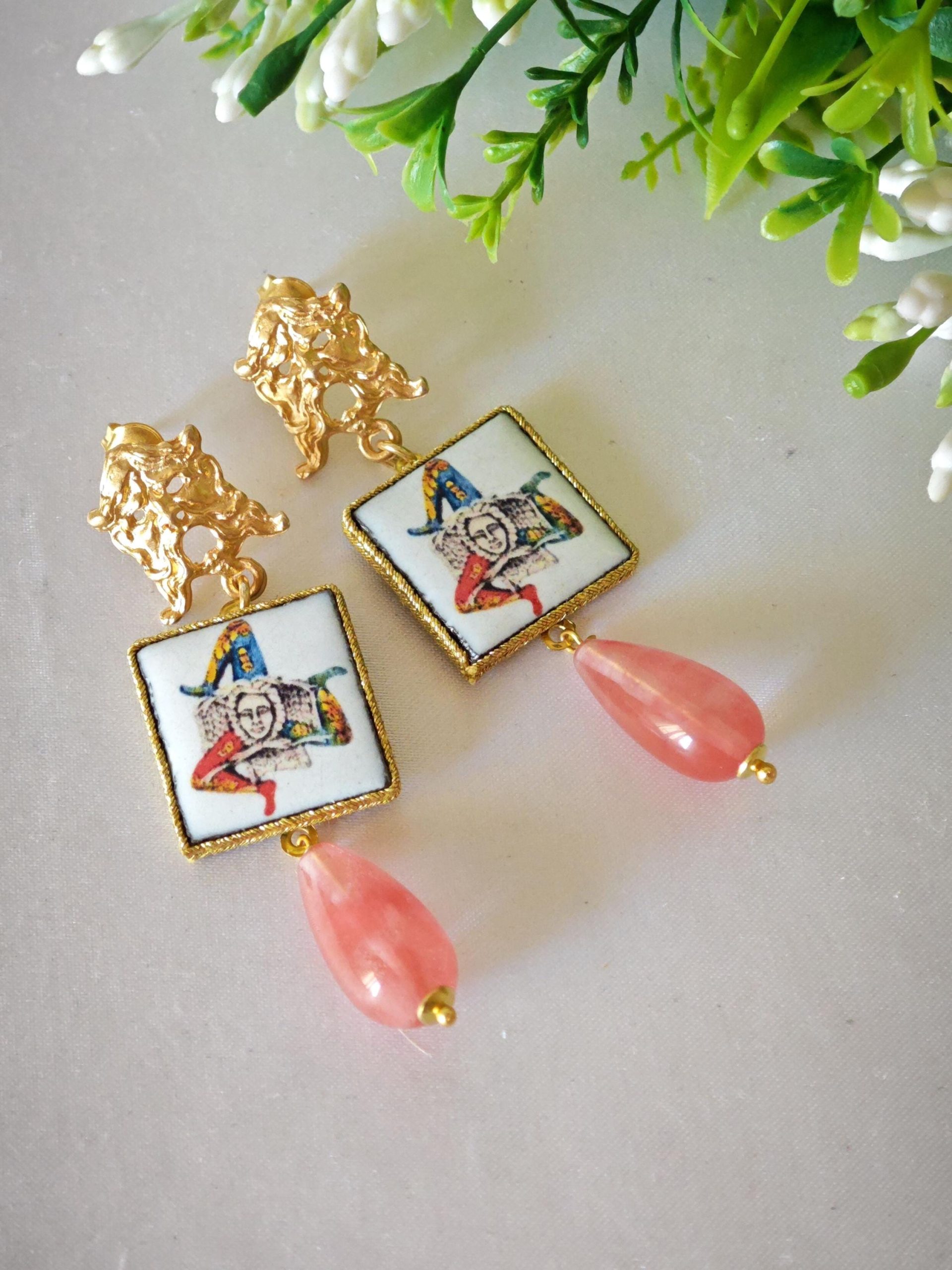 Orecchini pendenti con piastrelle ceramica Caltagirone, gocce quarzo rosa, orecchini siciliani