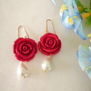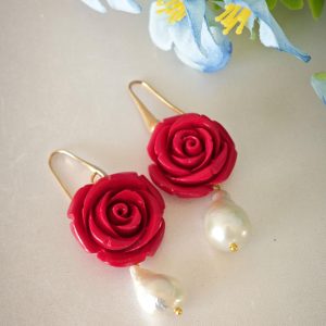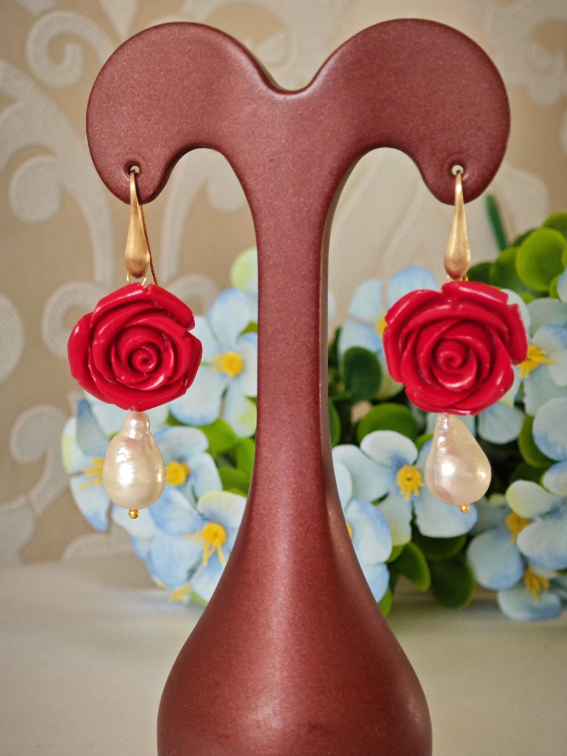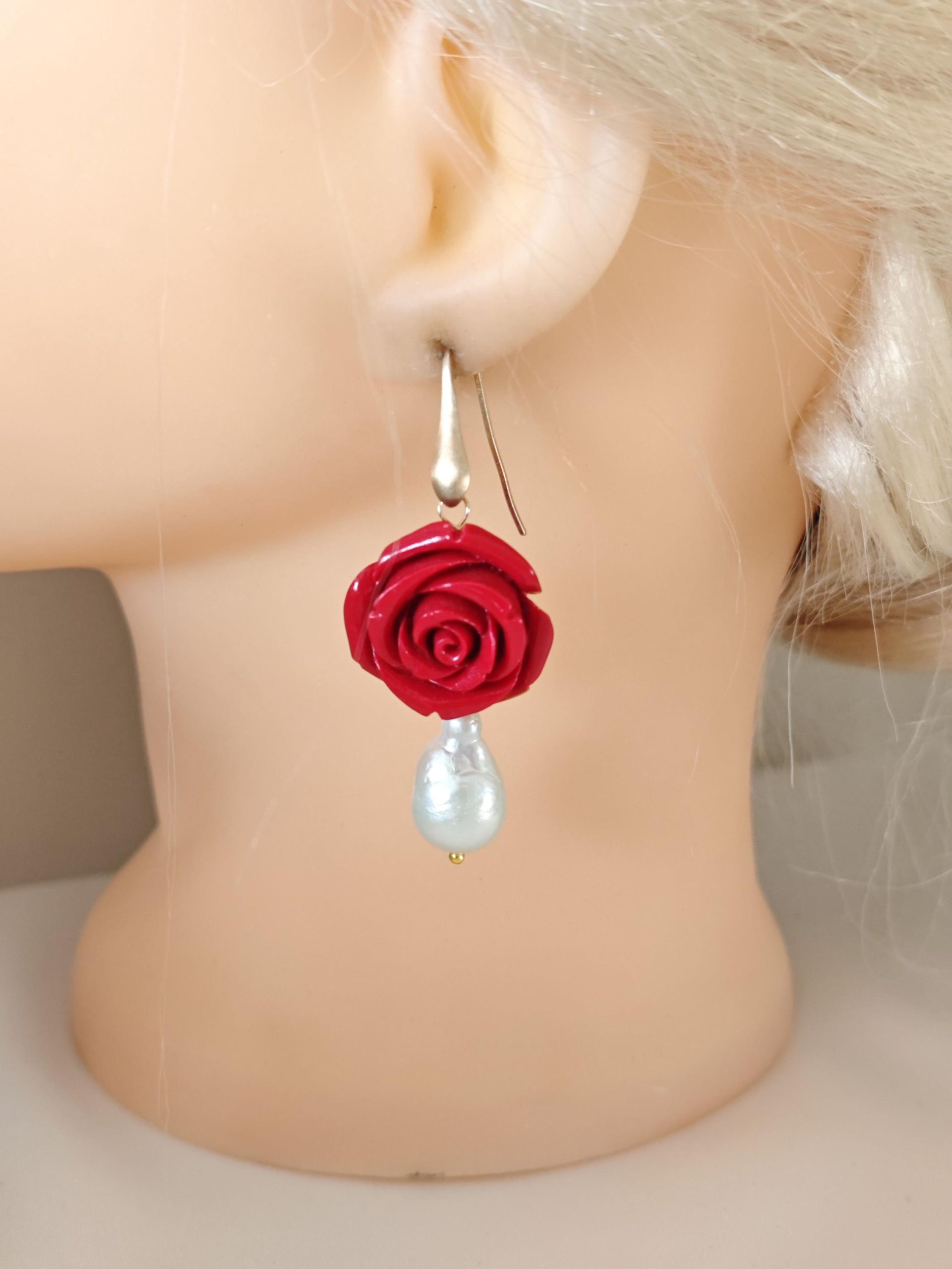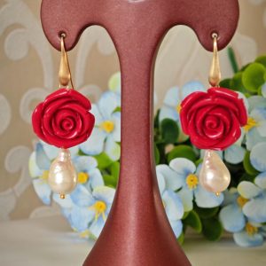 Orecchini pendenti rose rosse e perle barocche bianche , orecchini argento 925 placcato oro