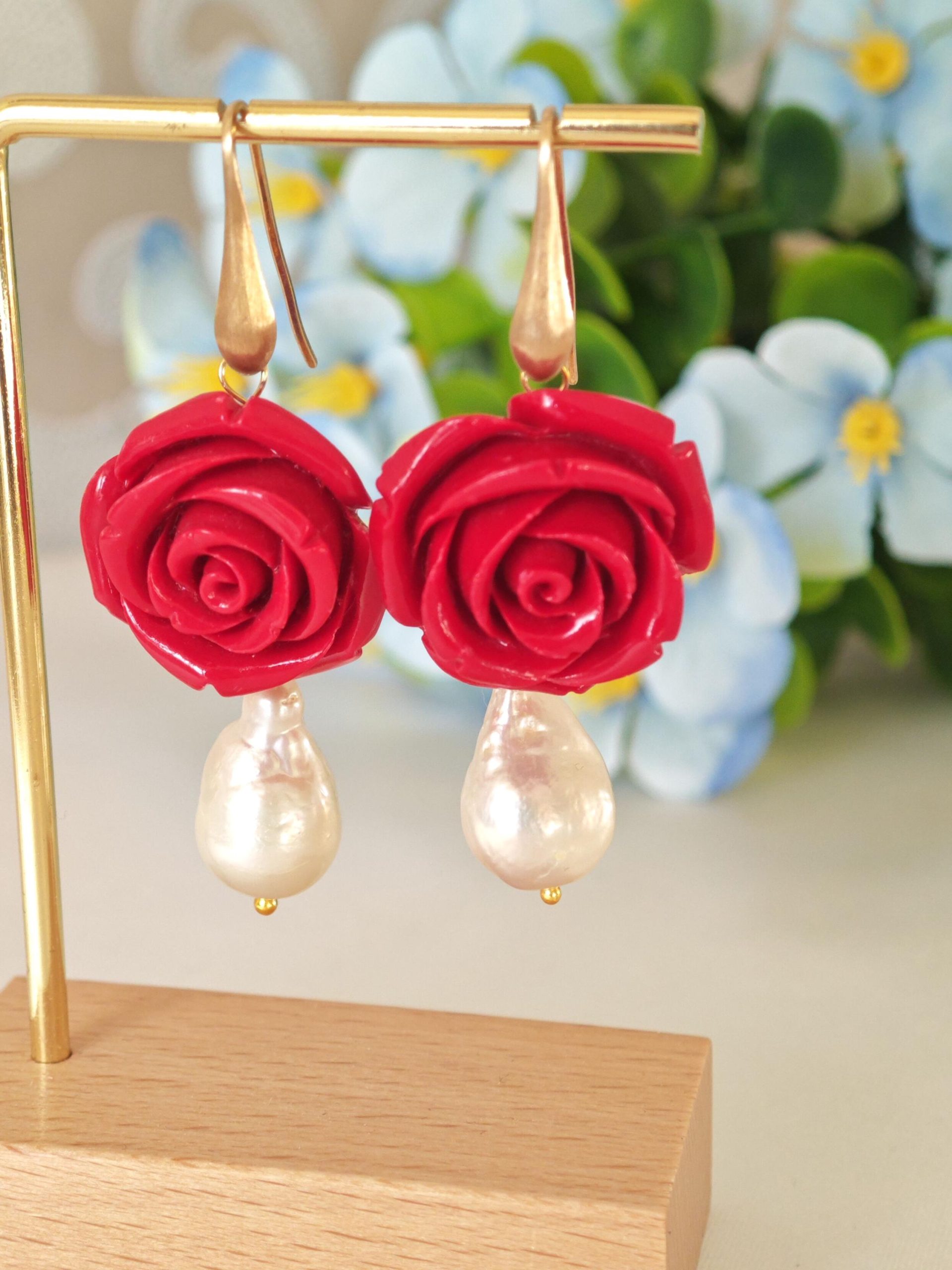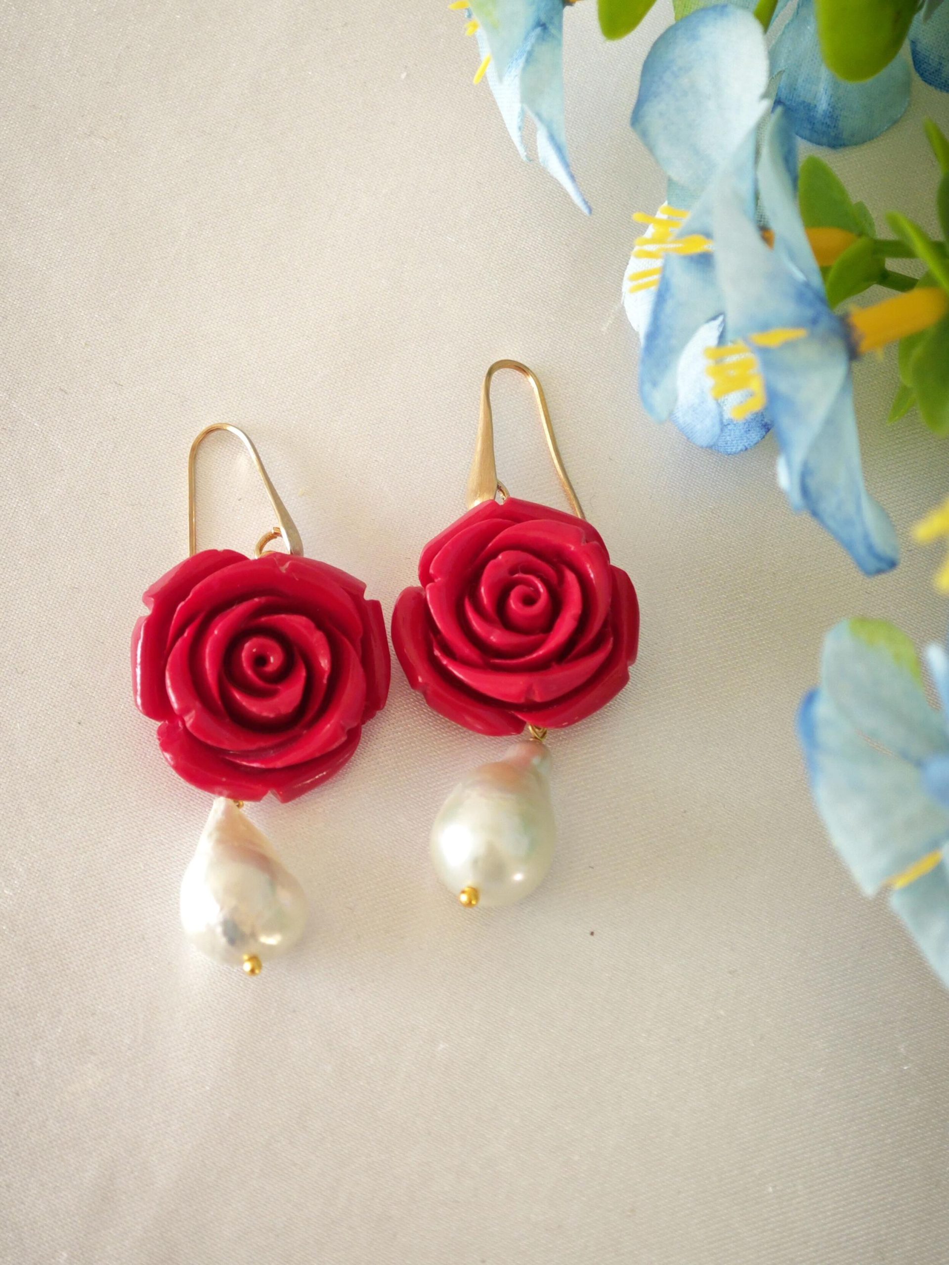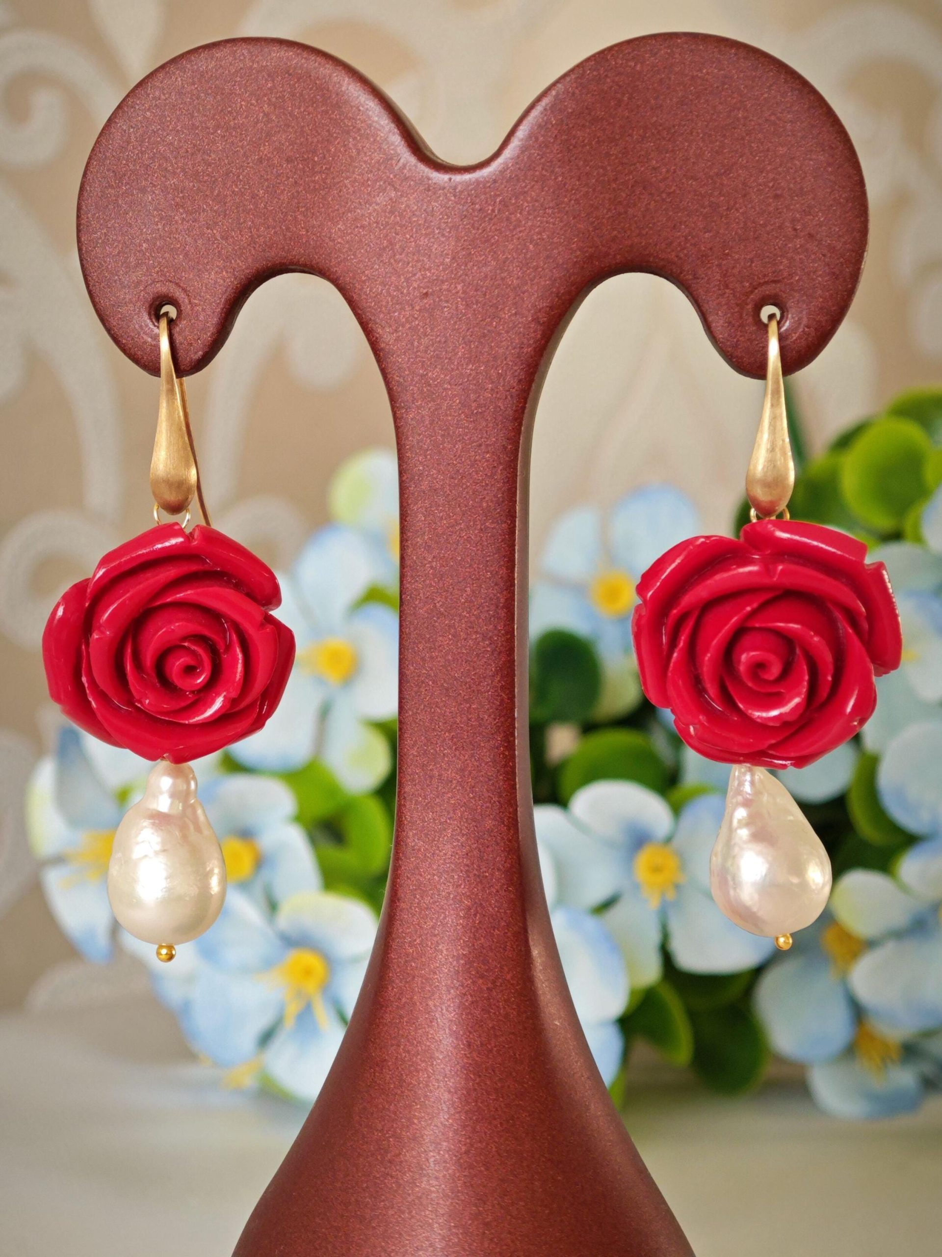 Orecchini pendenti rose rosse e perle barocche bianche , orecchini argento 925 placcato oro