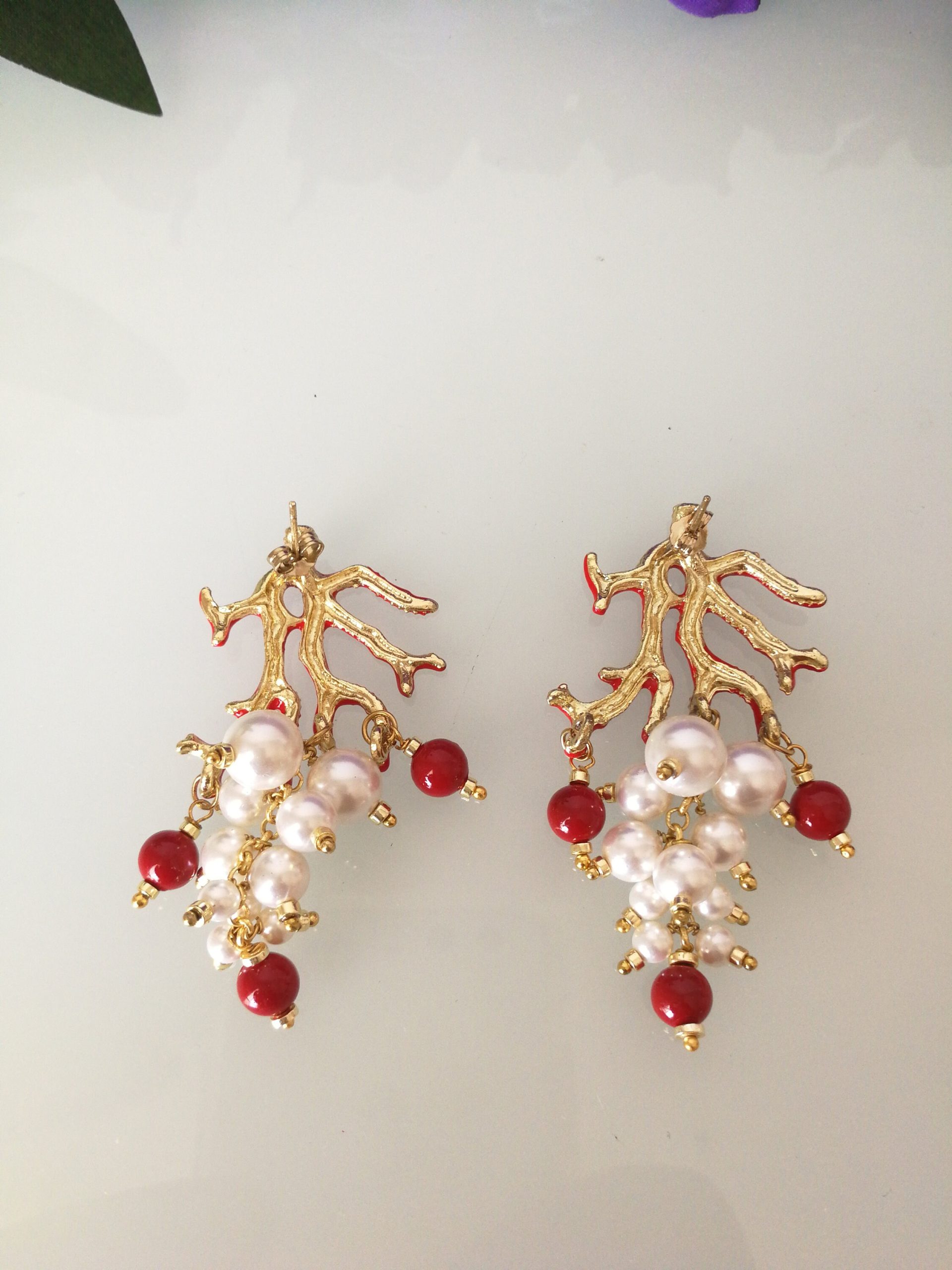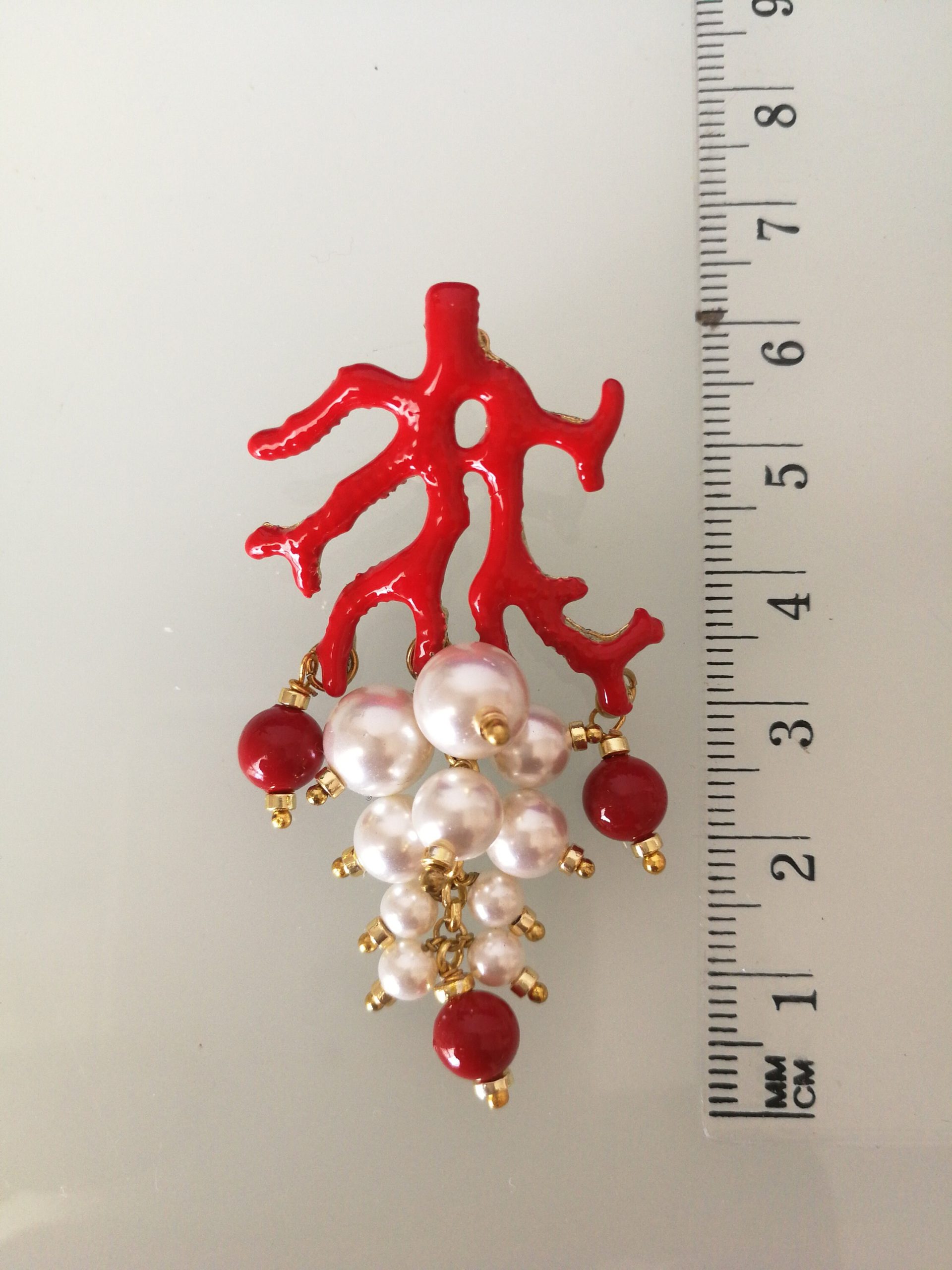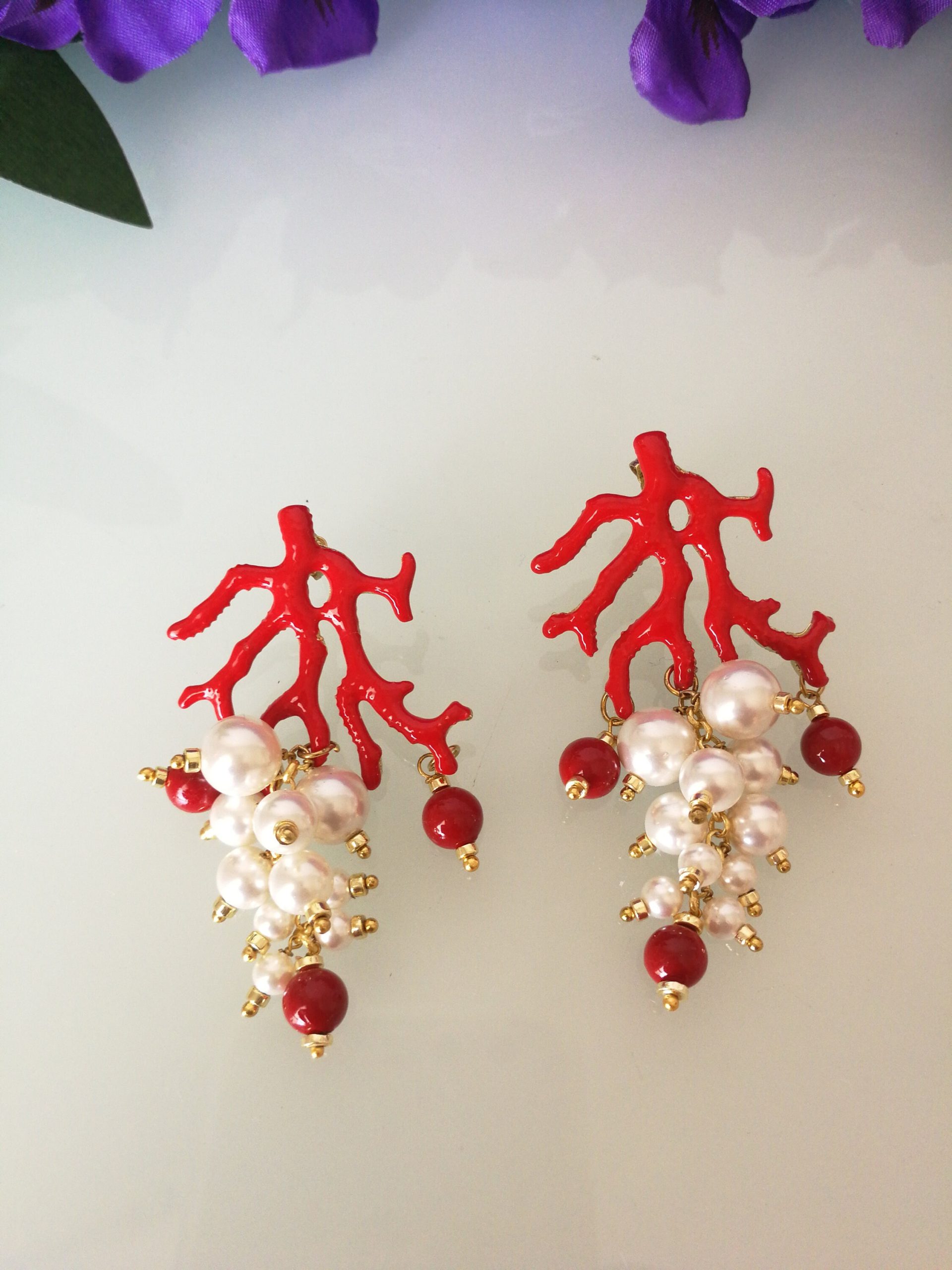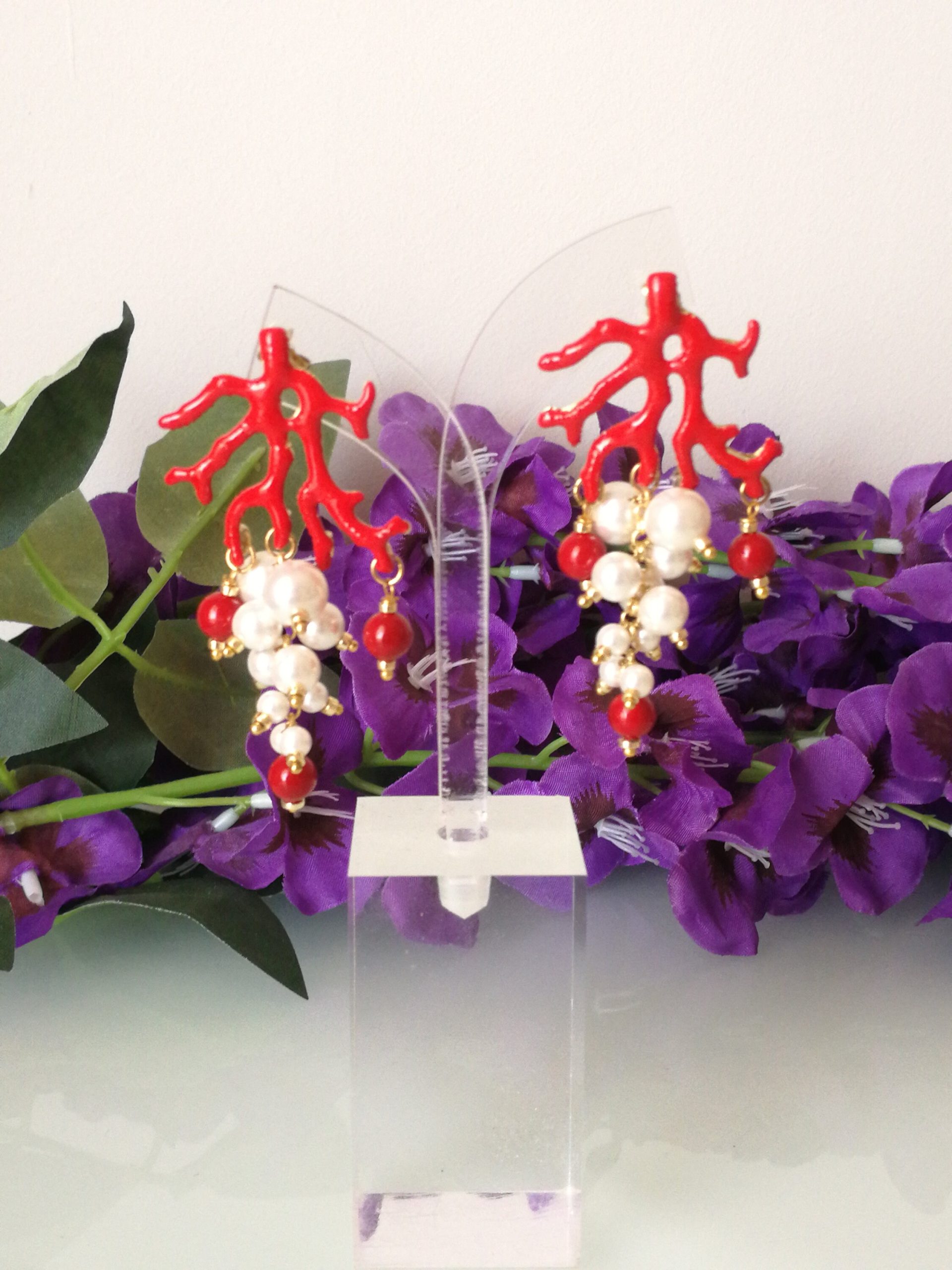 Orecchini eleganti a perno con perlina naturale bianca e corallo rosso perlina naturale del mediterraneo. Montatura in ottone smaltato rosso a forma di corallo in ottone dorato . Misura Lunghezza 6 cm