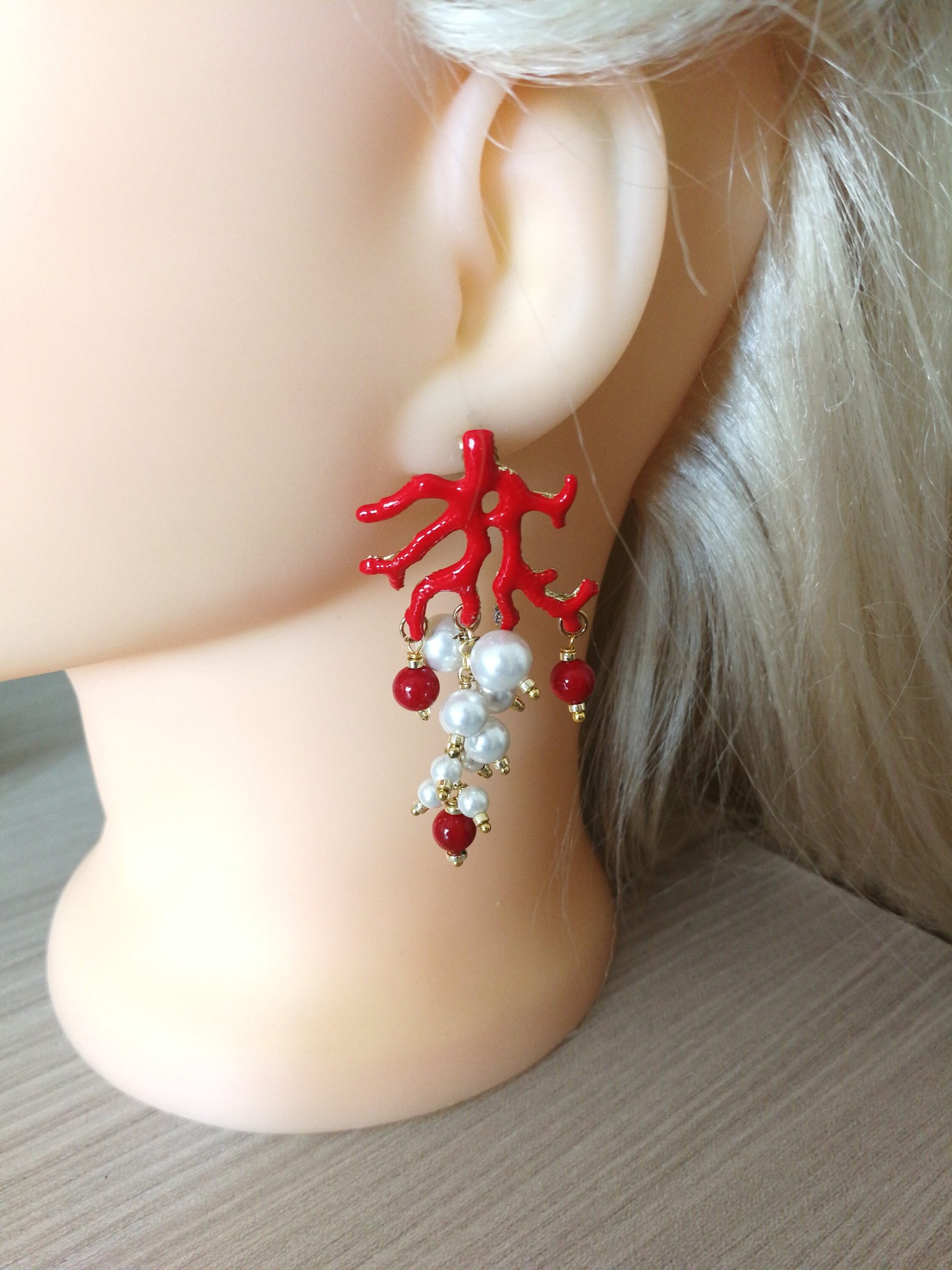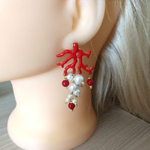 Orecchini corallo rosso naturale e perle barocche bianche , gioielli italiani