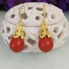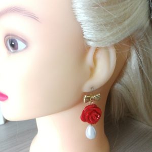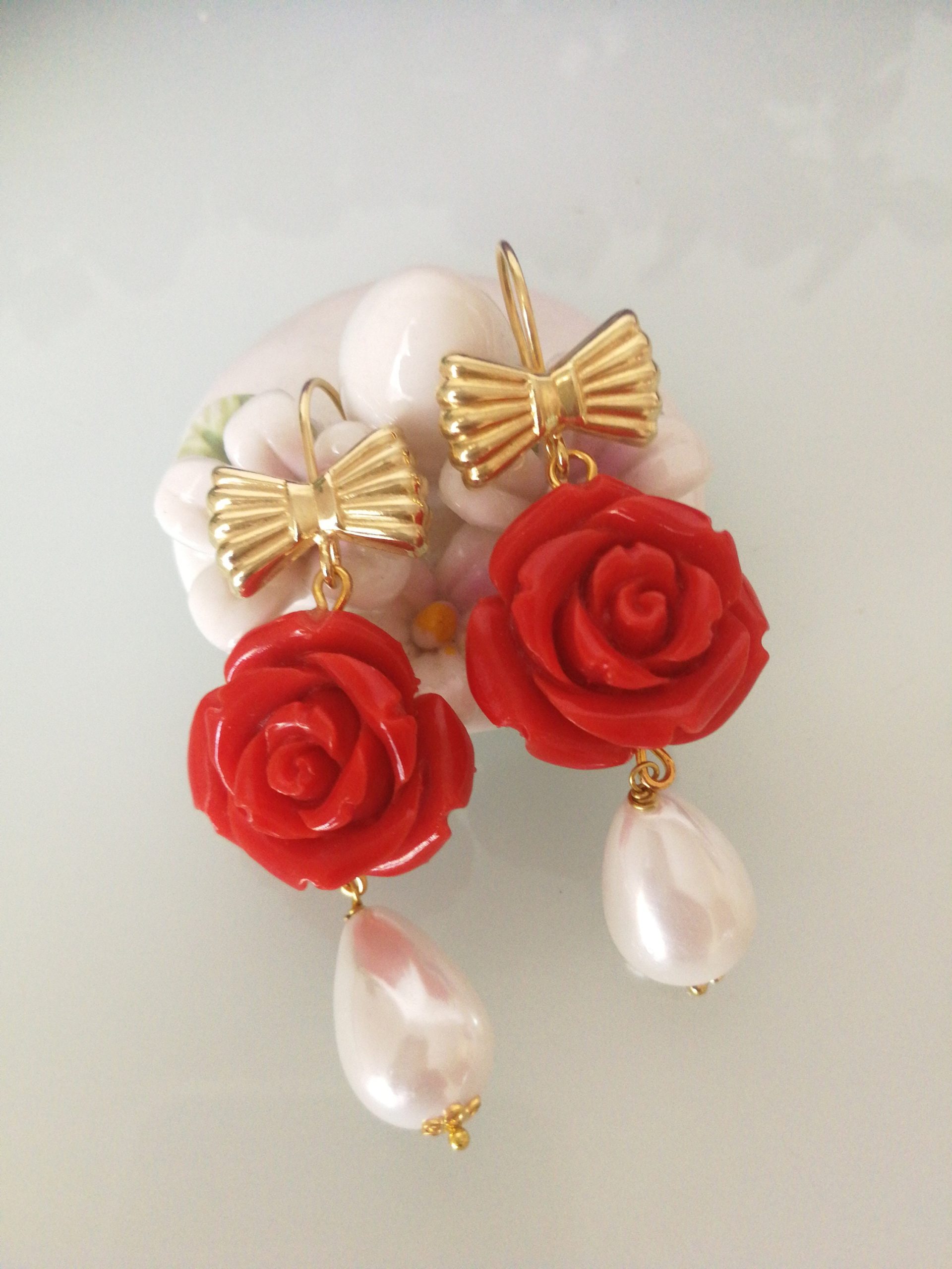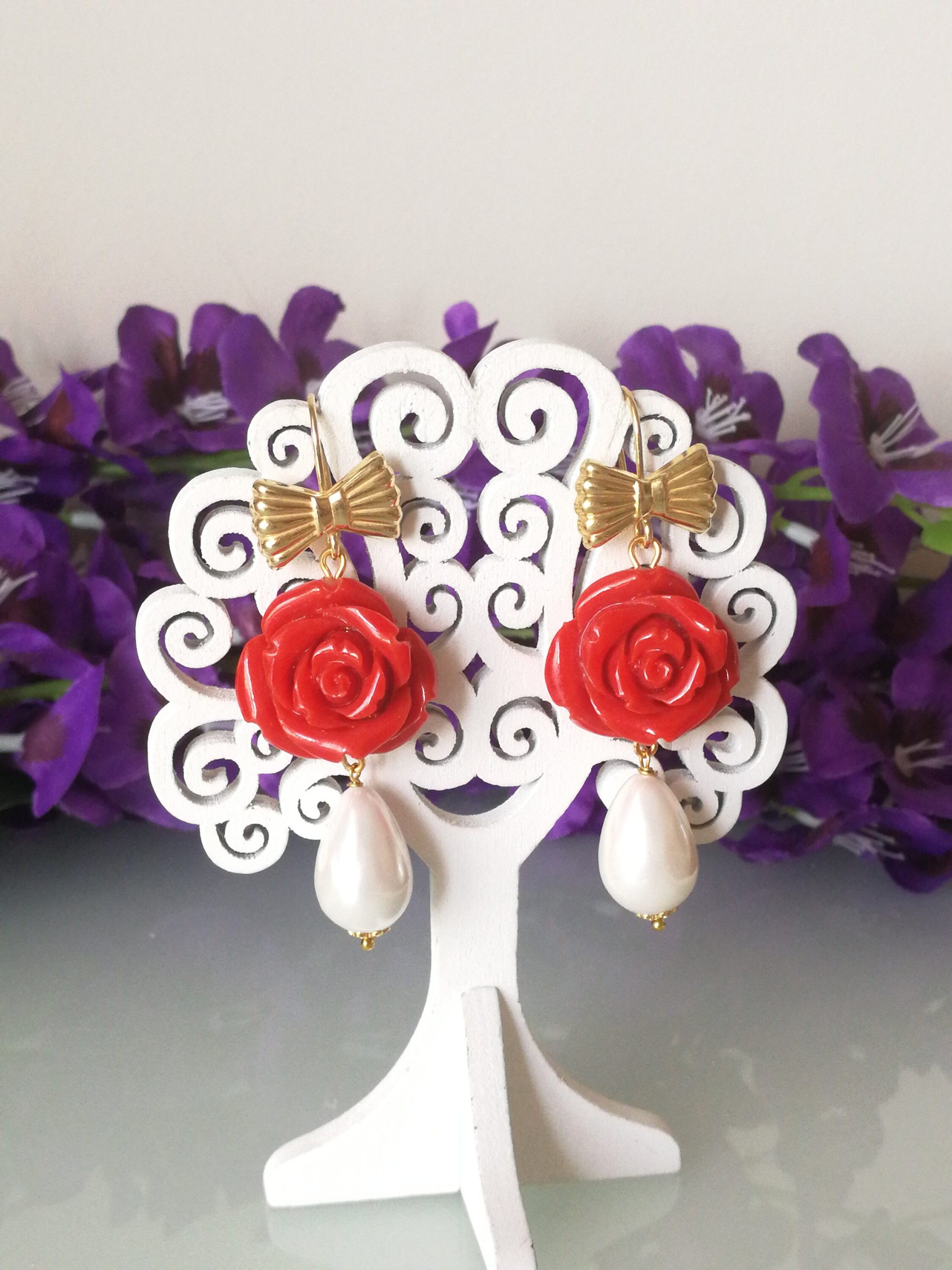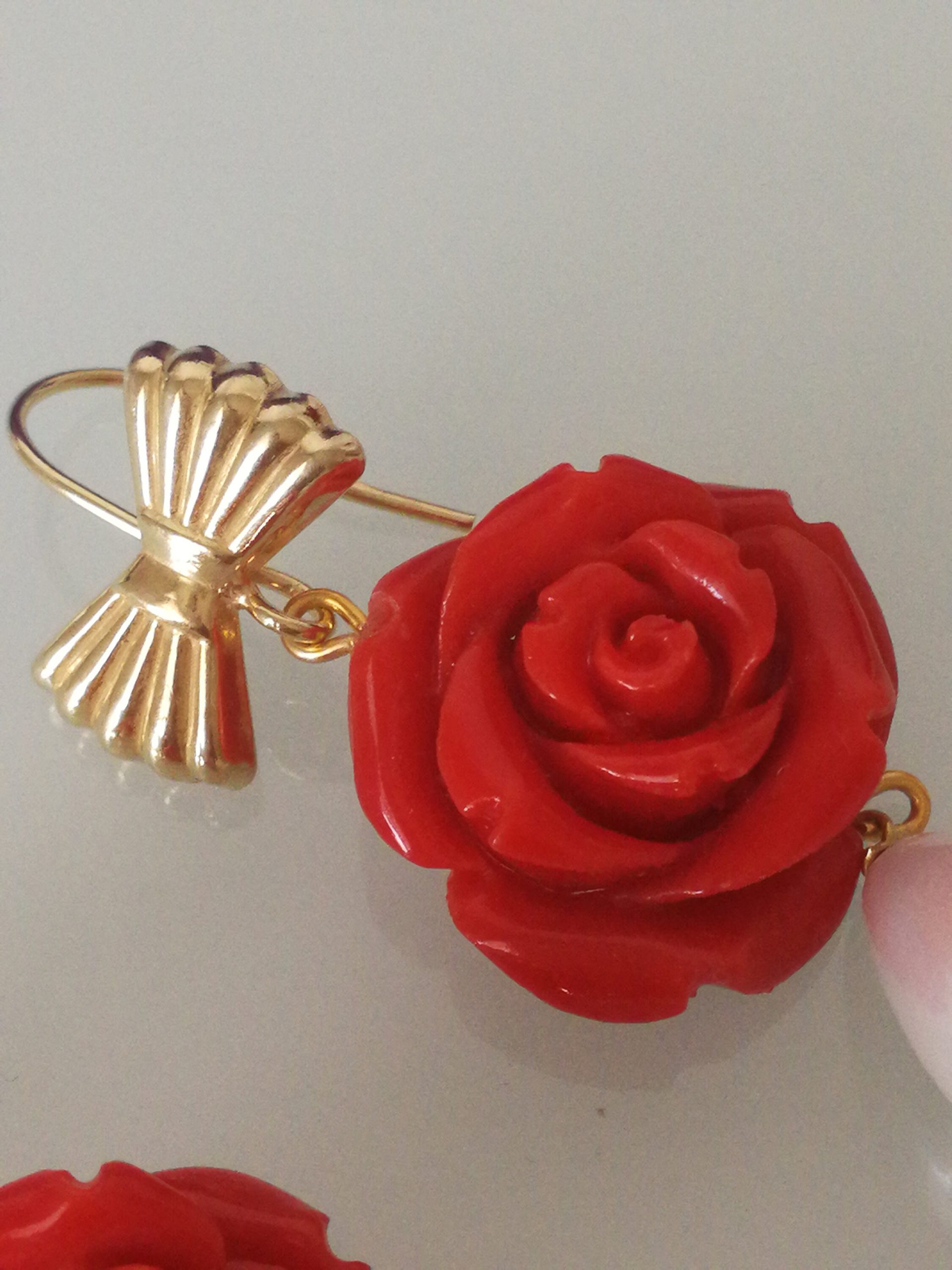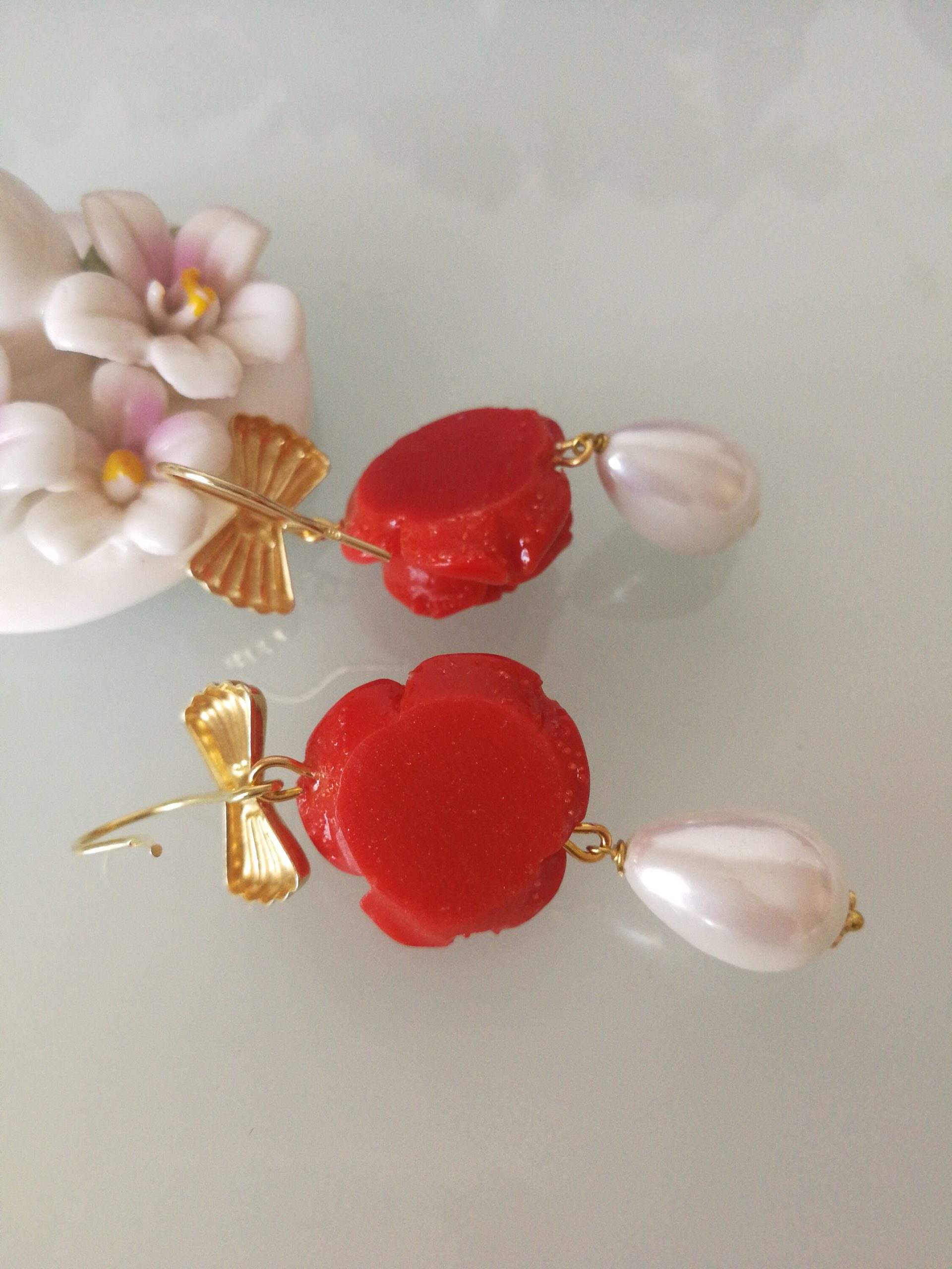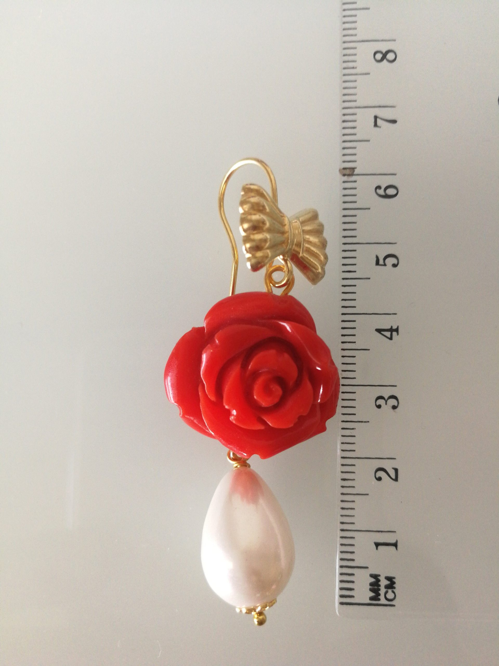 Eleganti orecchini a forma di rosa in corallo rosso composto lavorato . Monachella a forma di fiocco in argento placcata oro. Misura della rosa 2 cm.Misura lunghezza 6 cm. Non è corallo naturale.