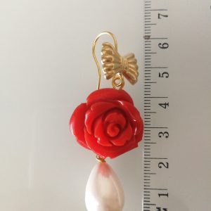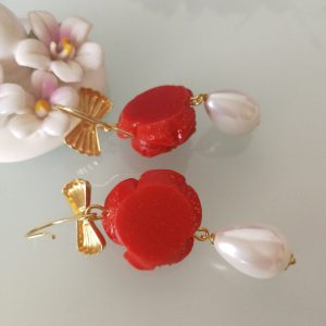 Orecchini rose corallo e perle goccia bianche , orecchini argento, gioielli italiani