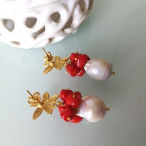 Orecchini perla naturale barocca e corallo rosso naturale .