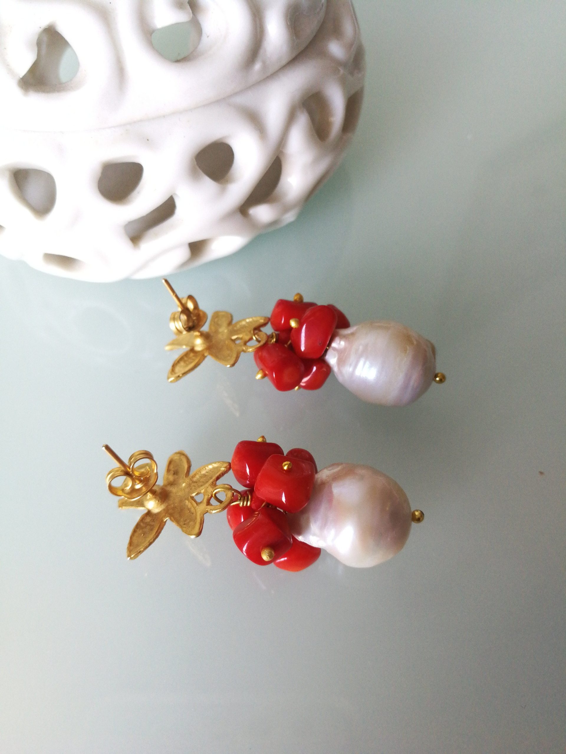 Orecchini corallo rosso naturale e perle barocche bianche , gioielli italiani