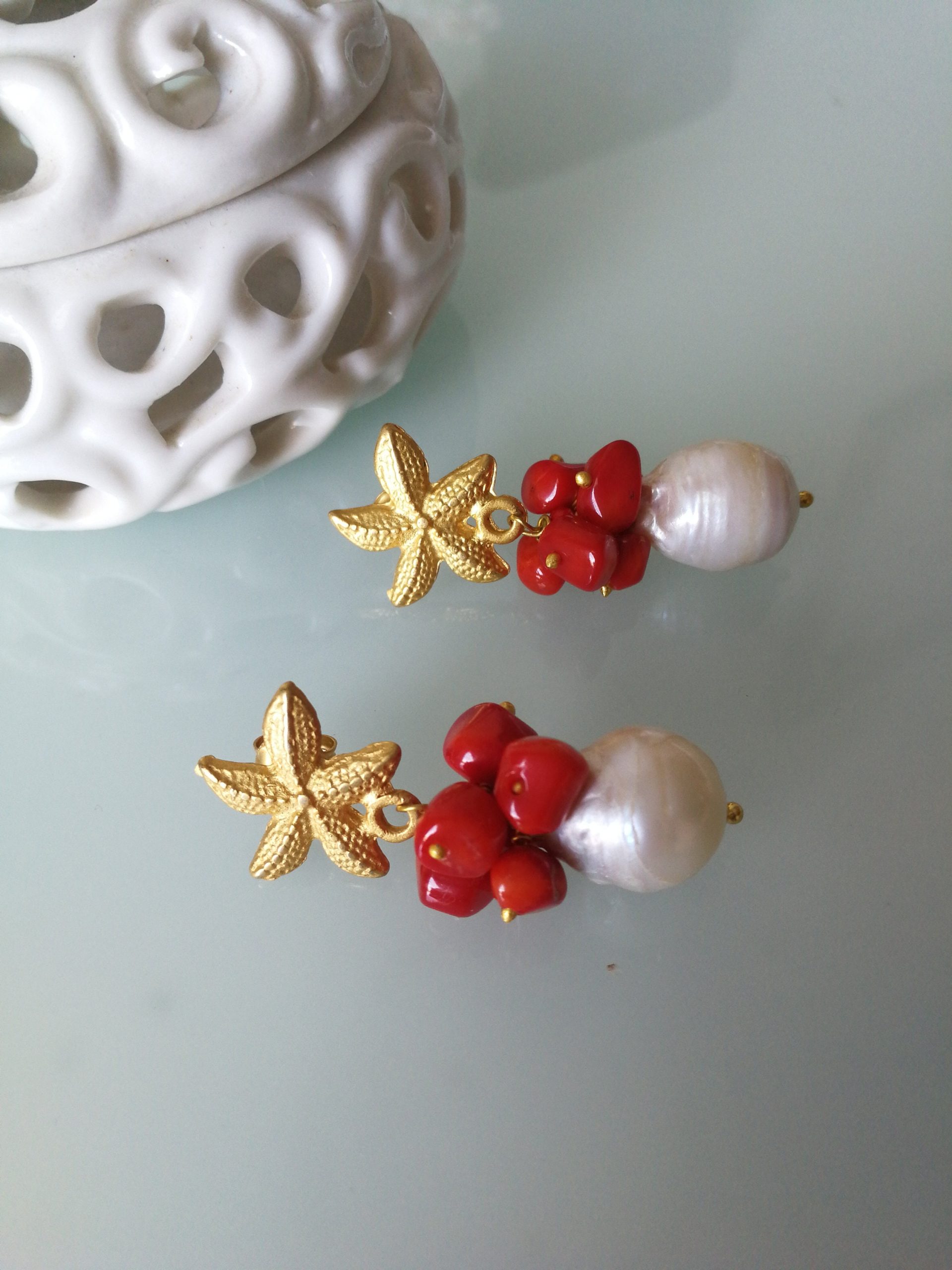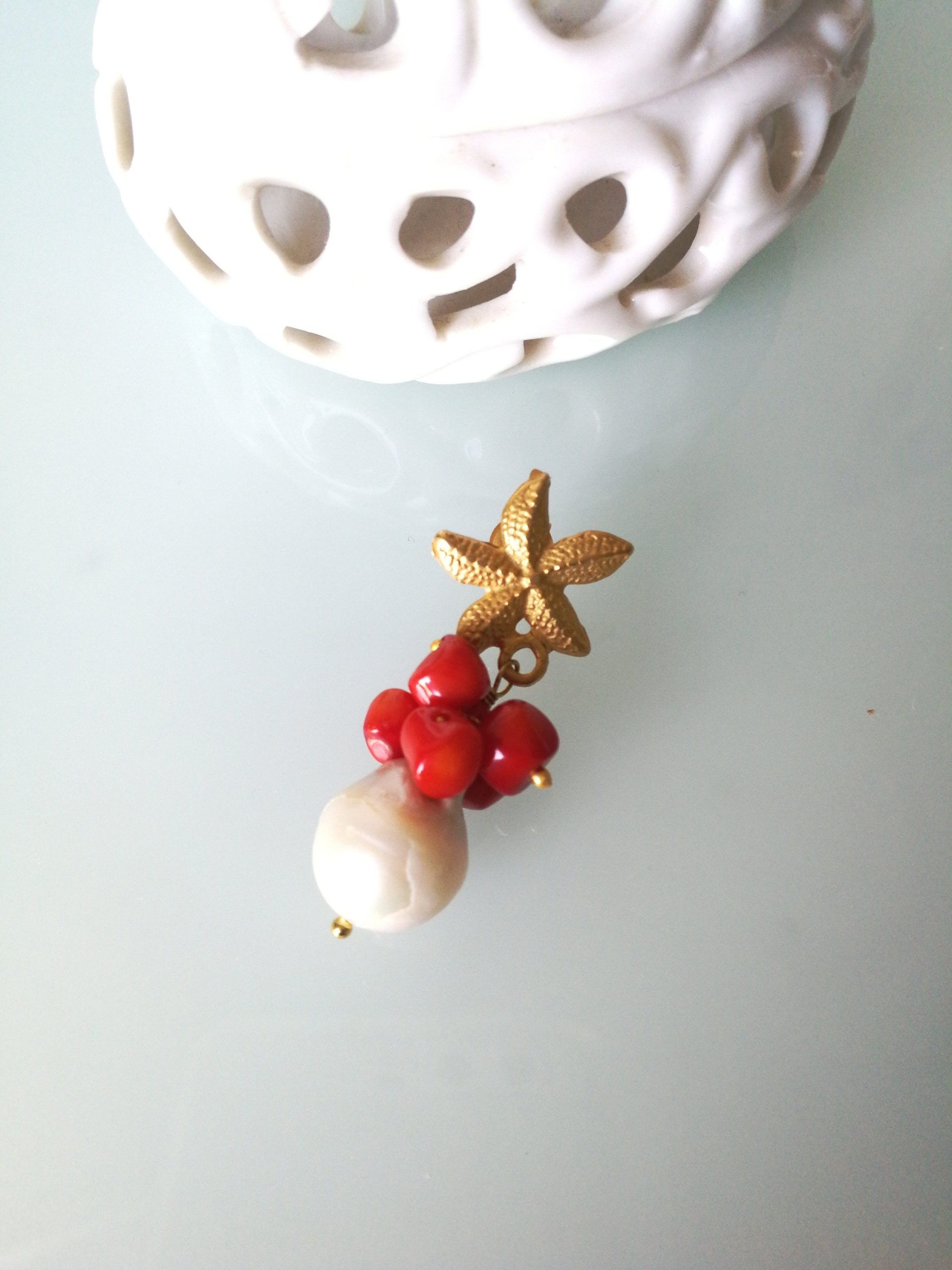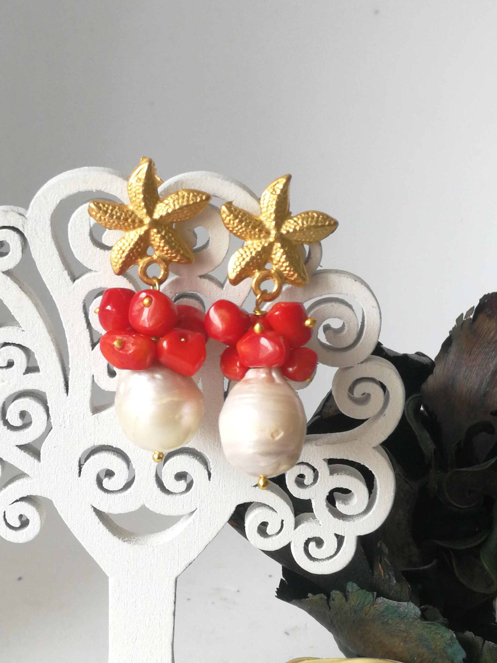 Orecchini estate con perla naturale barocca bianca,corallo rosso naturale , monachella a forma di stella in ottone satinato. Misura lunghezza 4 cm