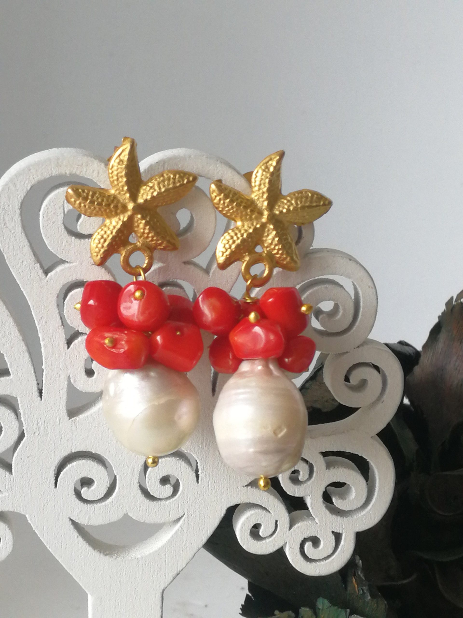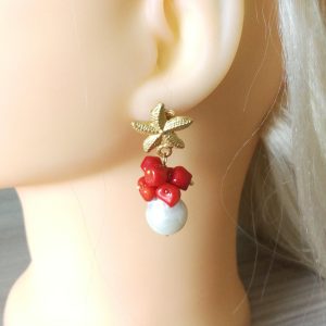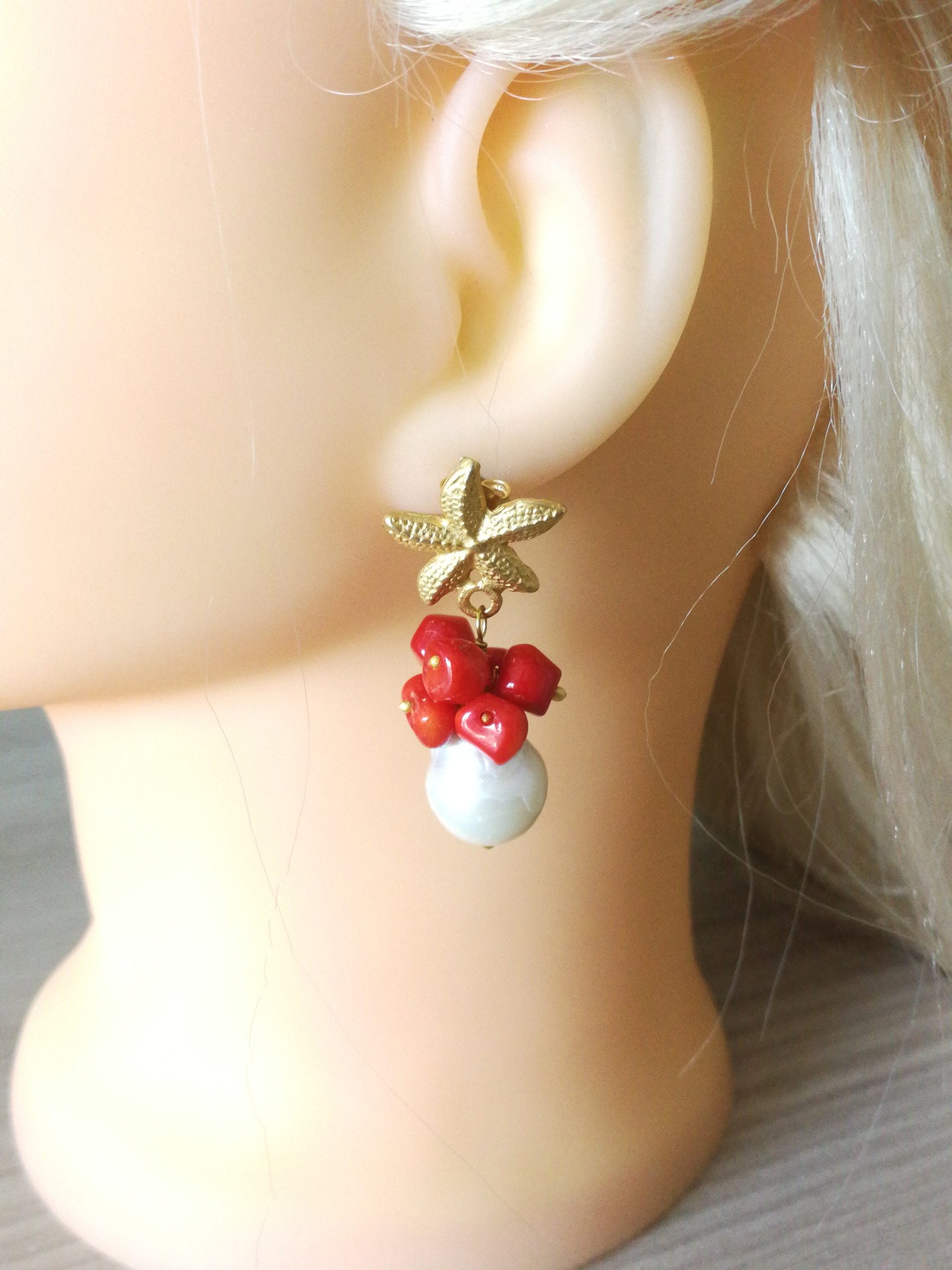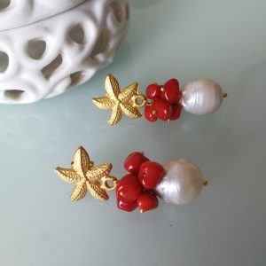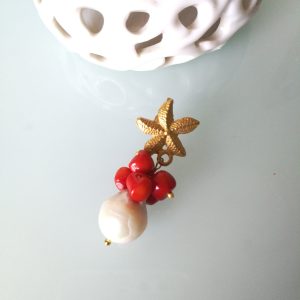 Orecchini estate con perla naturale barocca bianca,corallo rosso naturale , monachella a forma di stella in ottone satinato. Misura lunghezza 4 cm