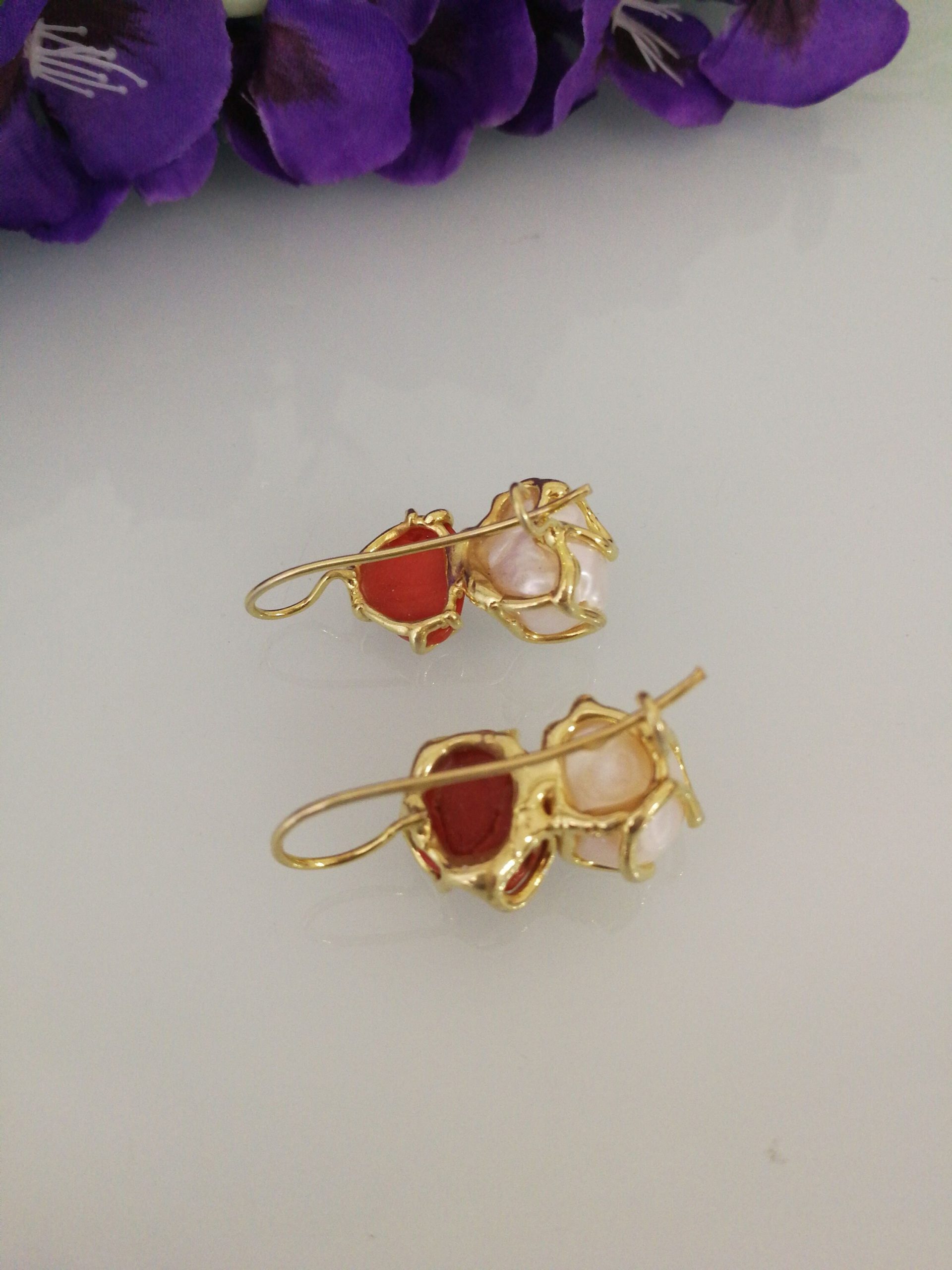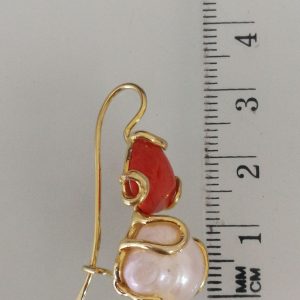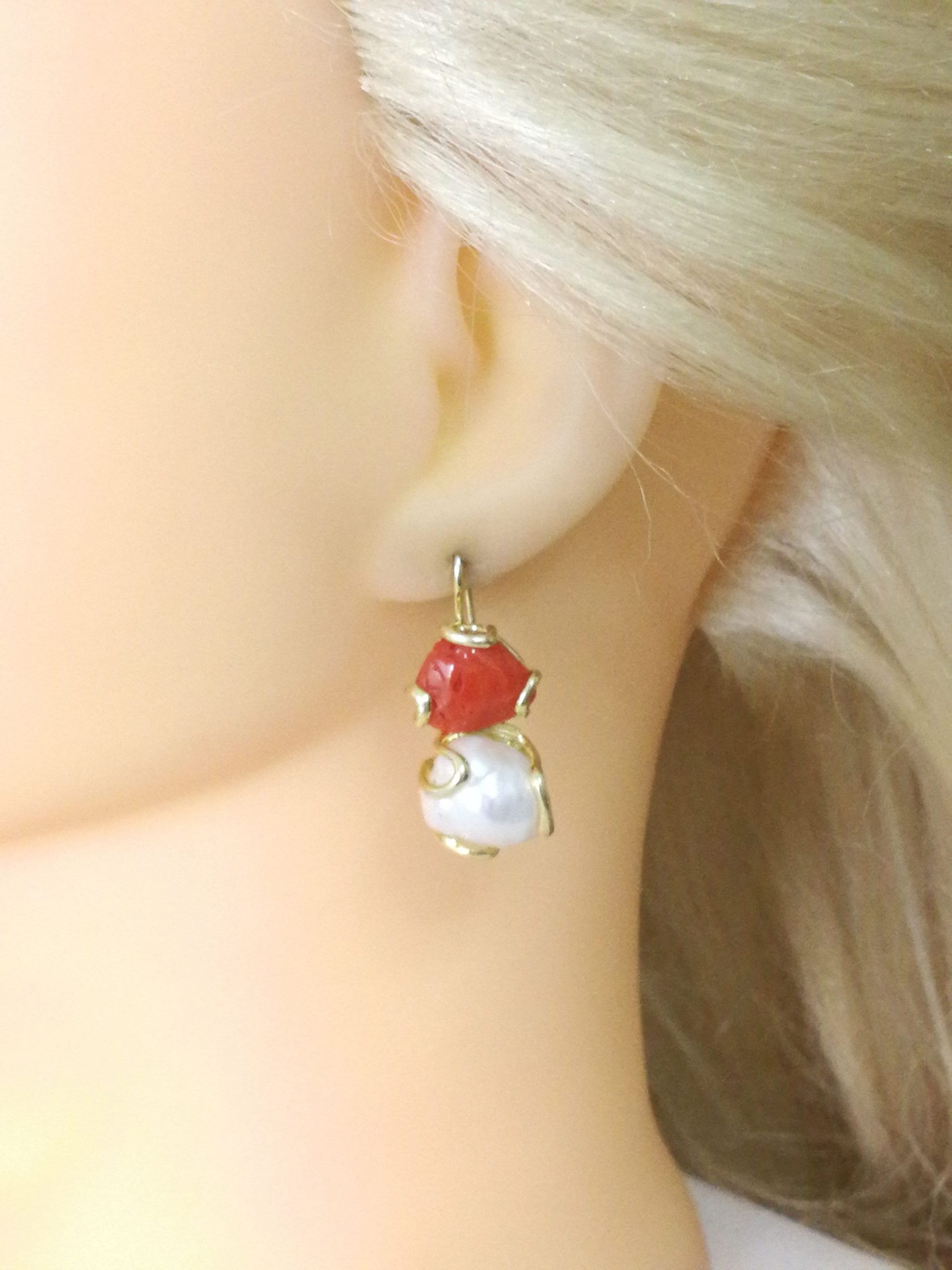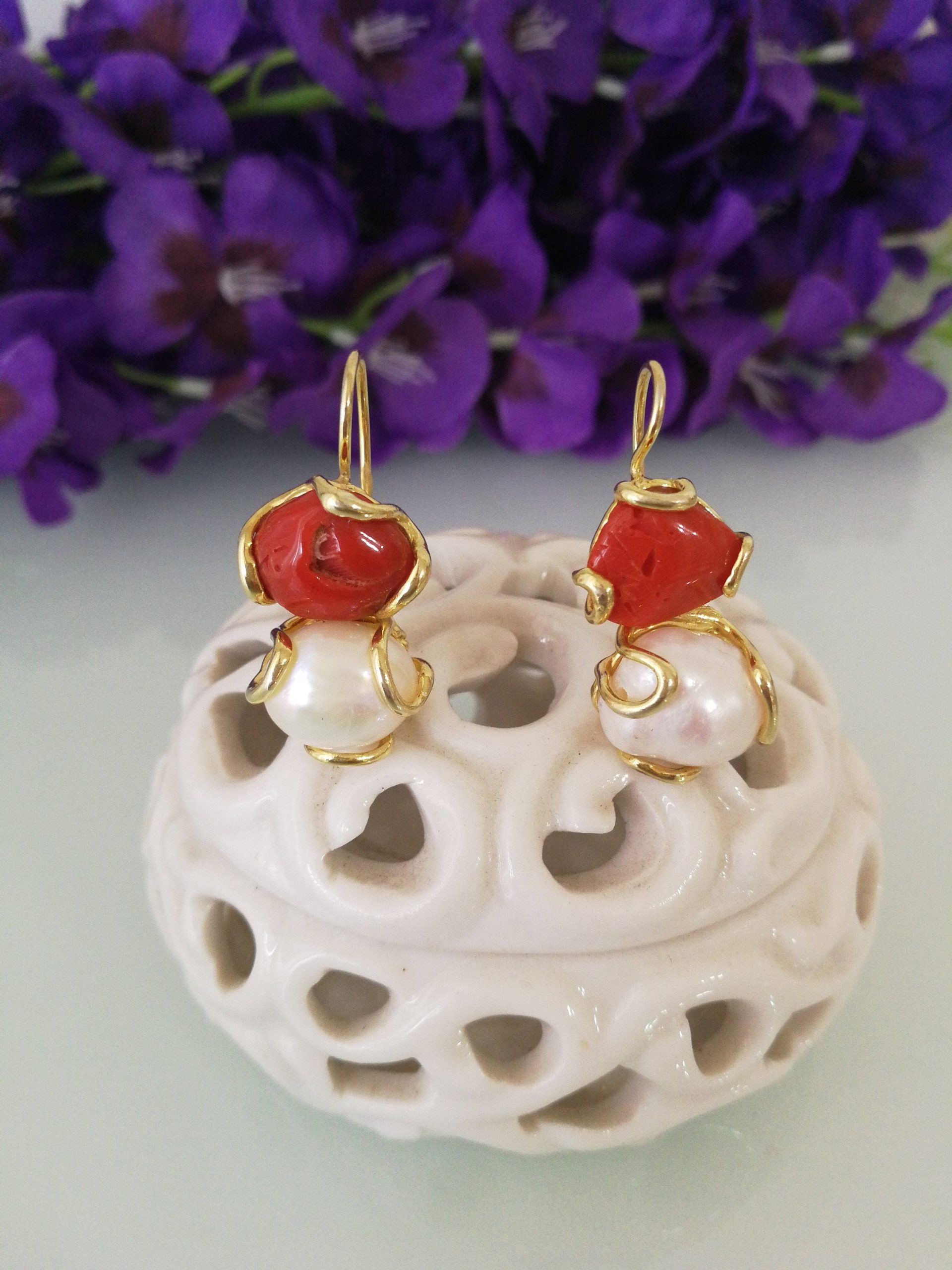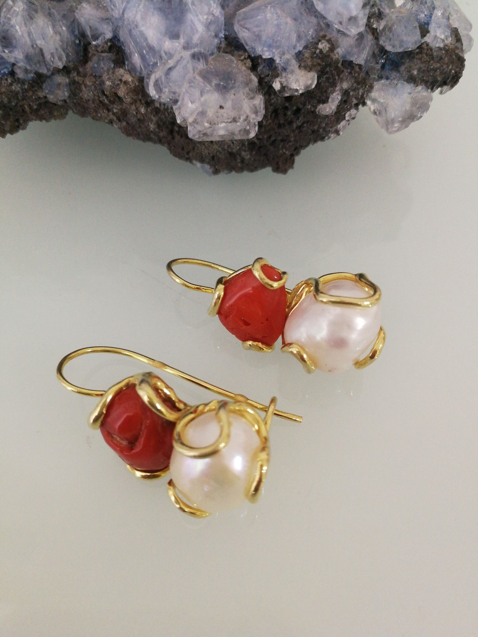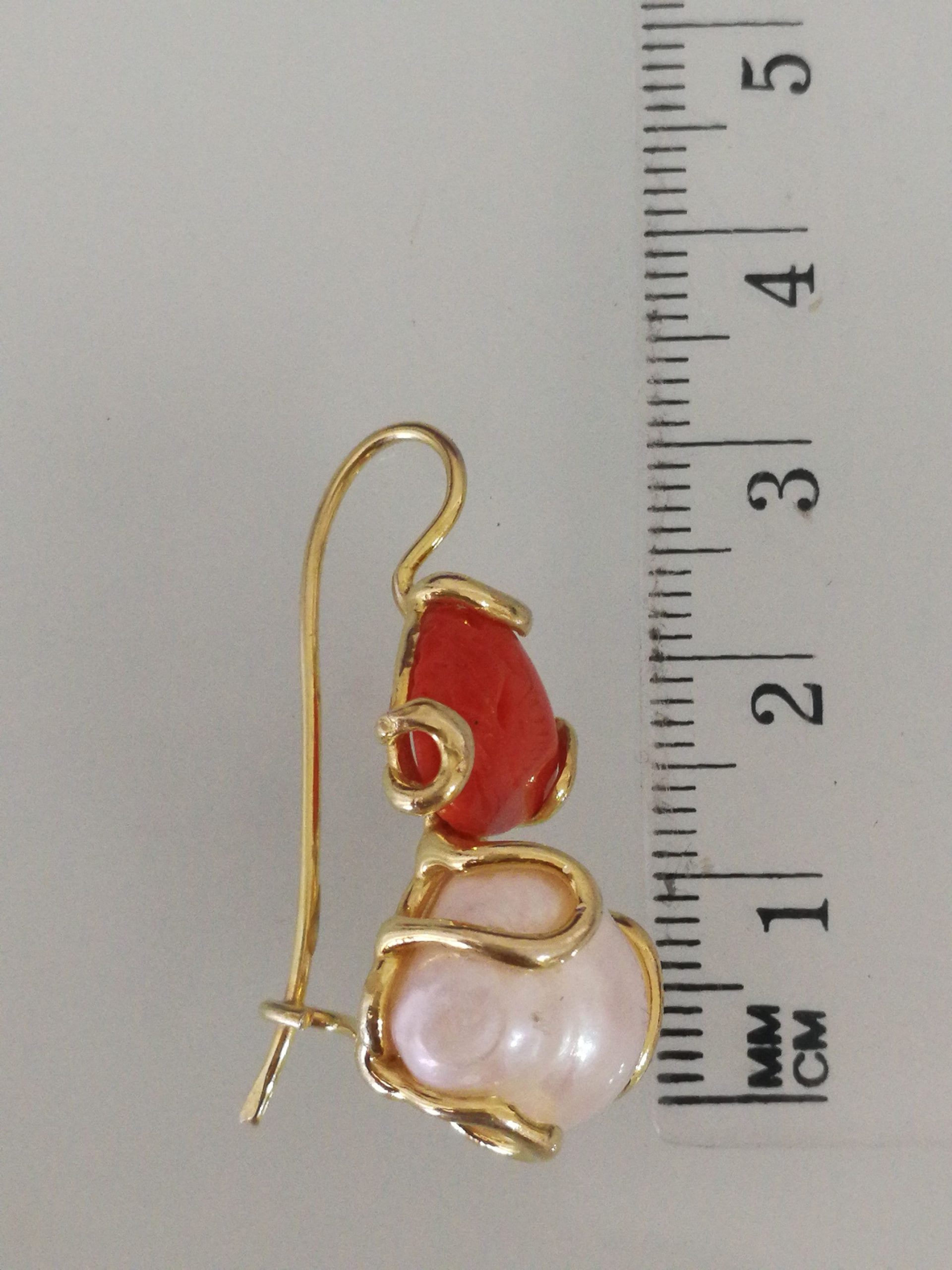 Eleganti orecchini con perla naturale barocca bianca e corallo rosso naturale del mediterraneo , montatura in argento placcata oro a lavorazione artigianale. Misura lunghezza 3 cm.