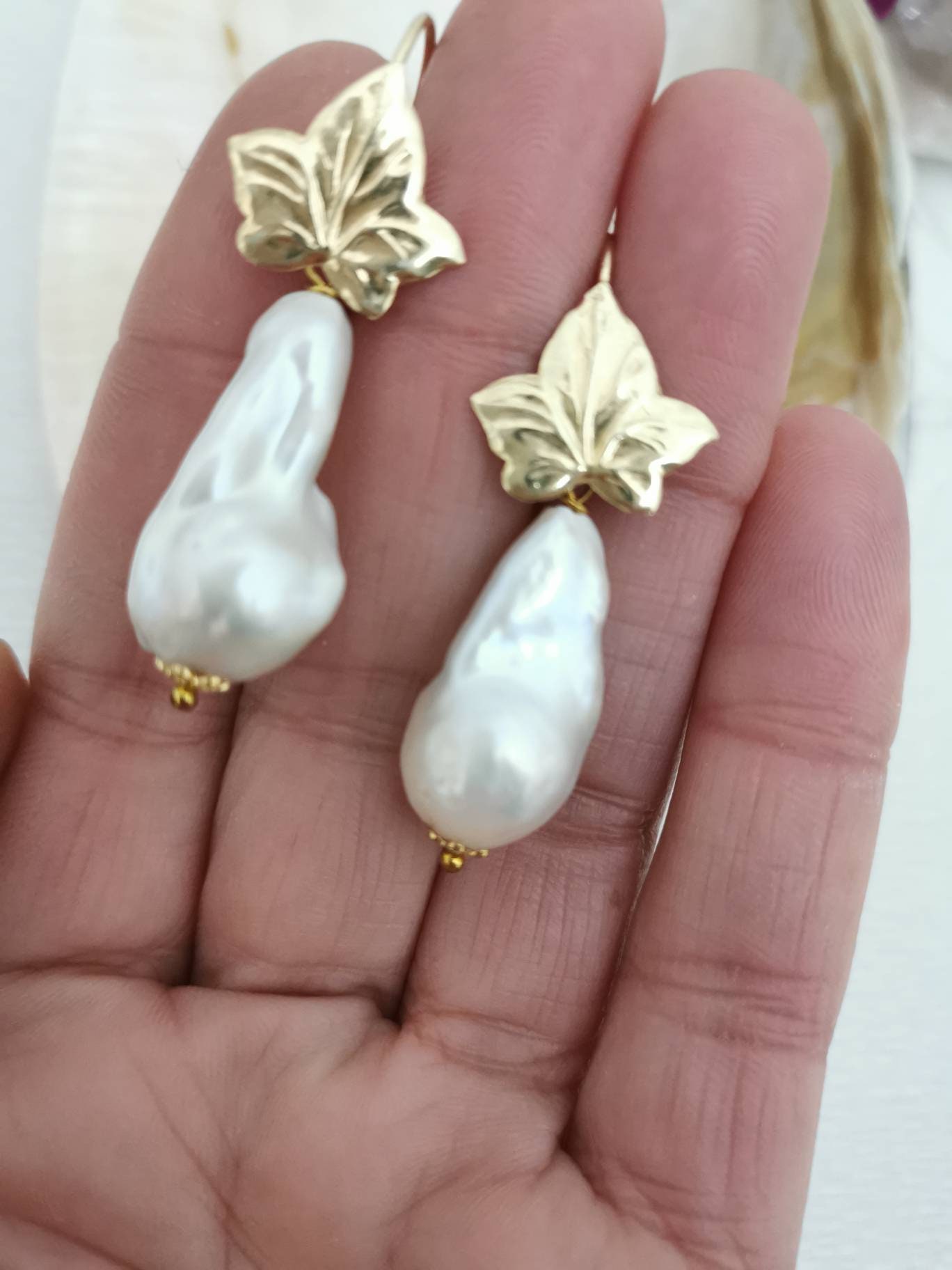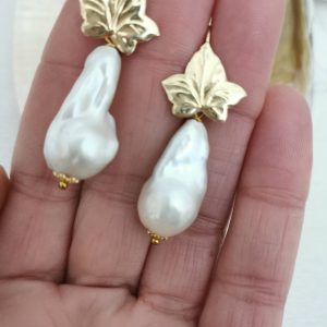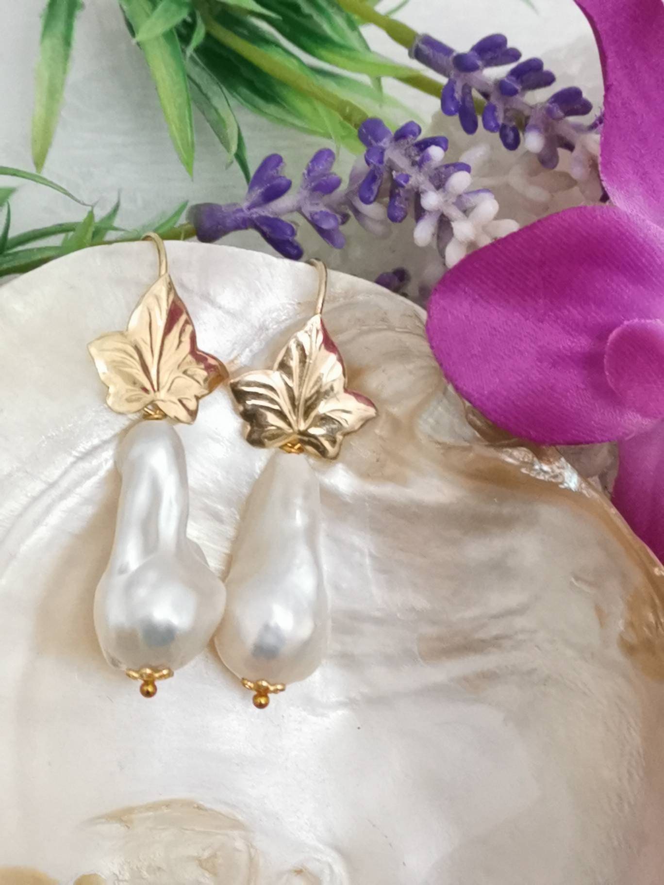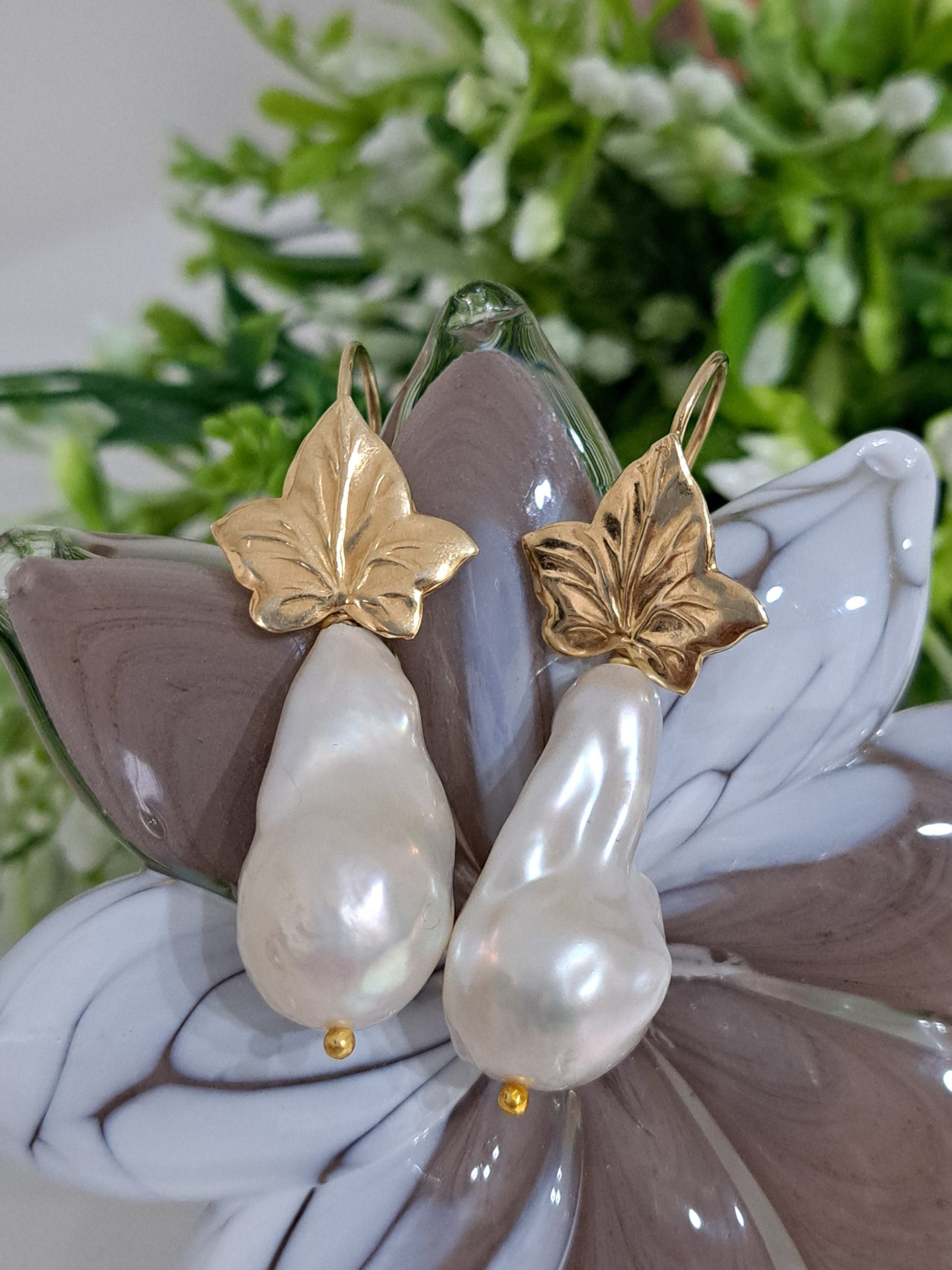 Orecchini pendenti con perle barocche bianche , chiusura monachelle a forma di foglie in argento 925 placcato oro , lunghezza totale 5 cm