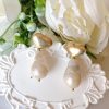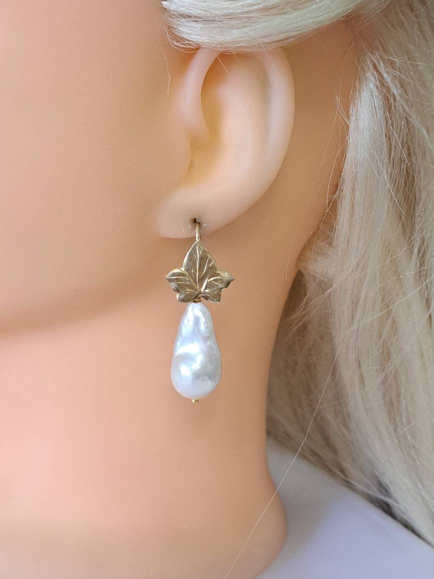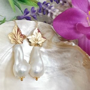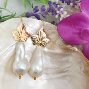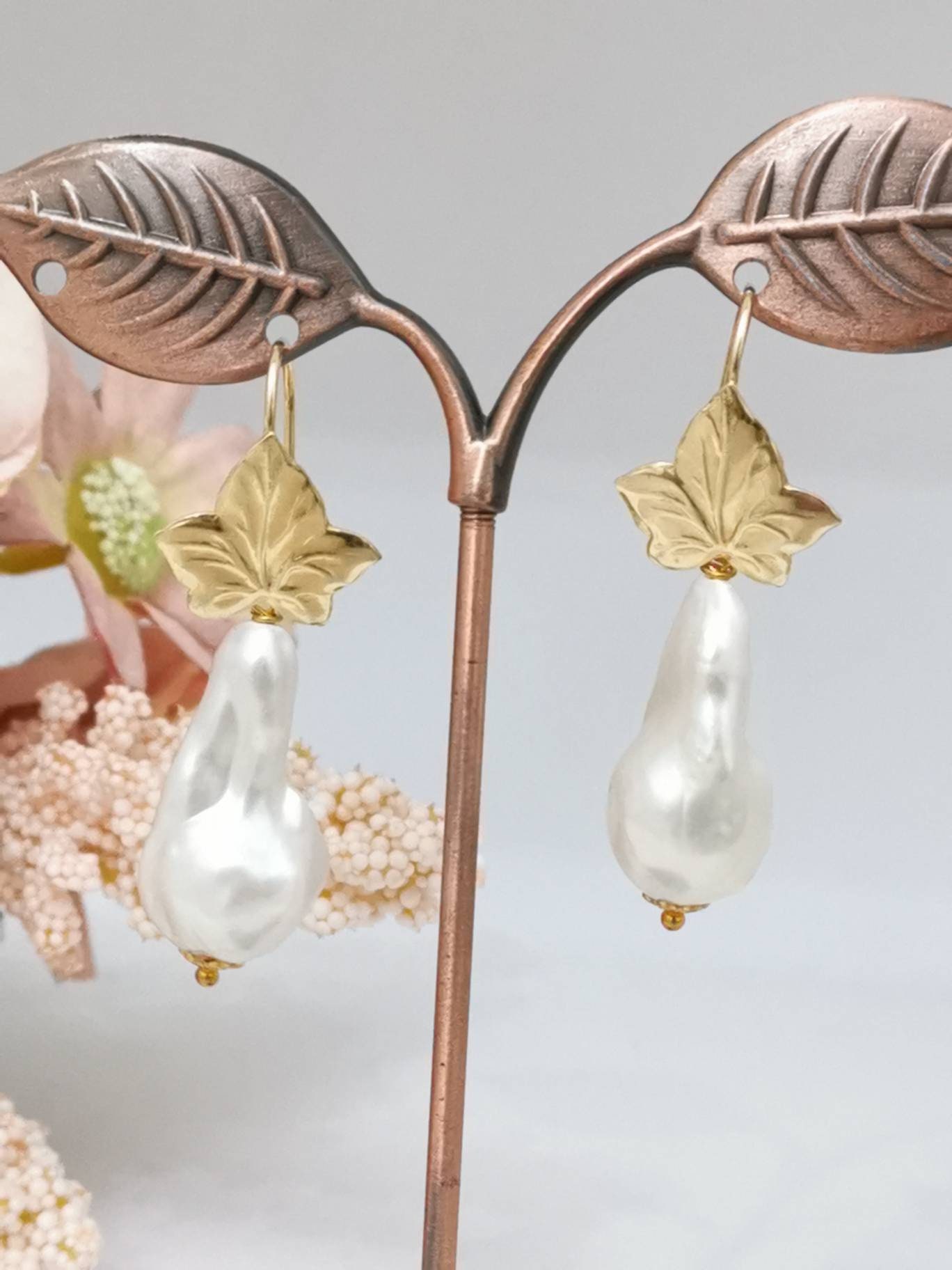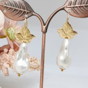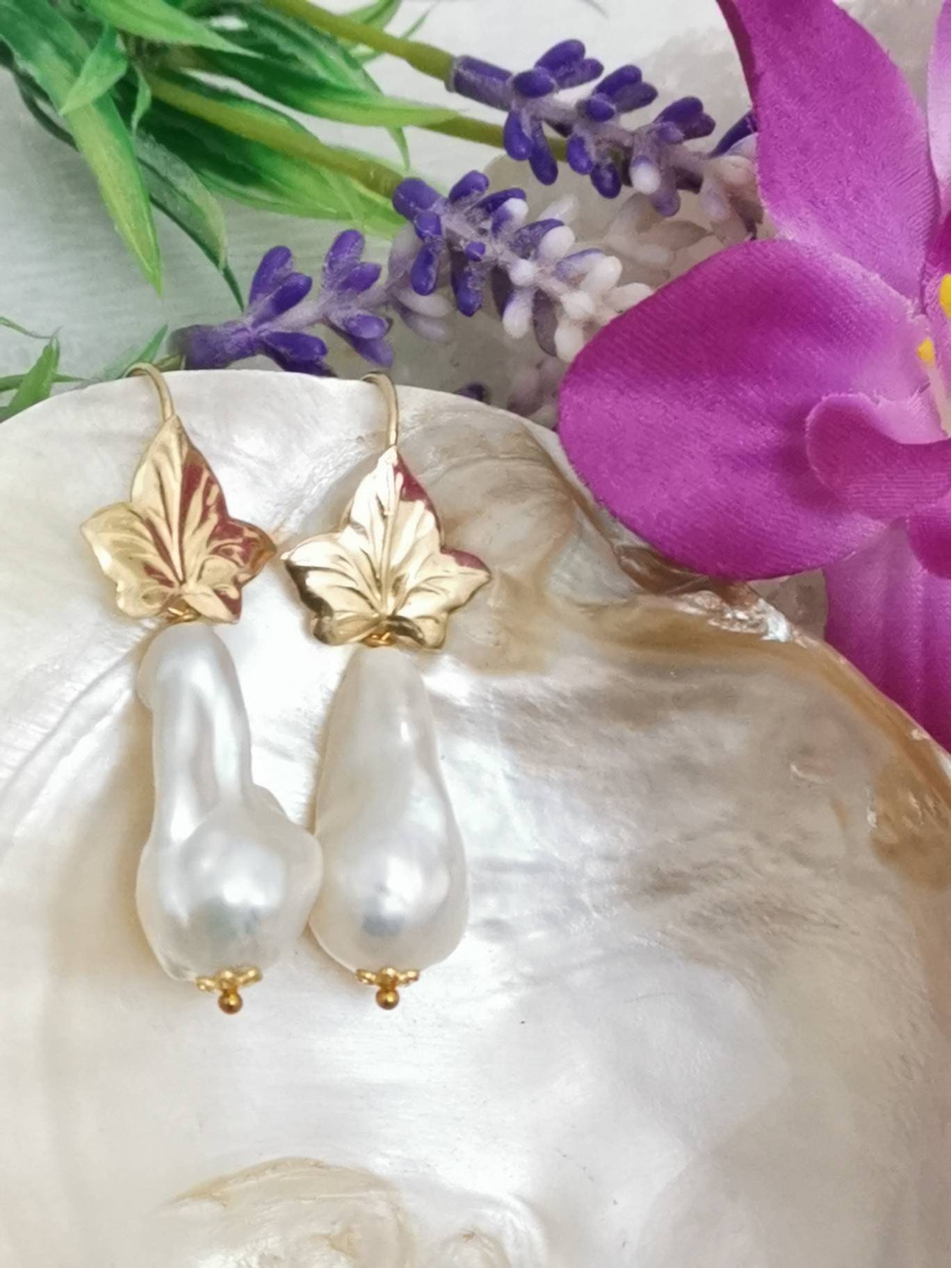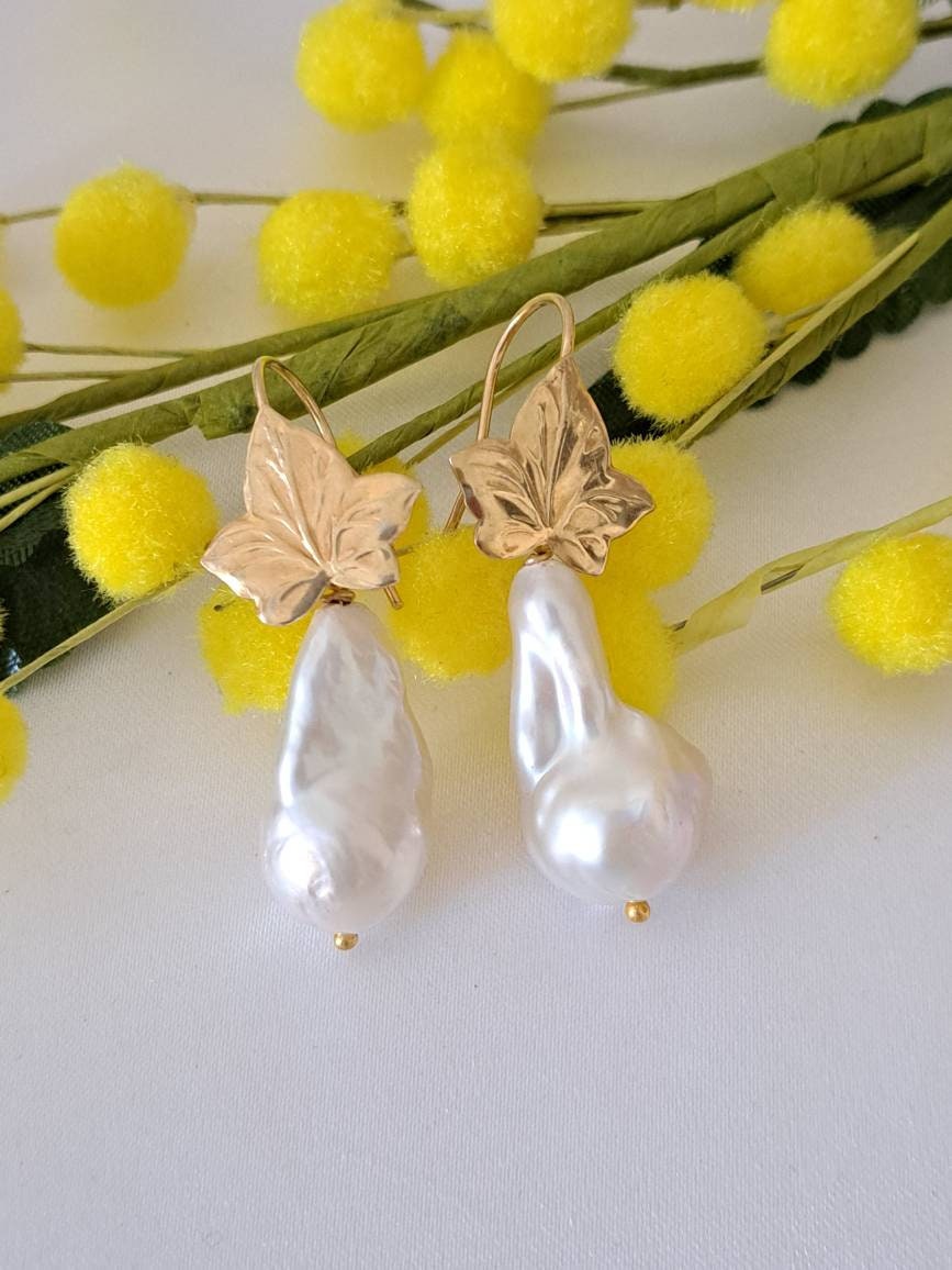 Orecchini pendenti con perle barocche bianche , chiusura monachelle a forma di foglie in argento 925 placcato oro , lunghezza totale 5 cm