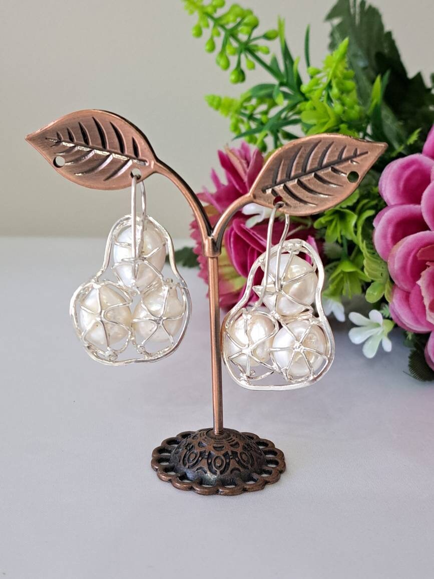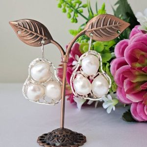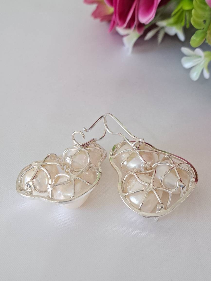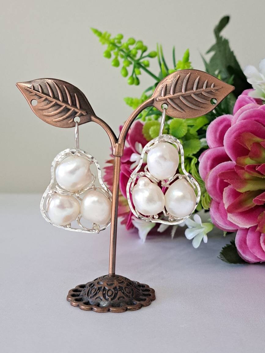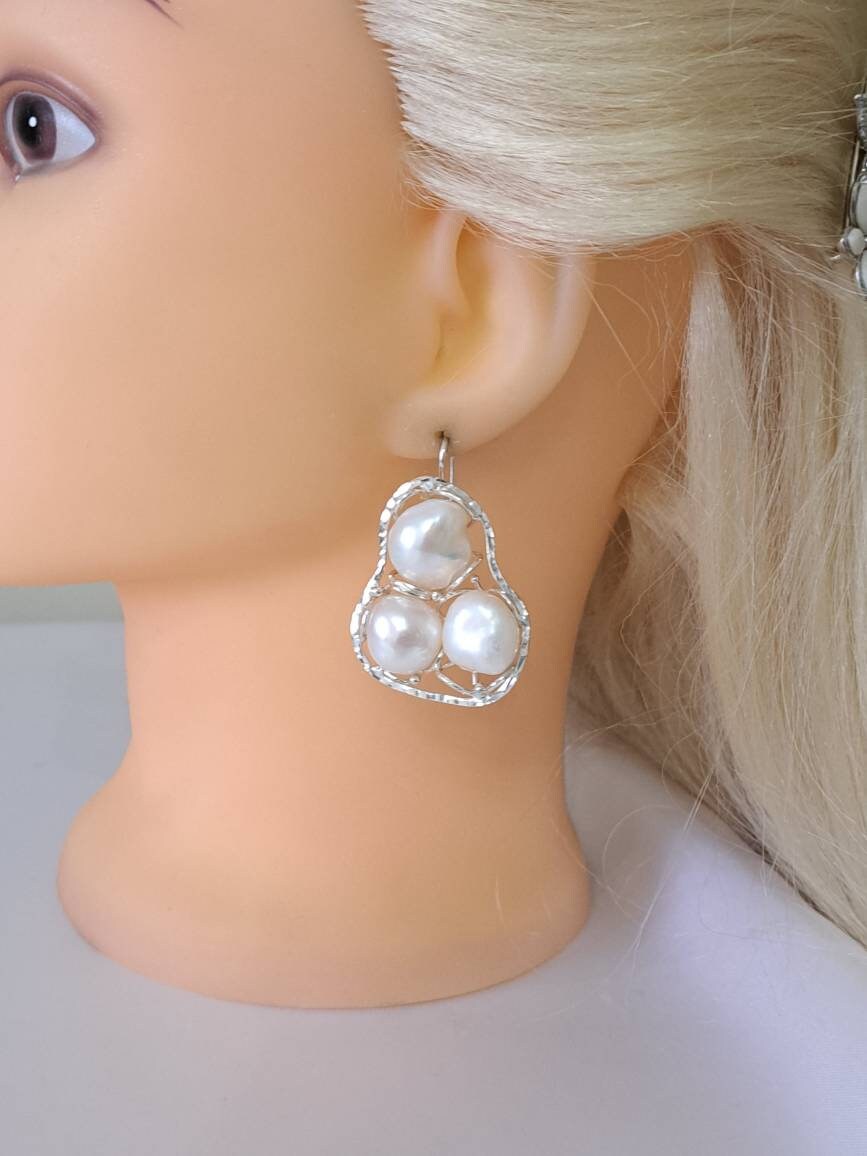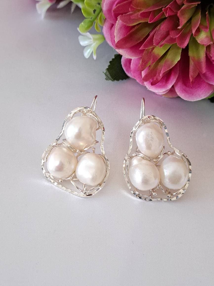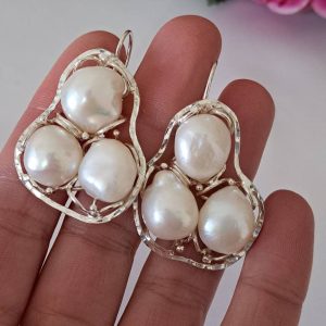 Orecchini maxi artigianali realizzati a mano a Torre del greco con 3 perle barocche bianche incastonate in argento 925, 3,5×3 cm dimensioni, con chiusura a monachella con gancetto.