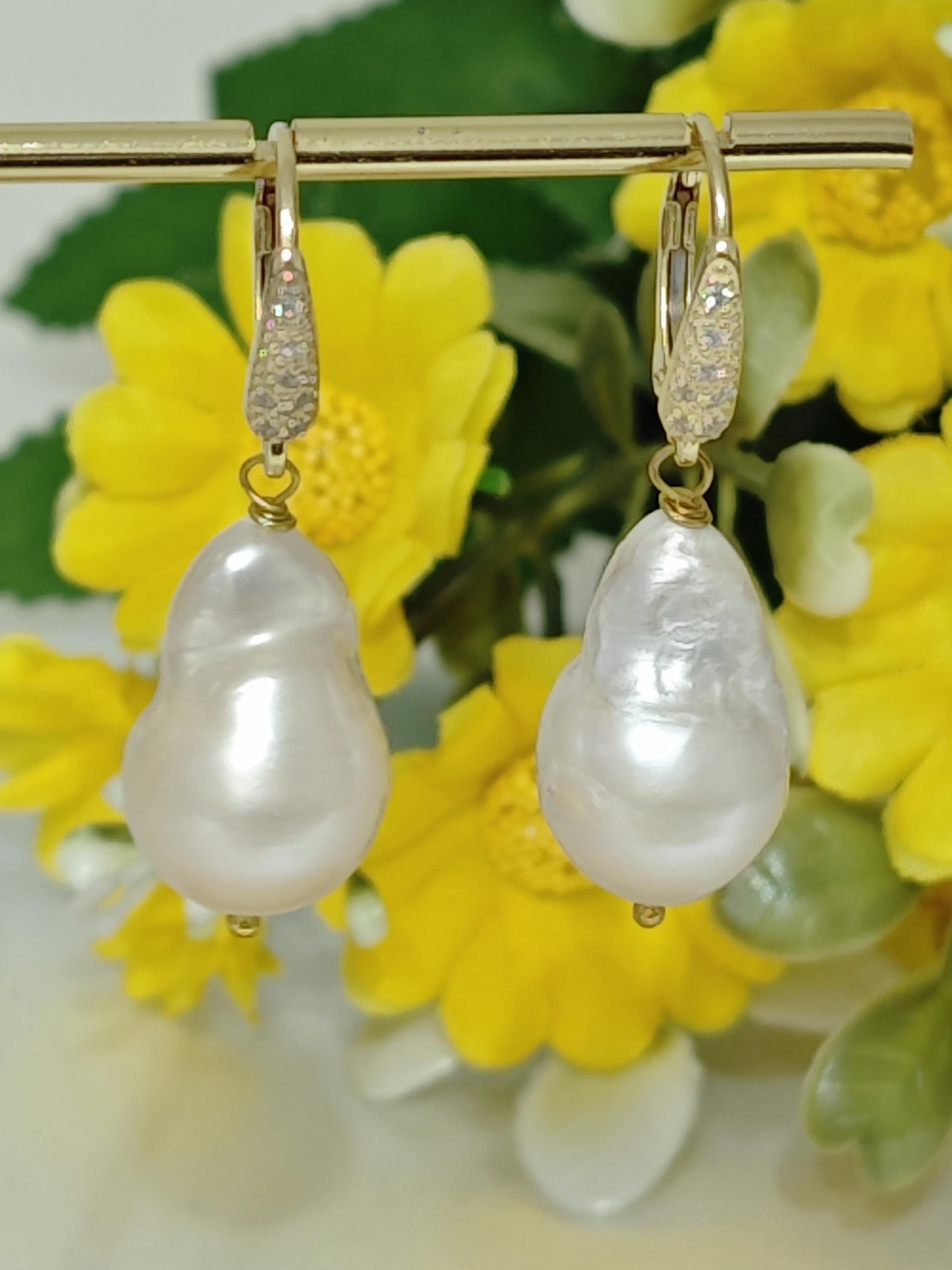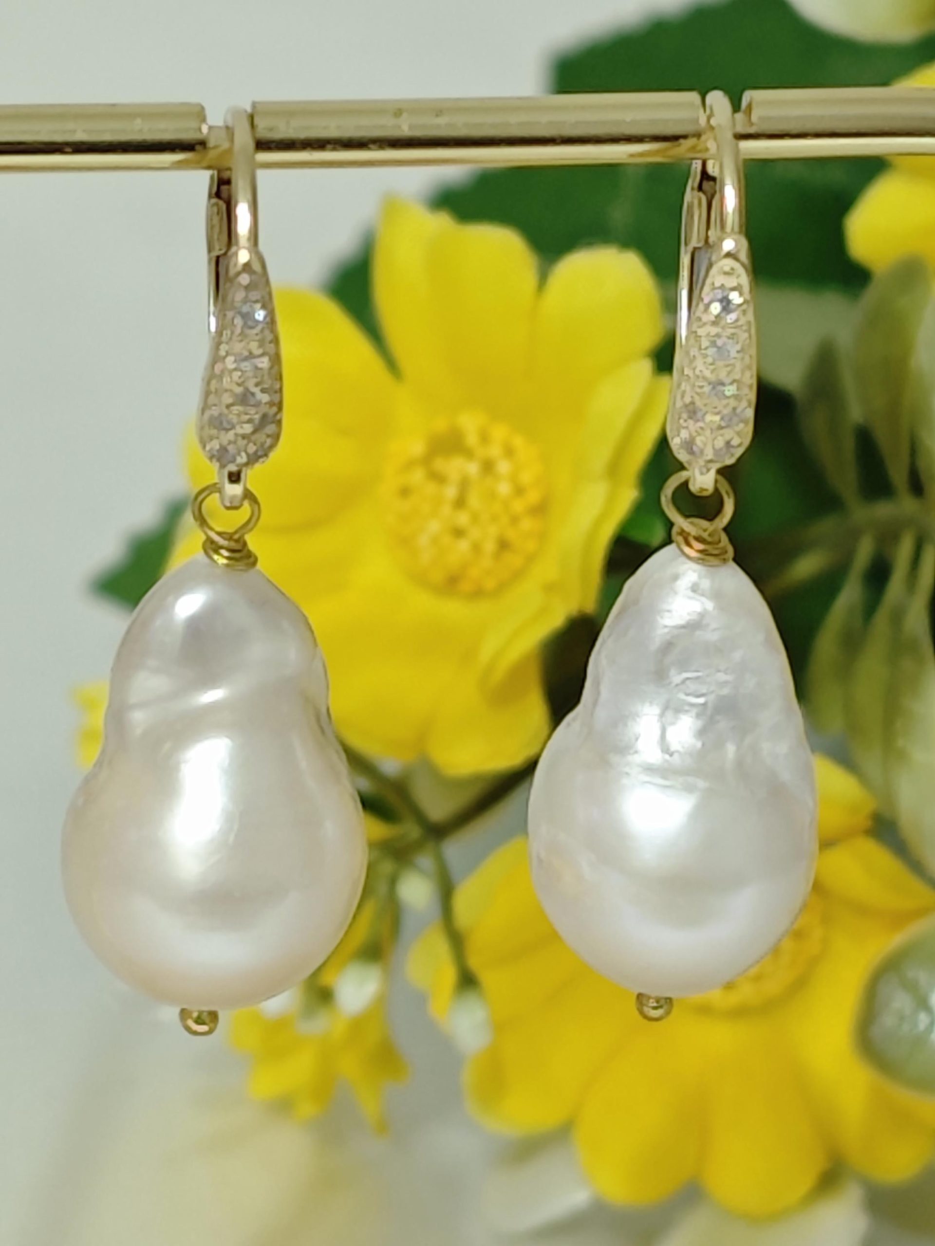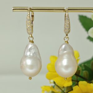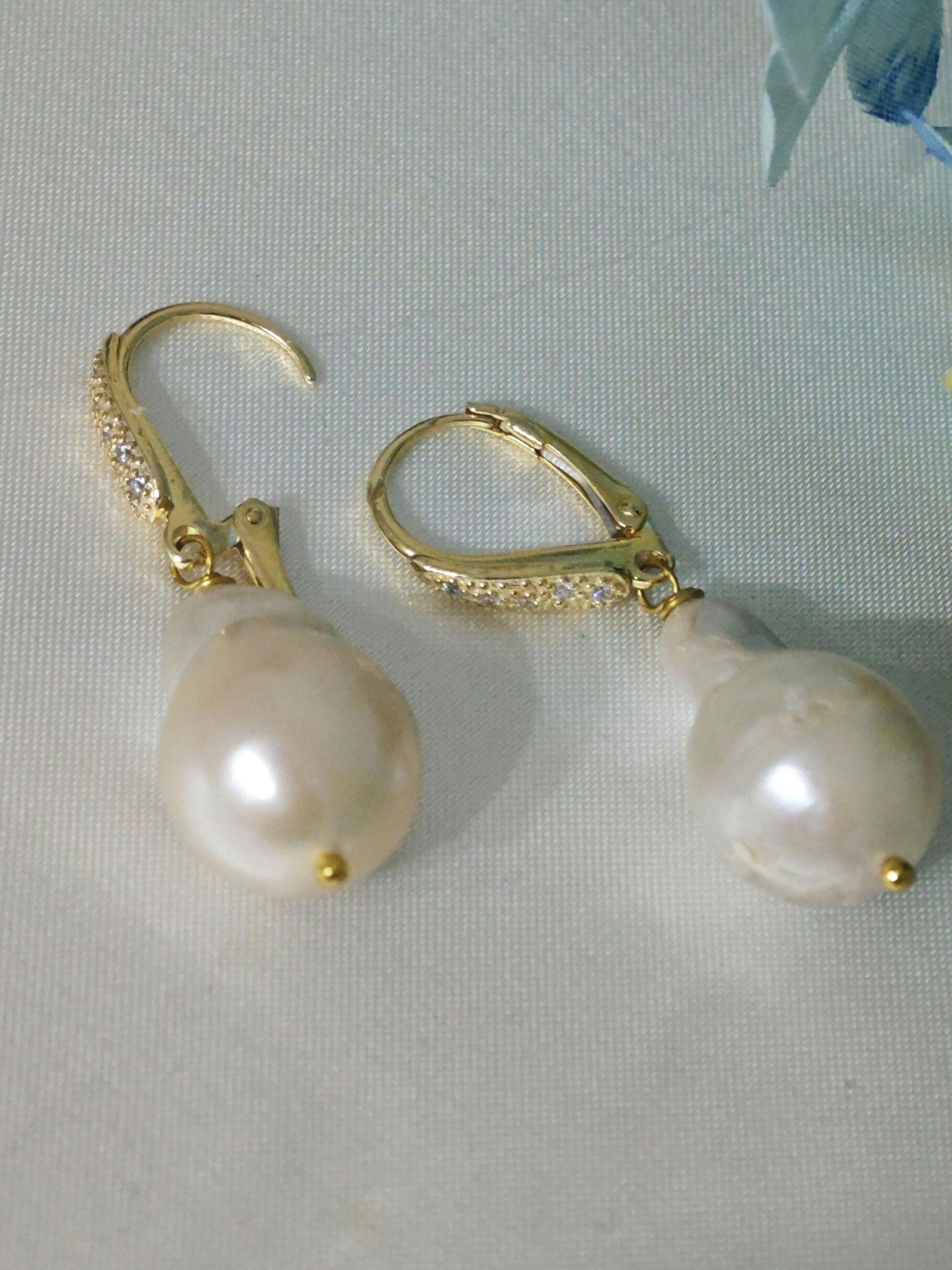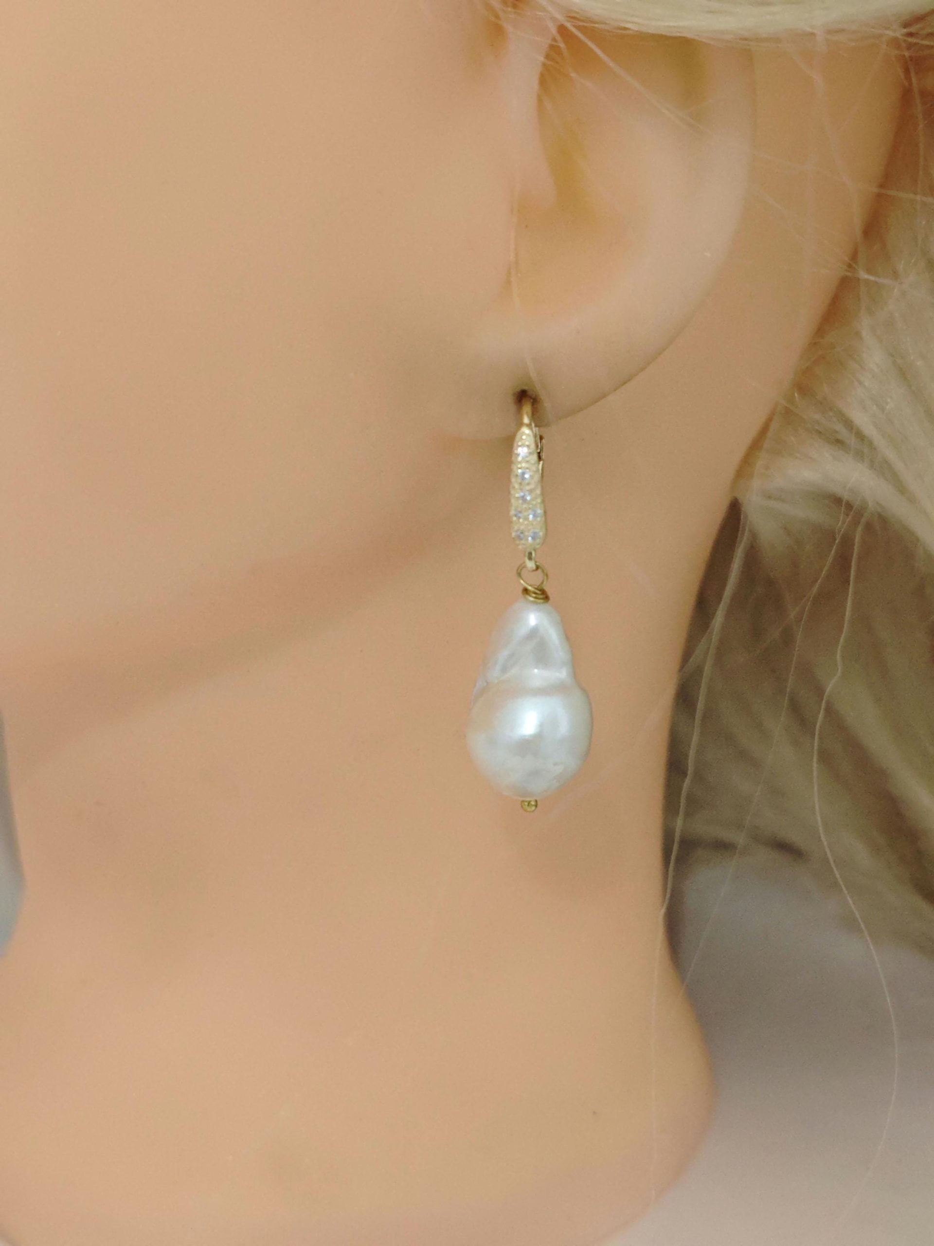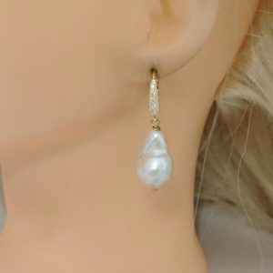 Orecchini pendenti con perle barocche bianche grandi , chiusura a monachelle con leva dietro in argento 925 placcato oro con zirconi.