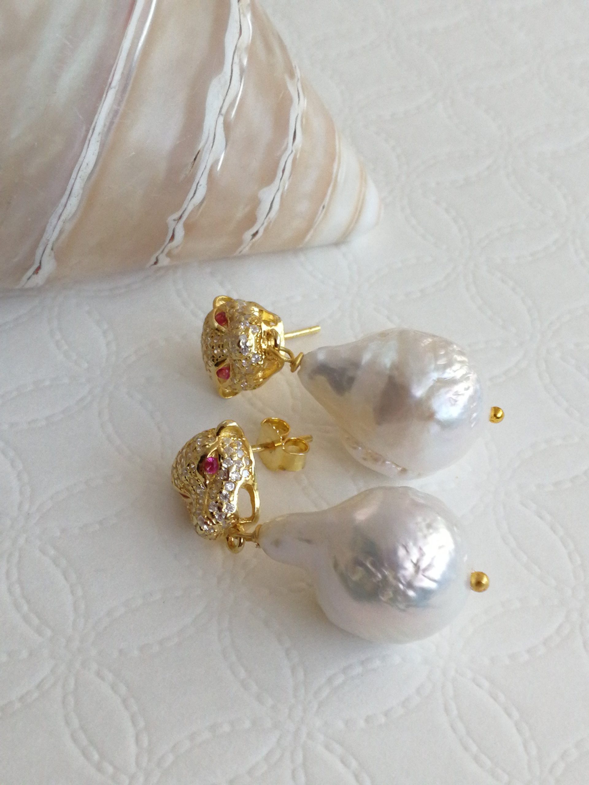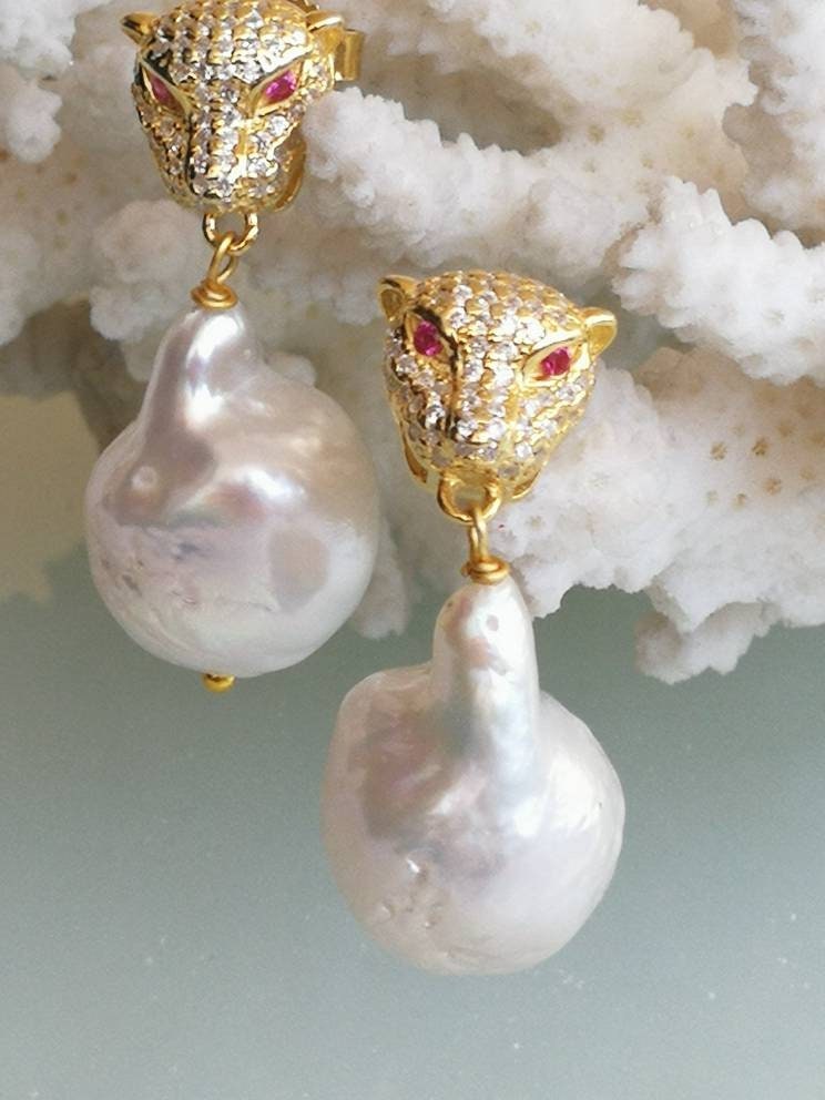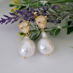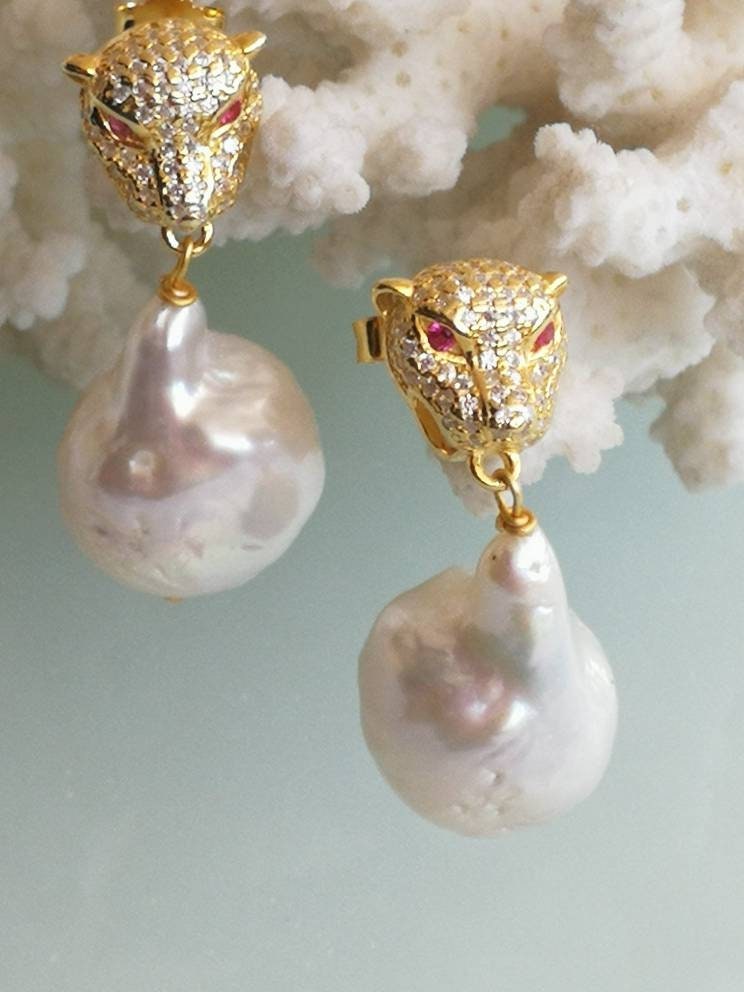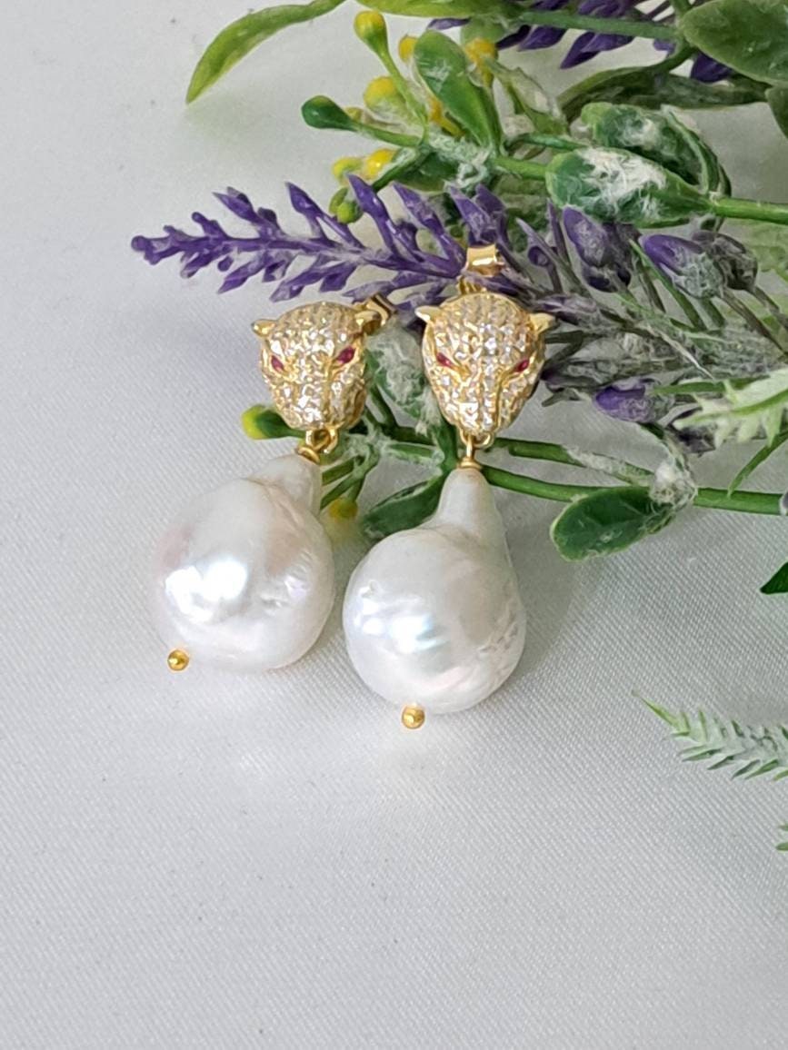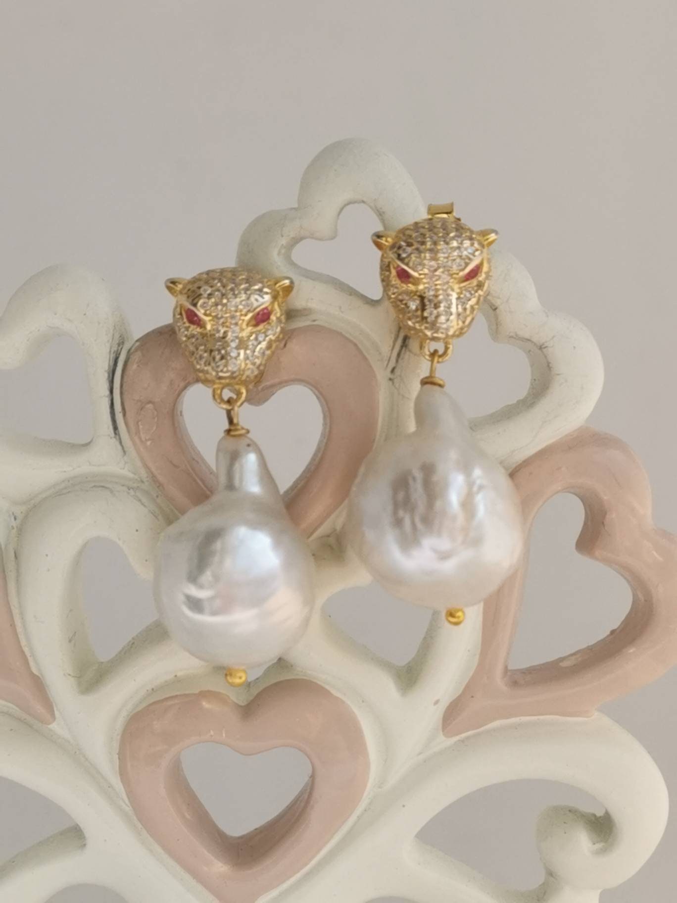 Orecchini pendenti con perle barocche bianche, chiusura a perno in argento 925 placcato oro a forma di testa di leone con zirconi bianchi , lunghezza totale 3,5 cm