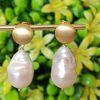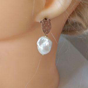 Orecchini pendenti con perle barocche bianche , chiusura monachelle a forma di cactus in argento 925 placcato oro , lunghezza totale 3,5 cm