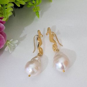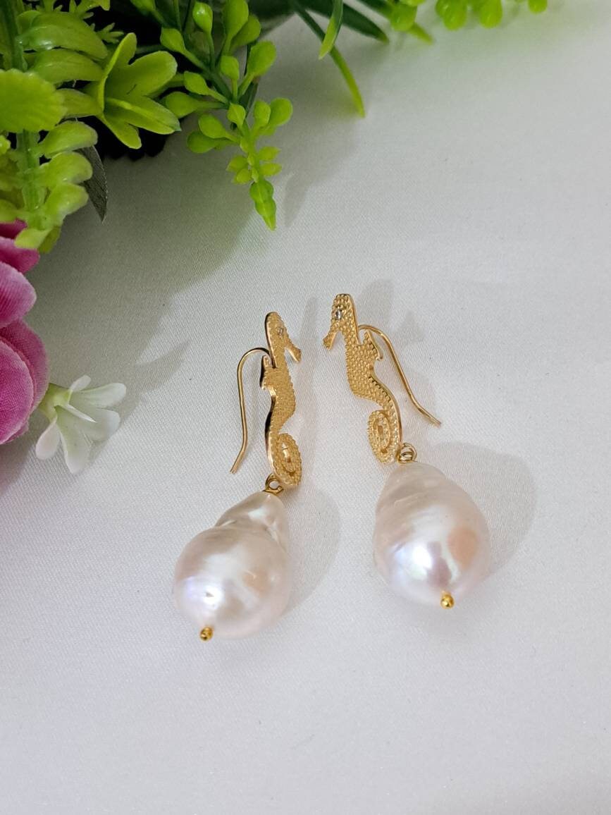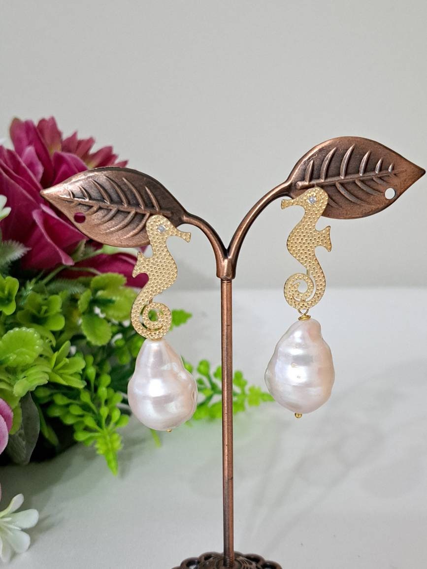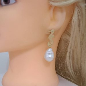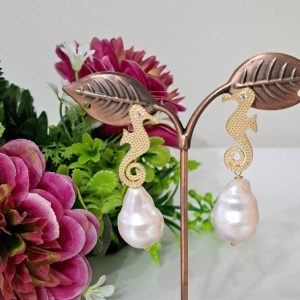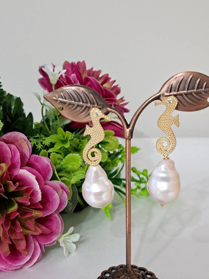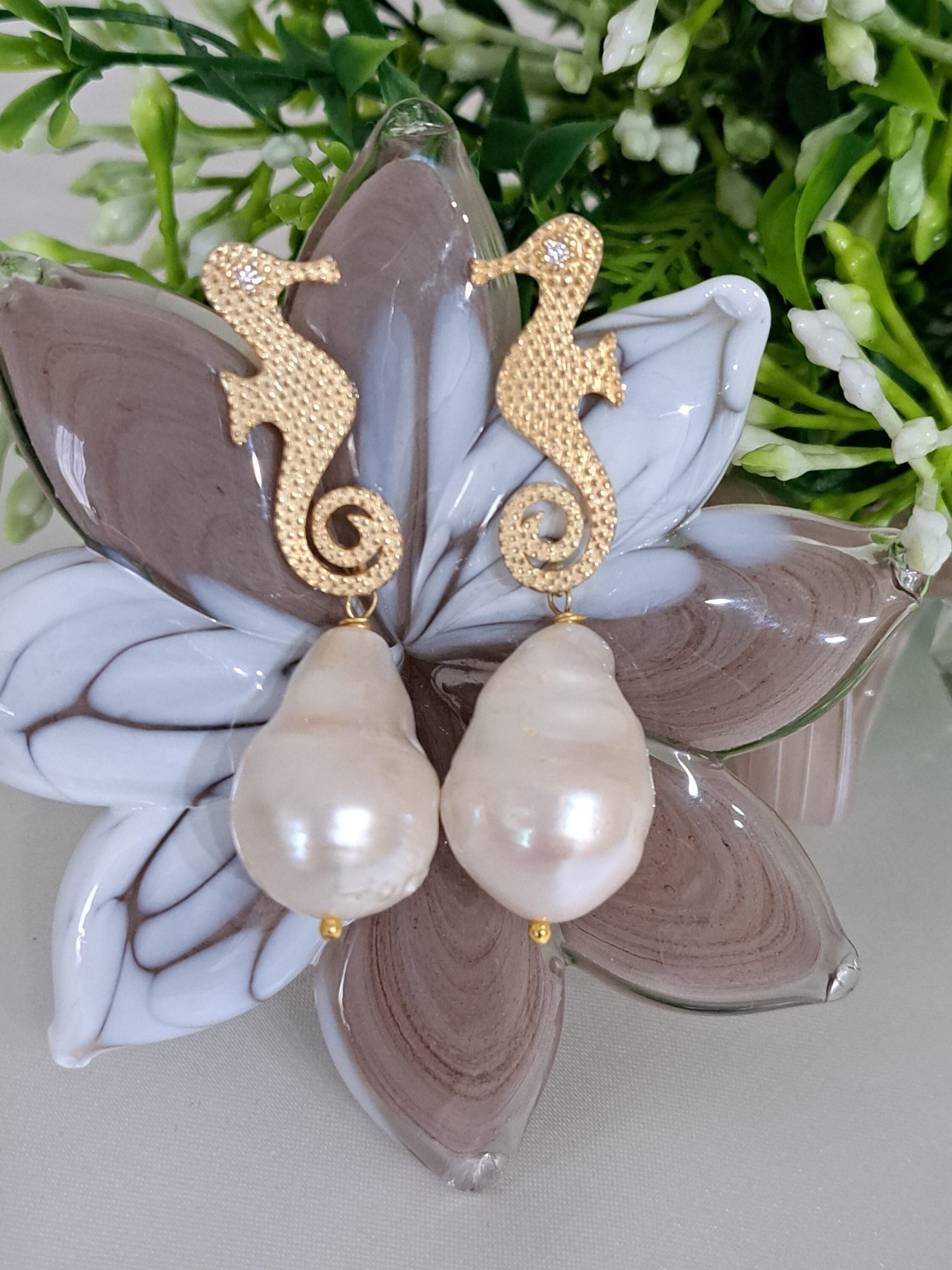 Orecchini perle barocche bianche e cavallucci marini argento 925 placcato oro con zirconi