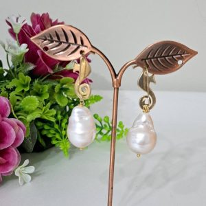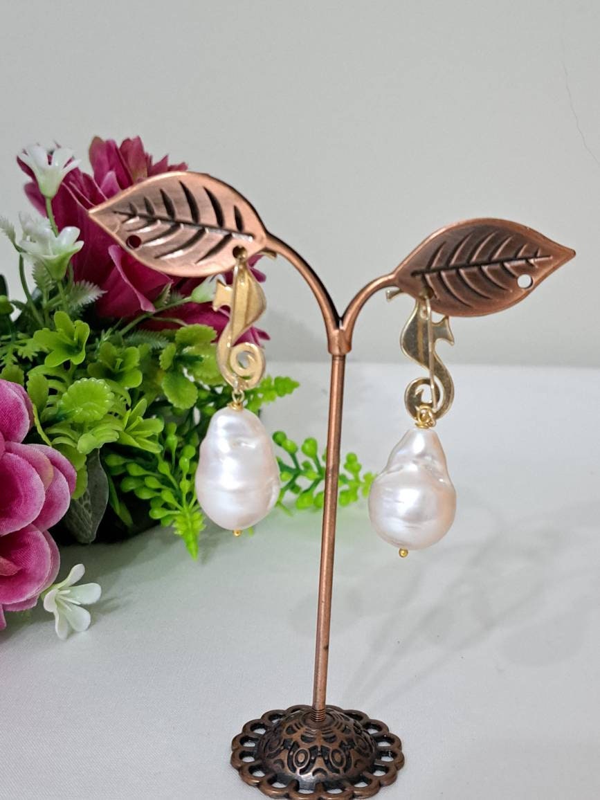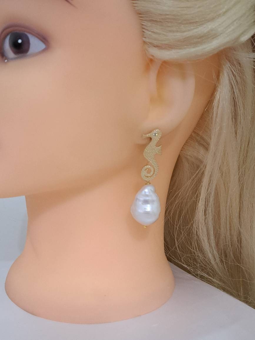 Orecchini pendenti con perle goccia barocche bianche grandi 25 mm , chiusura a monachelle a forma di cavalluccio marino in argento 925 placcato oro con zirconi , lunghezza totale 5,5 cm