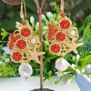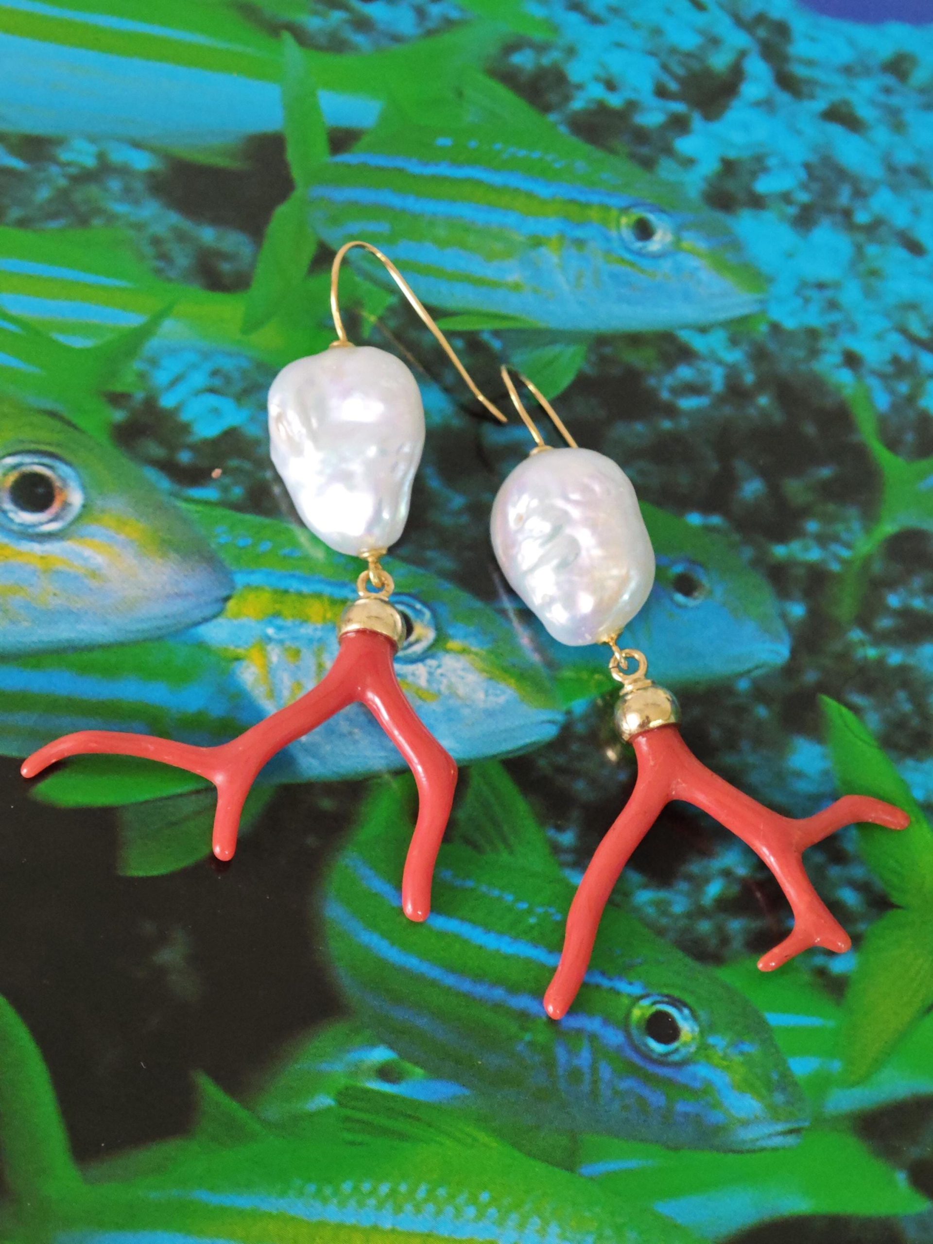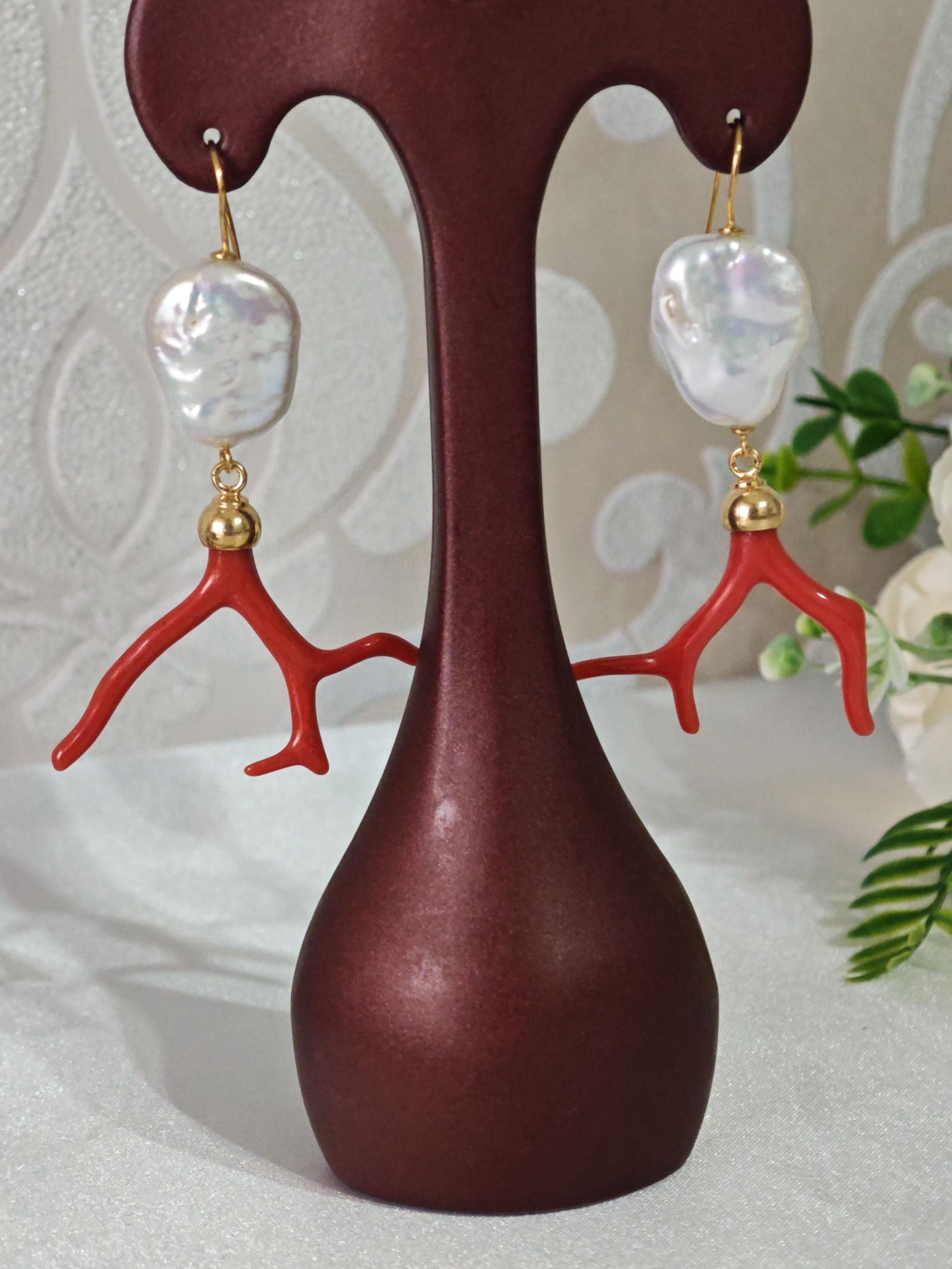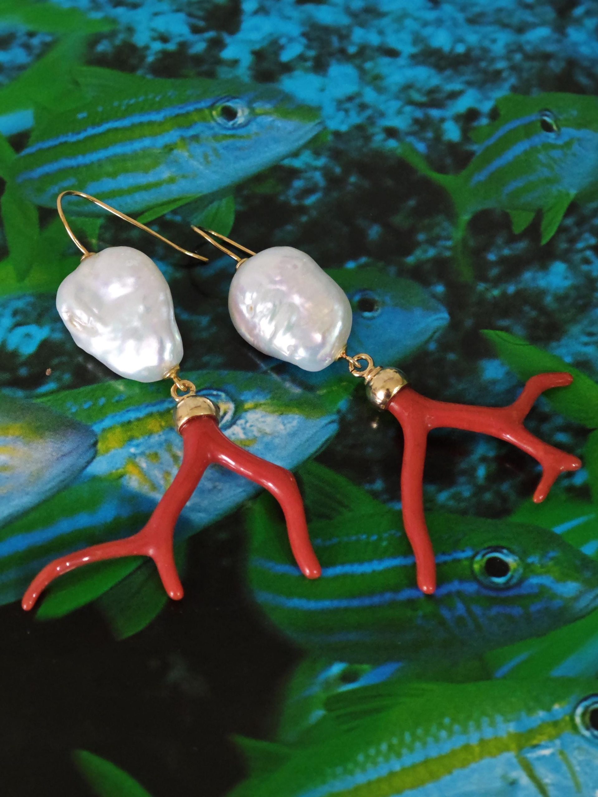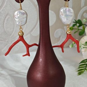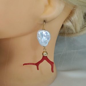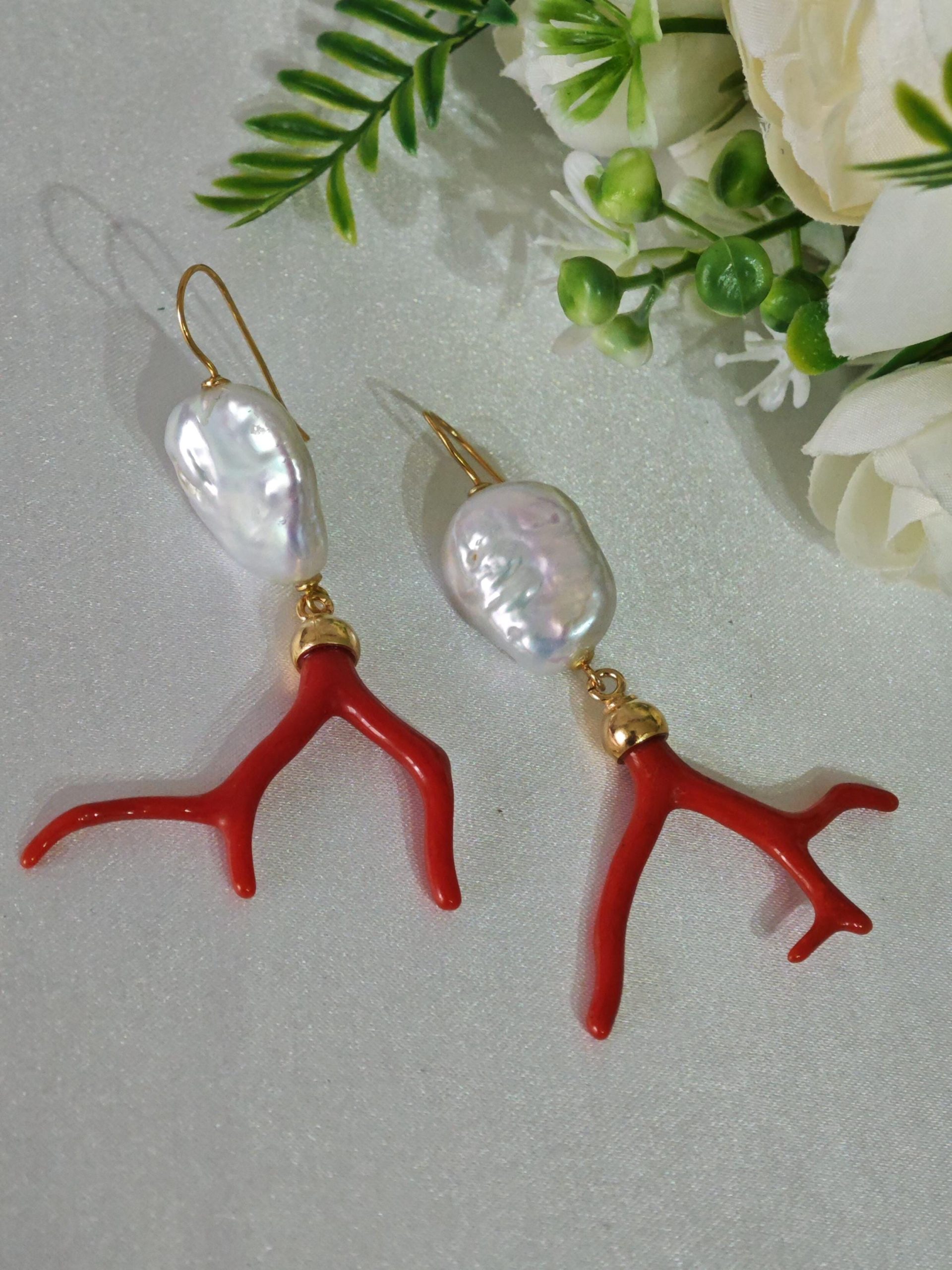 Orecchini perle barocche bianche e corallo rosso mediterraneo con argento 925 placcato oro, gioielli italiani