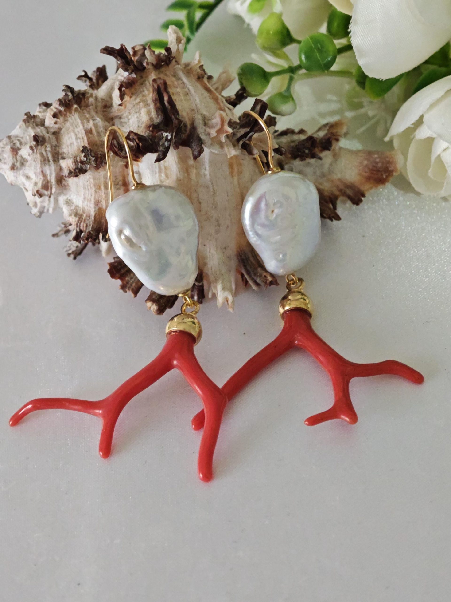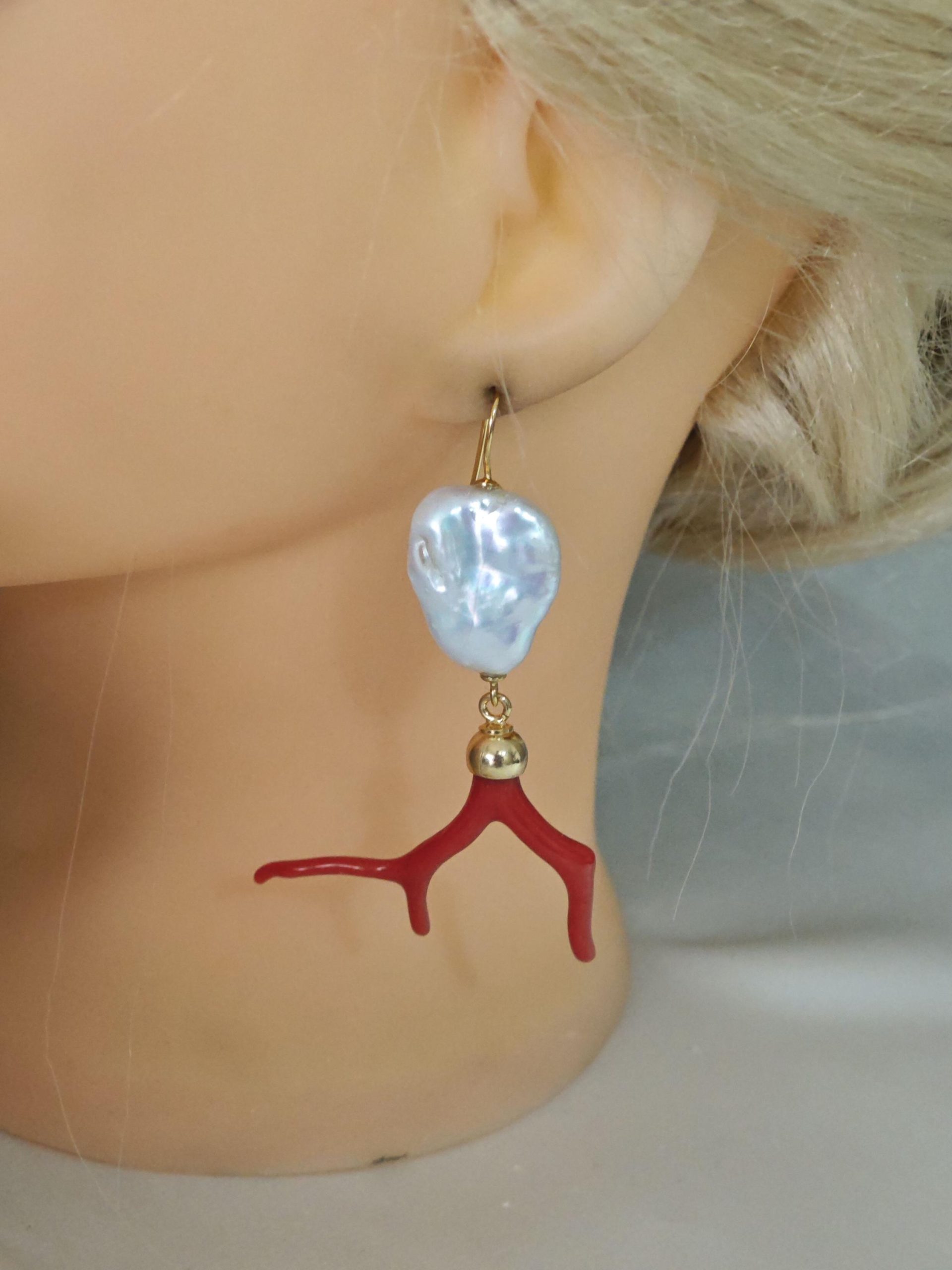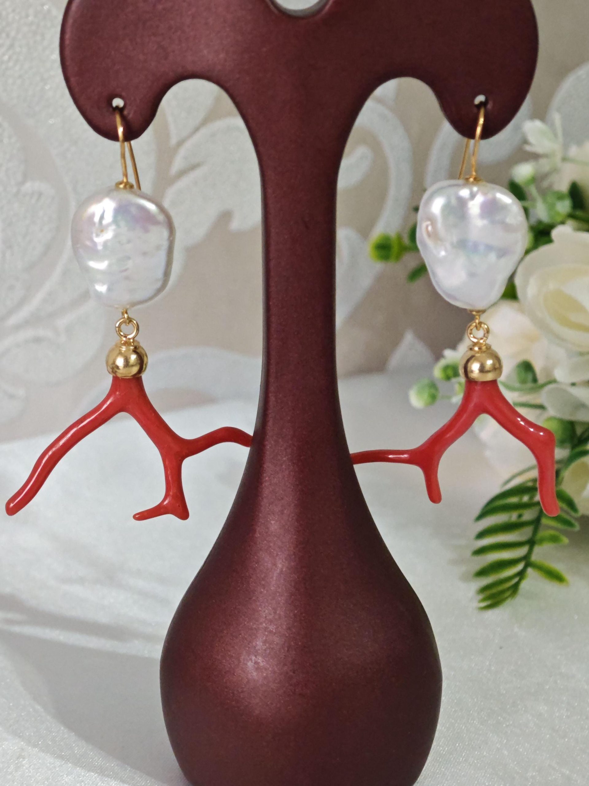 Orecchini pendenti con perle barocche bianche e rametti corallo rosso mediterraneo naturale , chiusura a monachelle in argento 925.