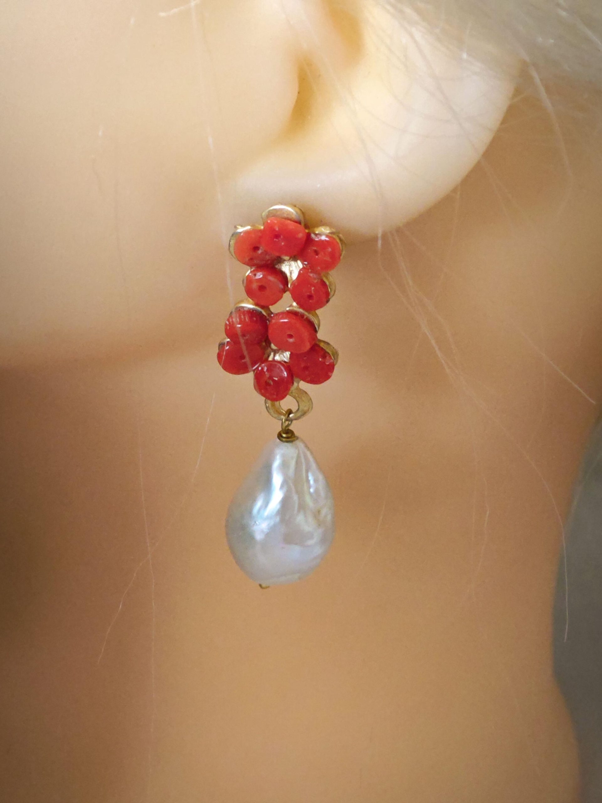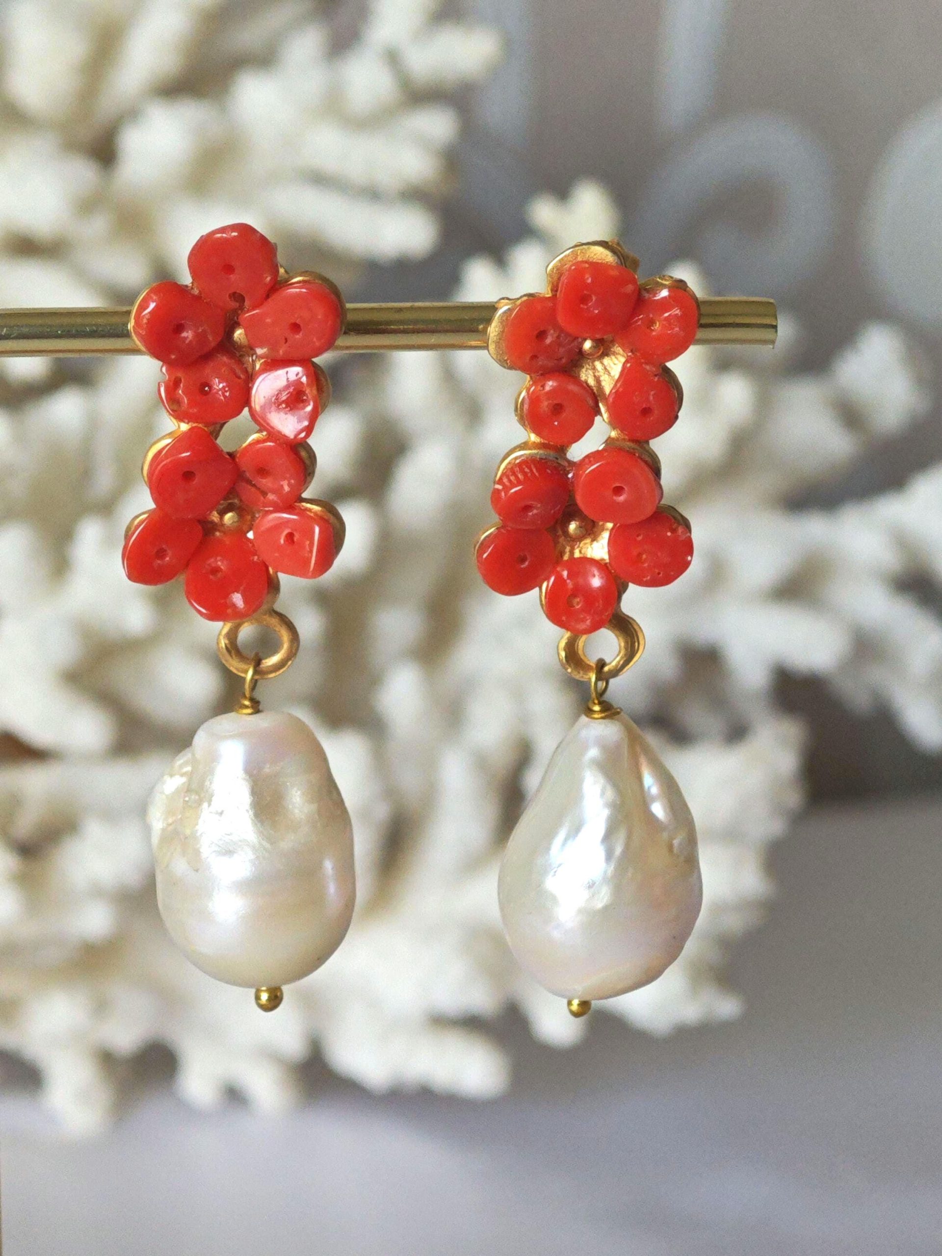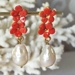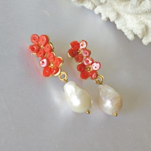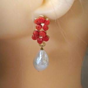 Orecchini perle barocche bianche e fiori corallo rosso, gioielli italiani