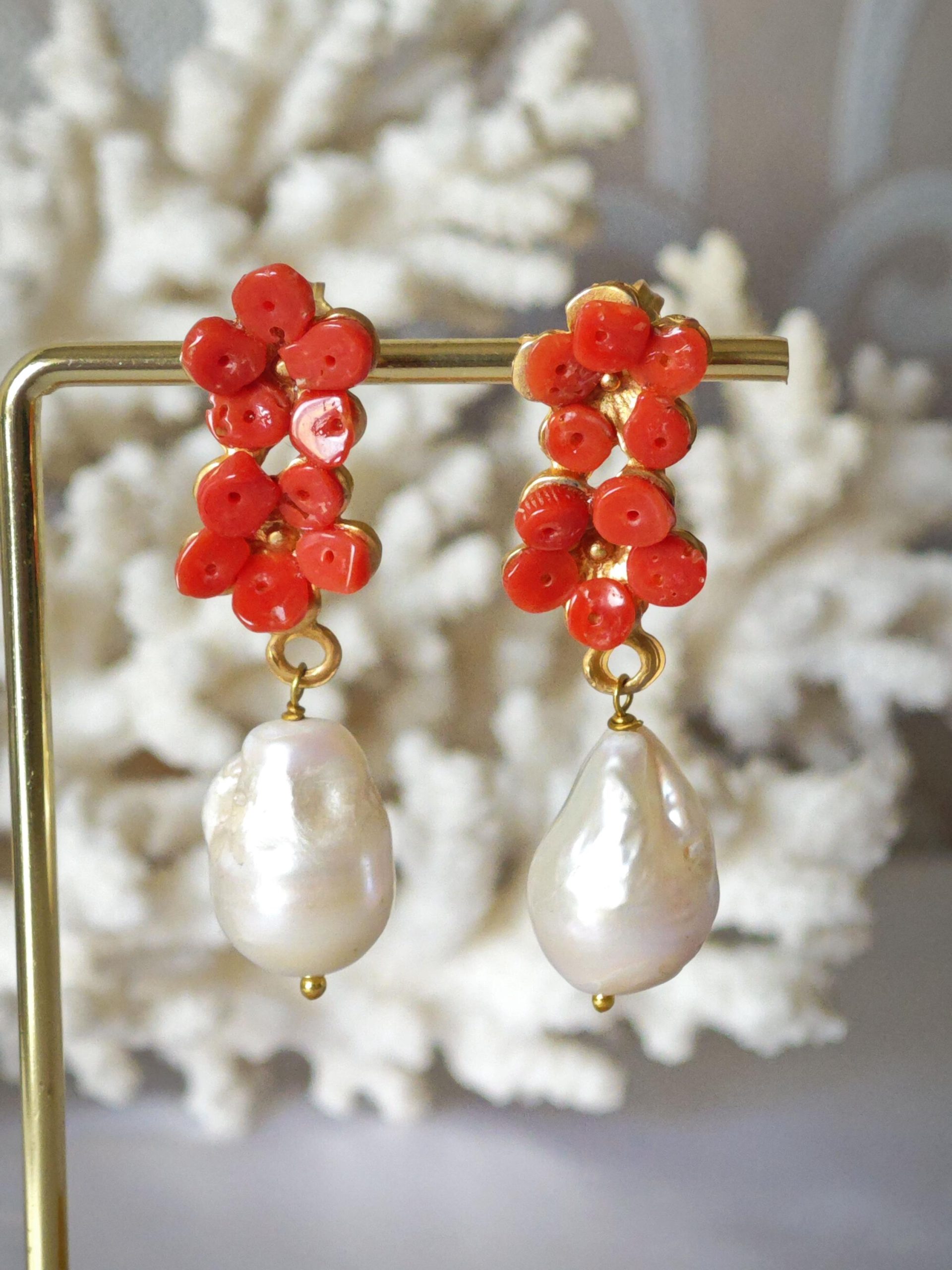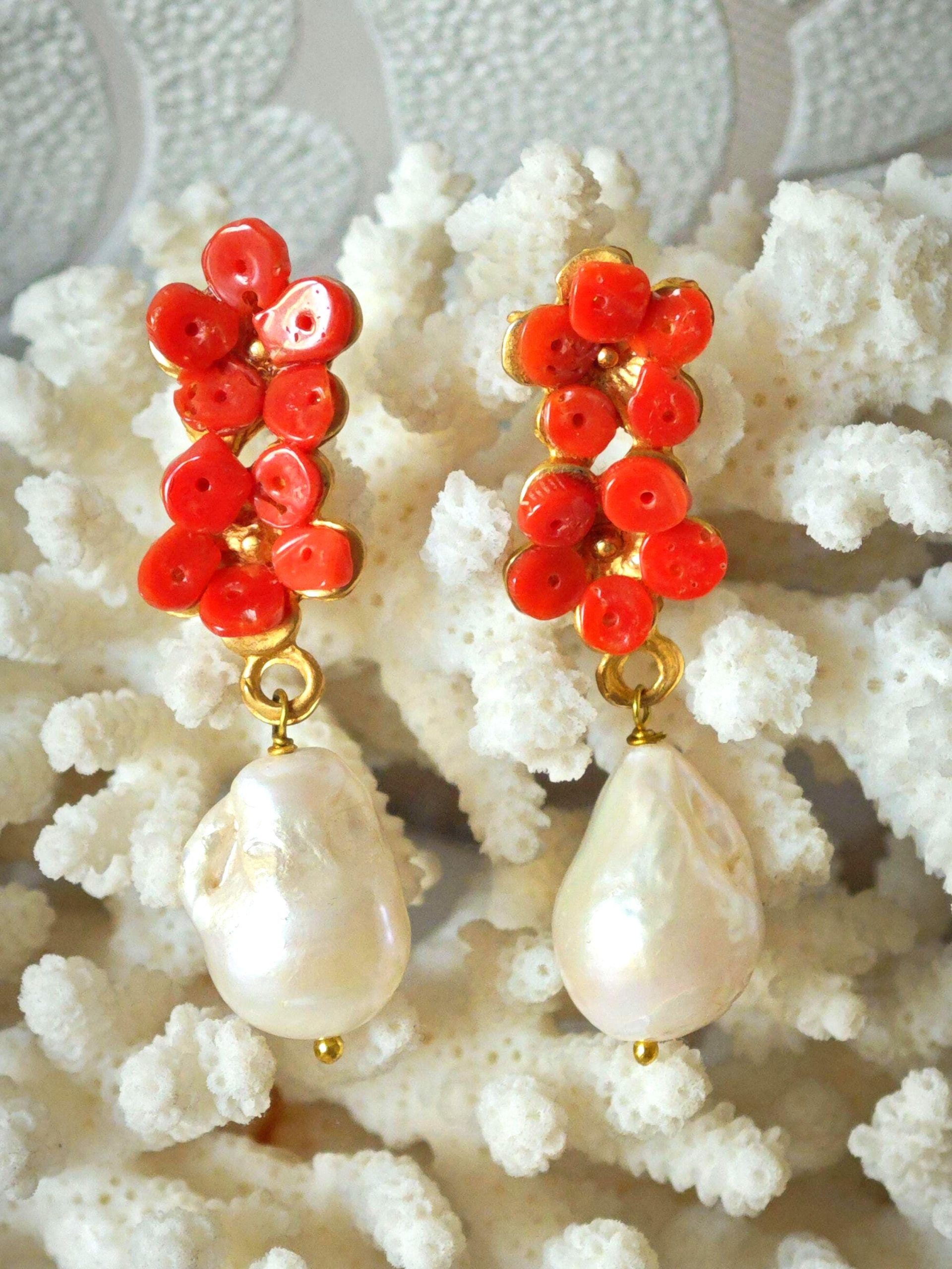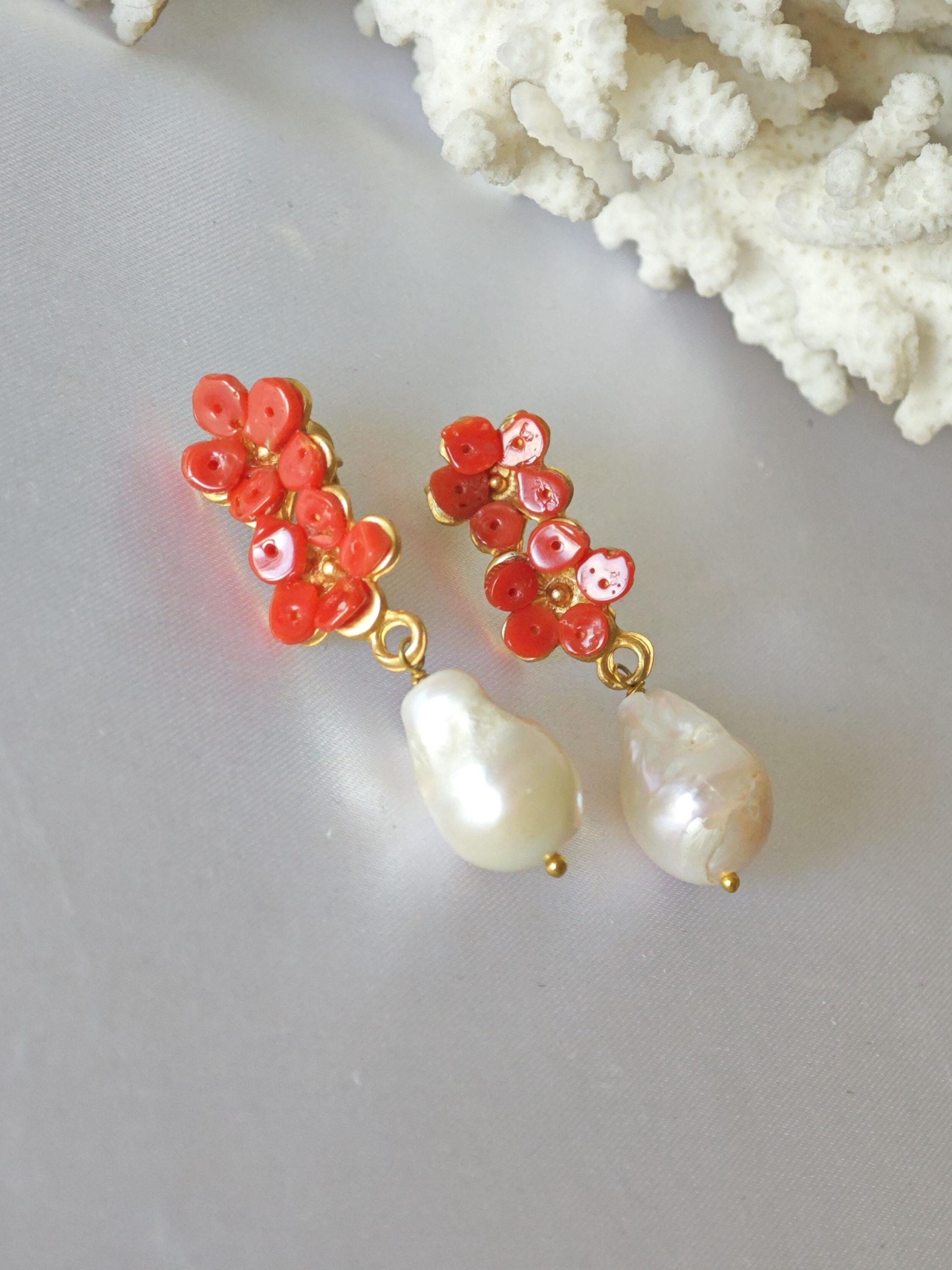 Orecchini perle barocche bianche e fiori corallo rosso, gioielli italiani