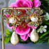 Orecchini pendenti con perle barocche bianche , chiusura a perno con farfallina in ottone dorato satinato a forma di fiori decorate con corallo rosso mediterraneo naturale.