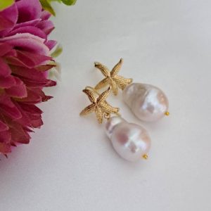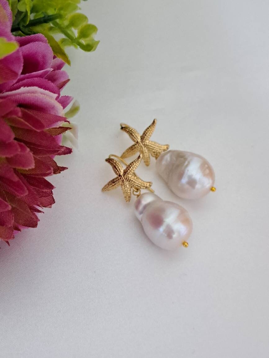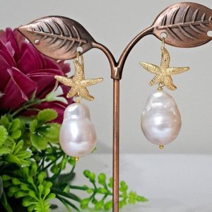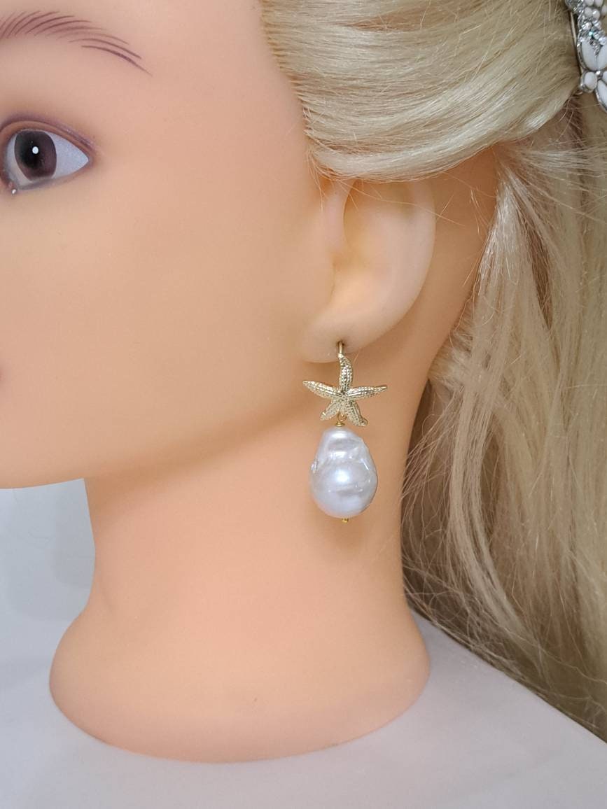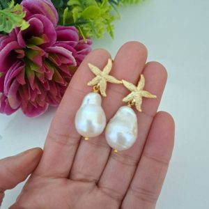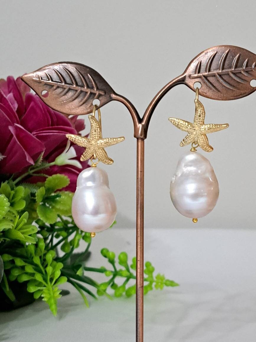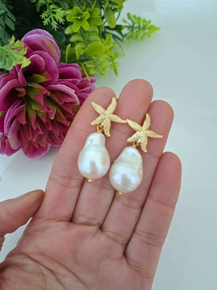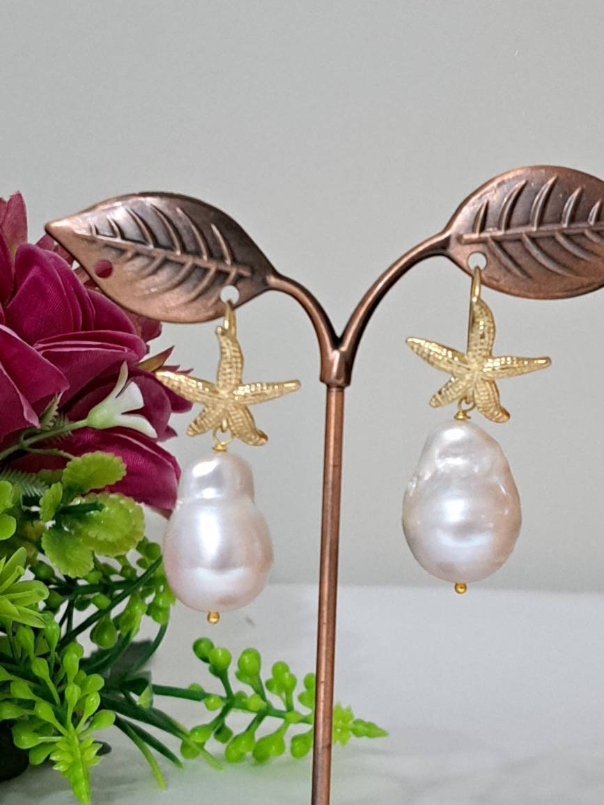 Orecchini pendenti con perle barocche bianche grandi , monachelle con stelle marine in argento 925 placcato oro.