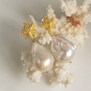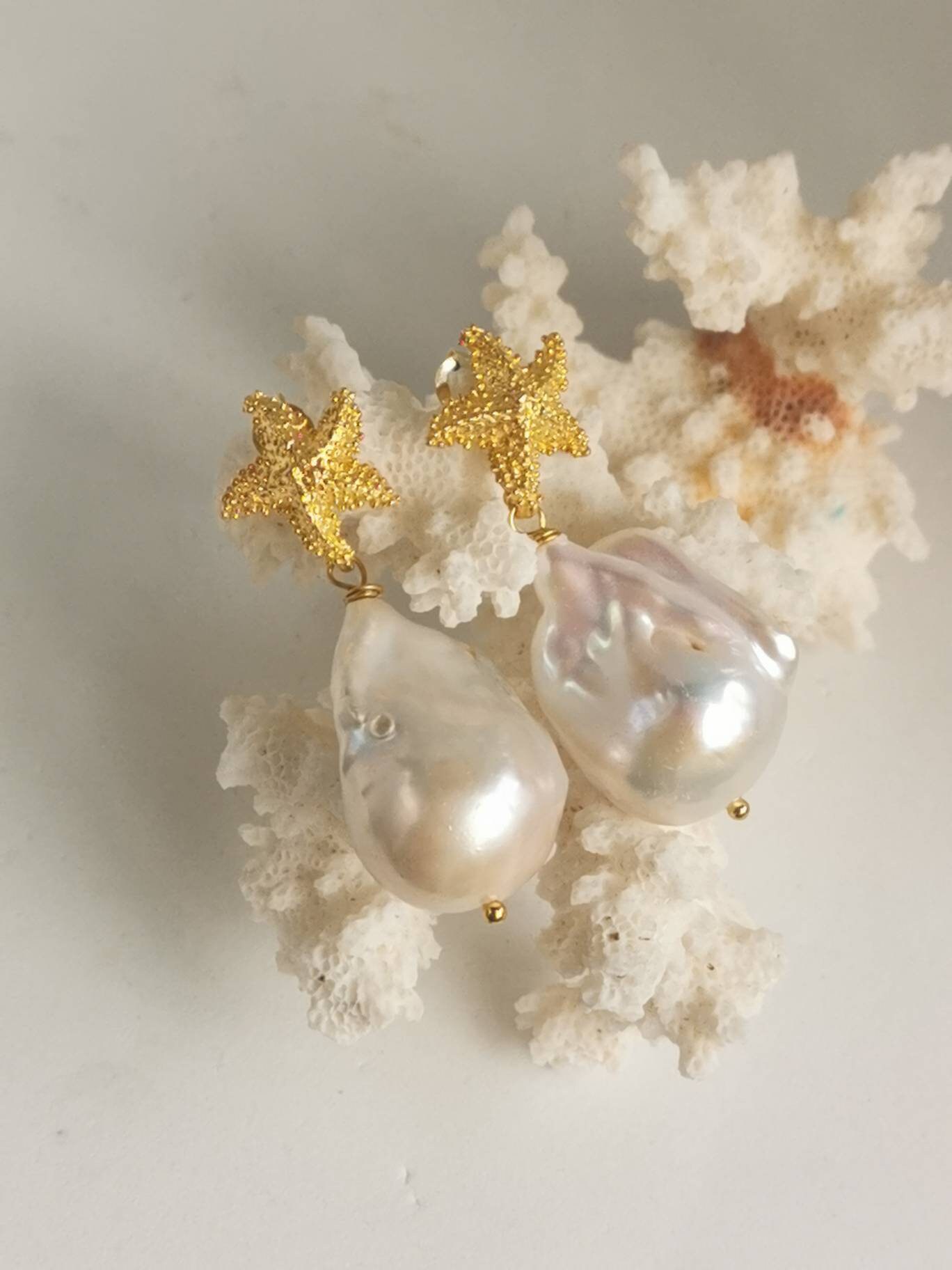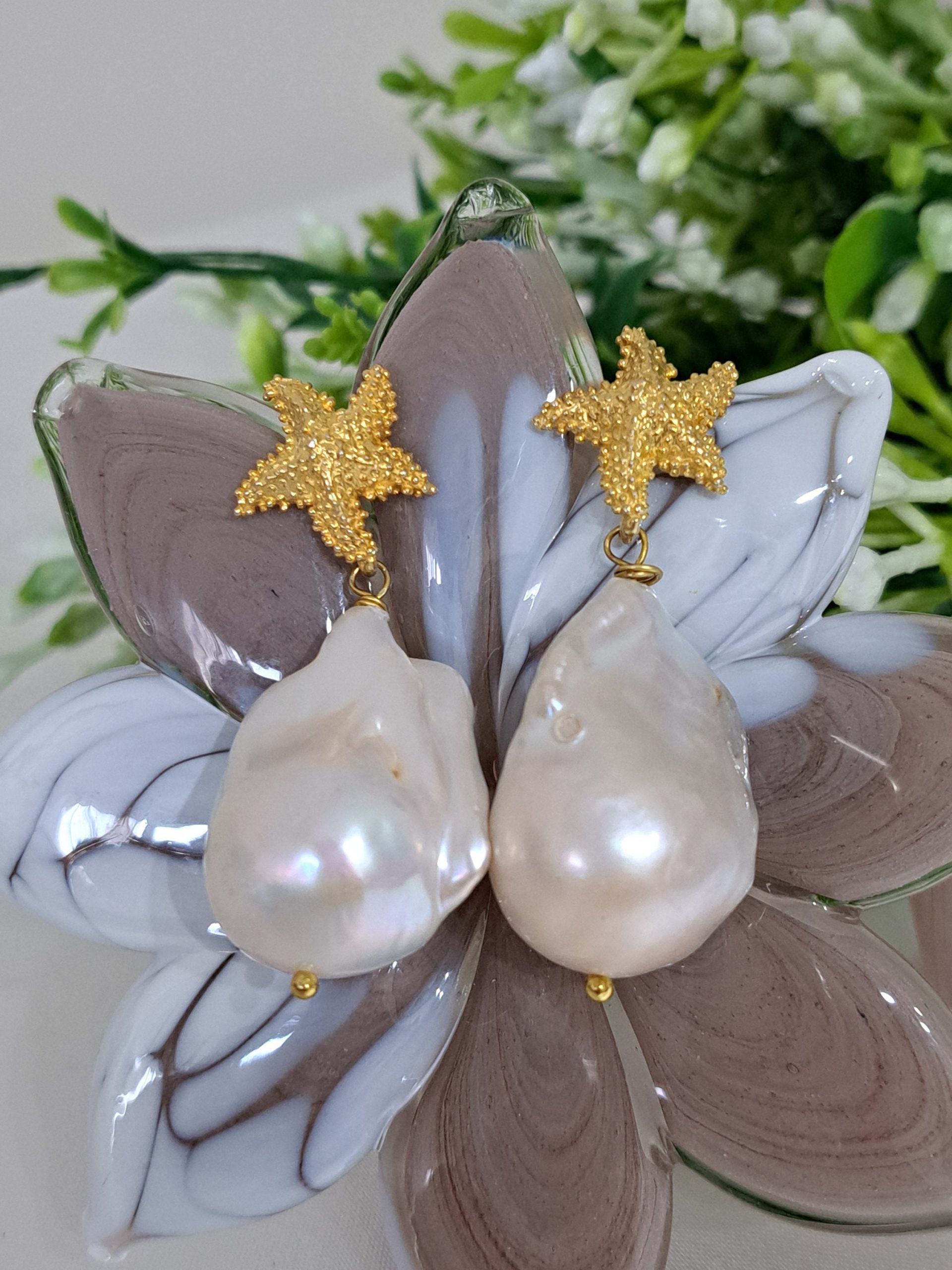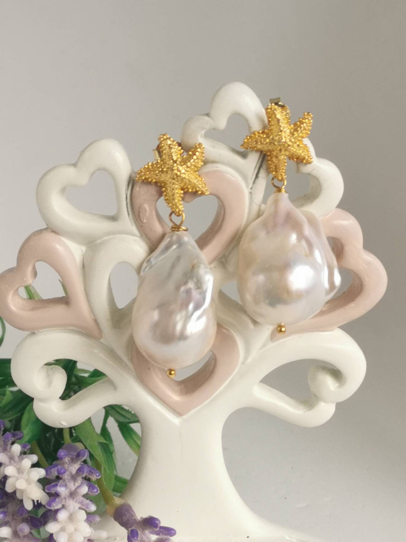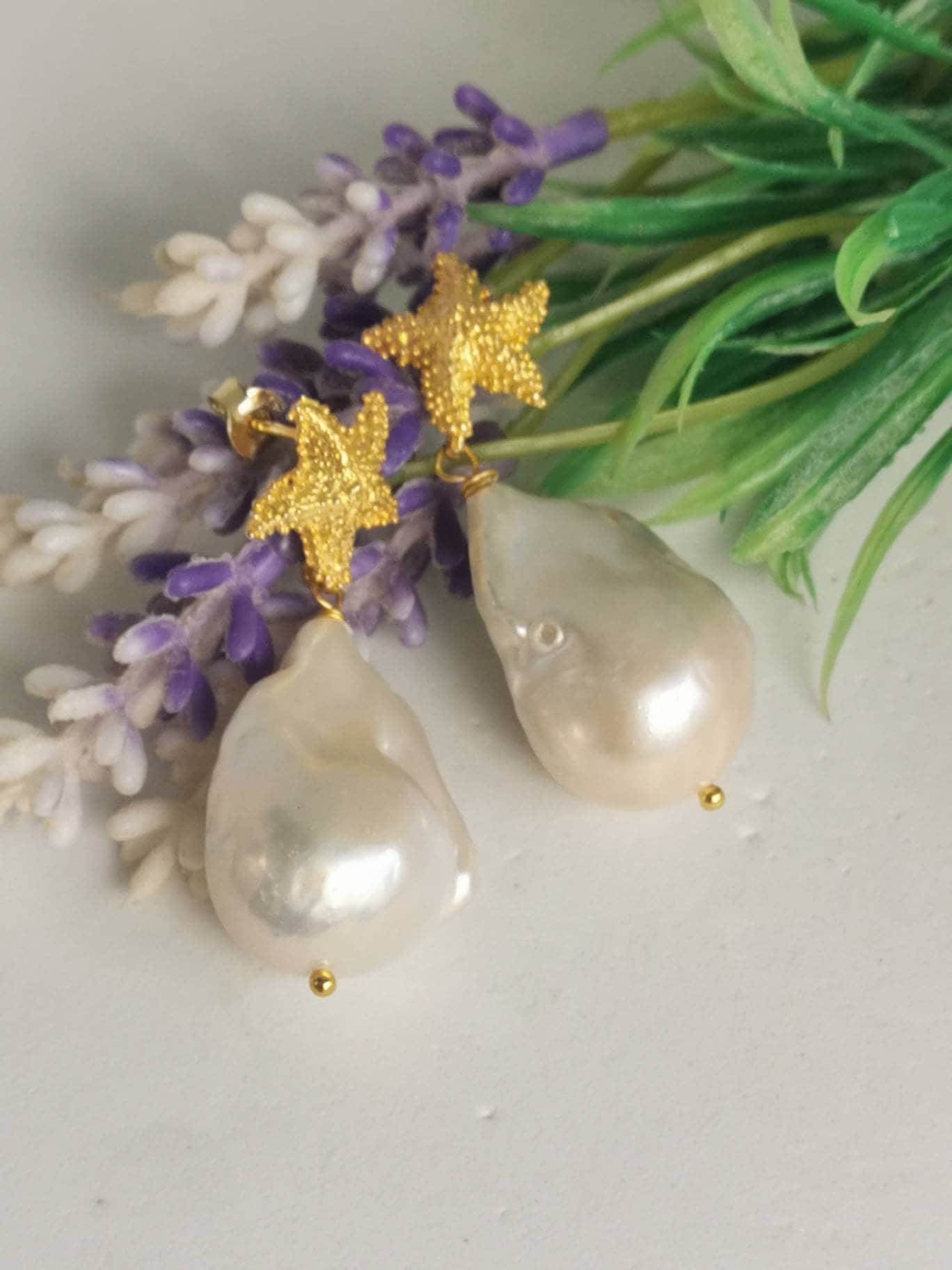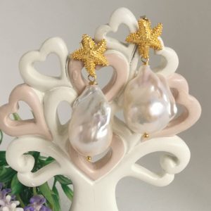 Orecchini perle barocche bianche e stelle marine in argento 925 placcato oro, gioielli italiani