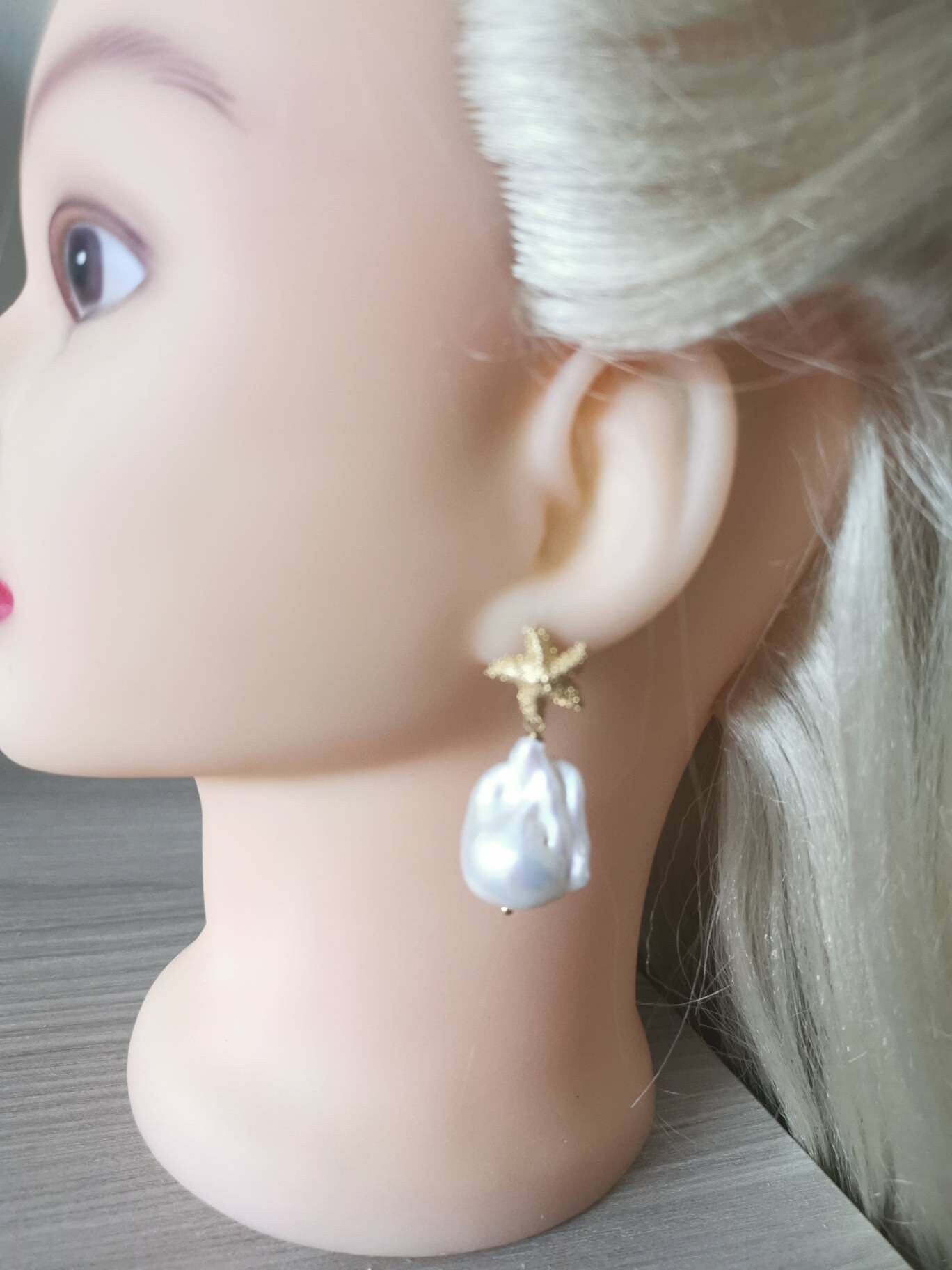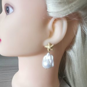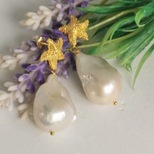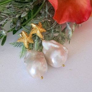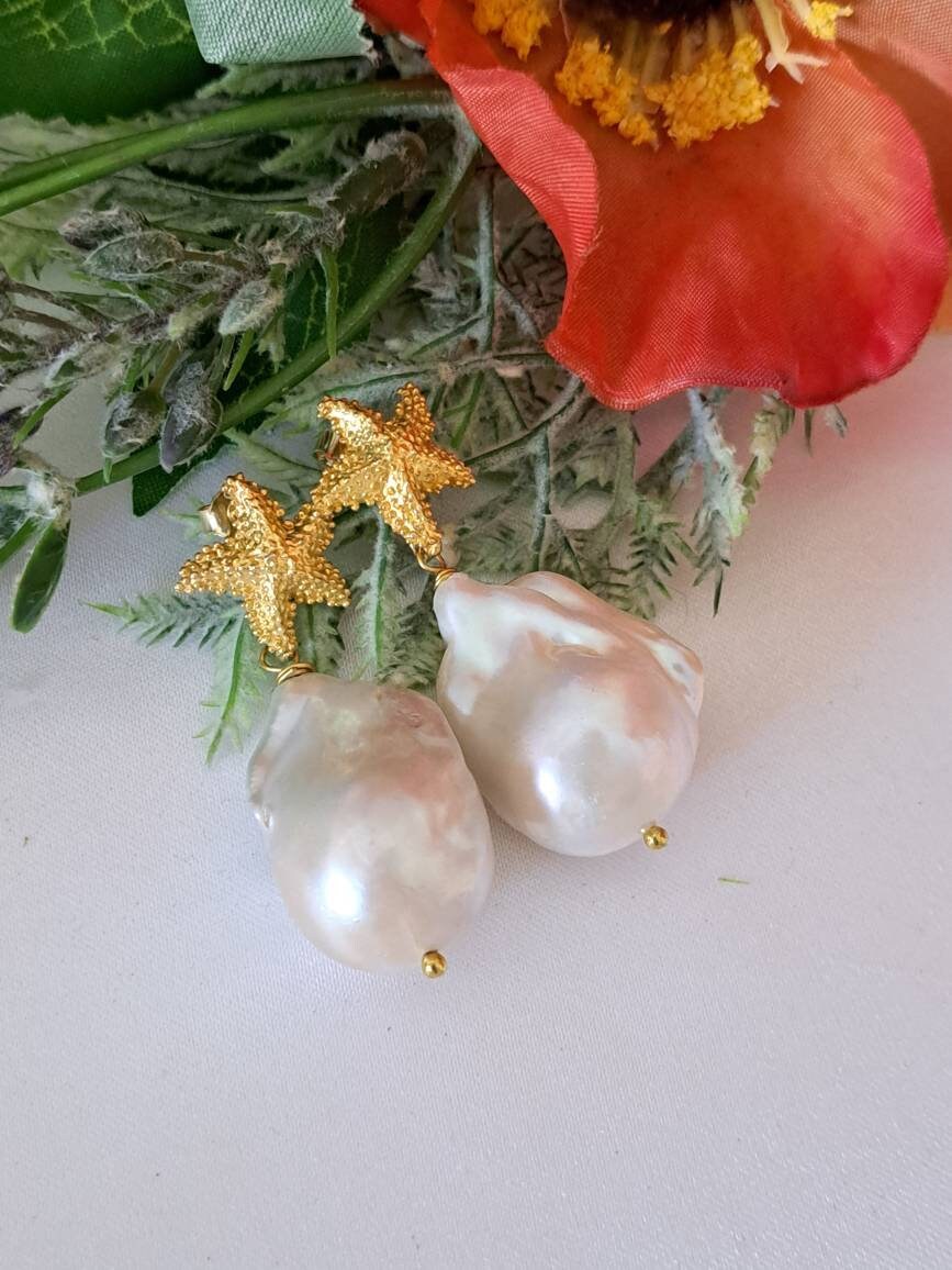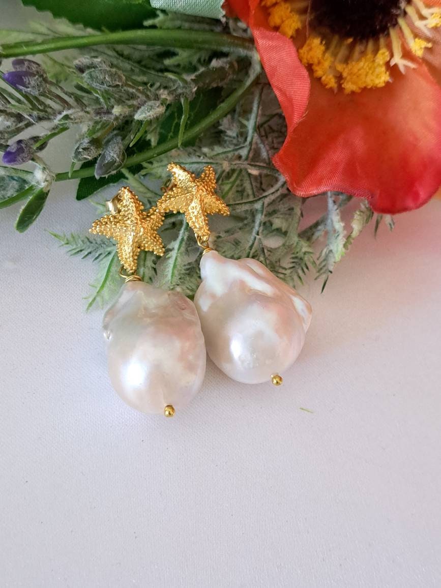 Orecchini pendenti con perle barocche bianche grandi 2,5 cm, chiusura a perno con farfallina a forma di stelle marine in argento 925 placcato oro , lunghezza totale 4 cm