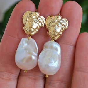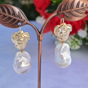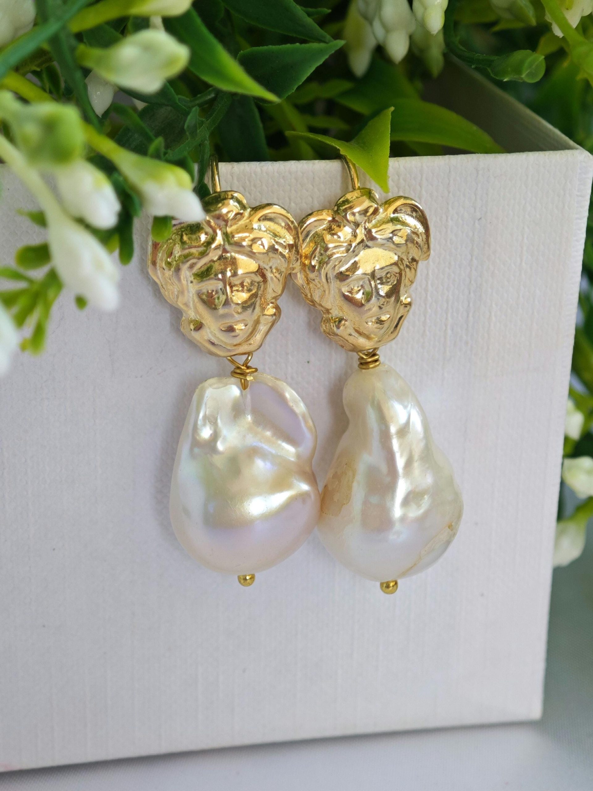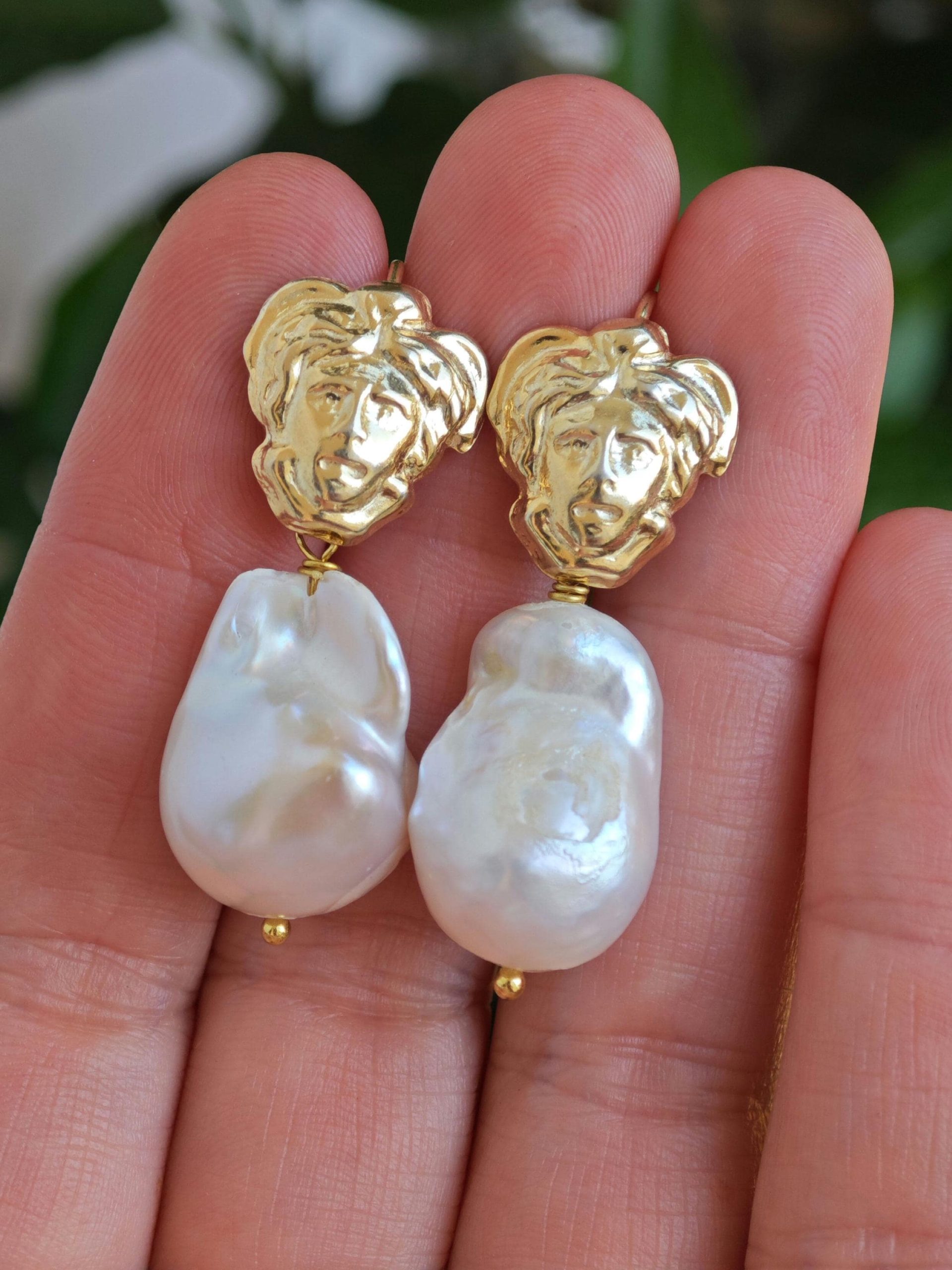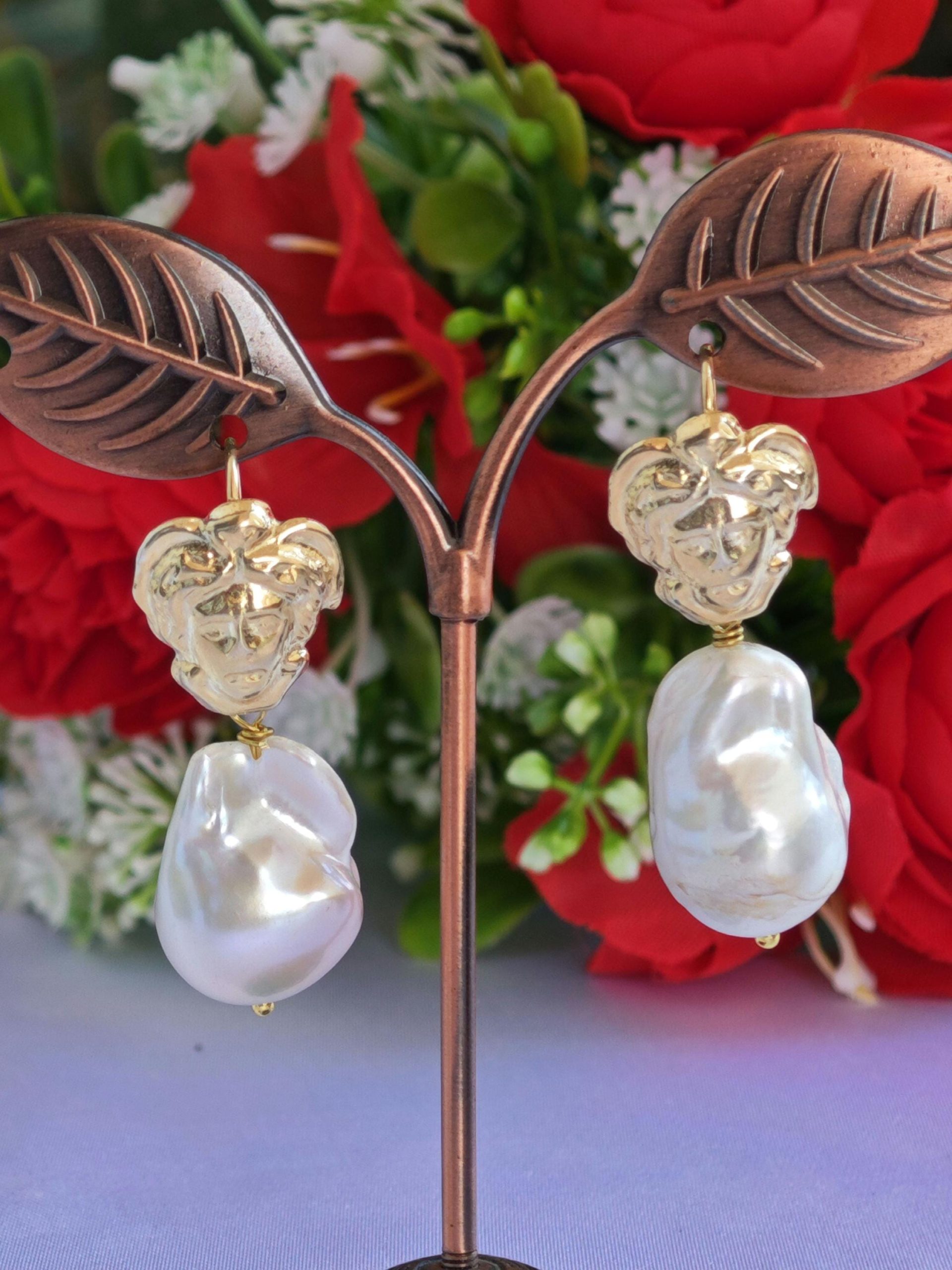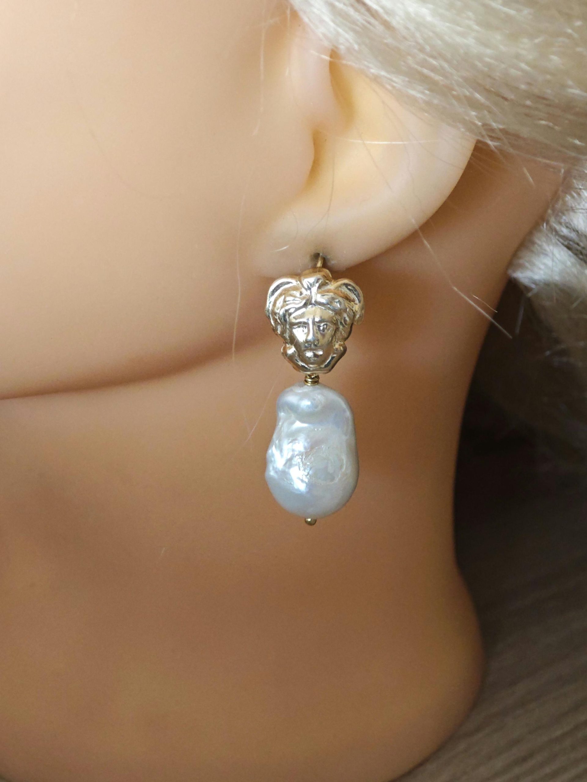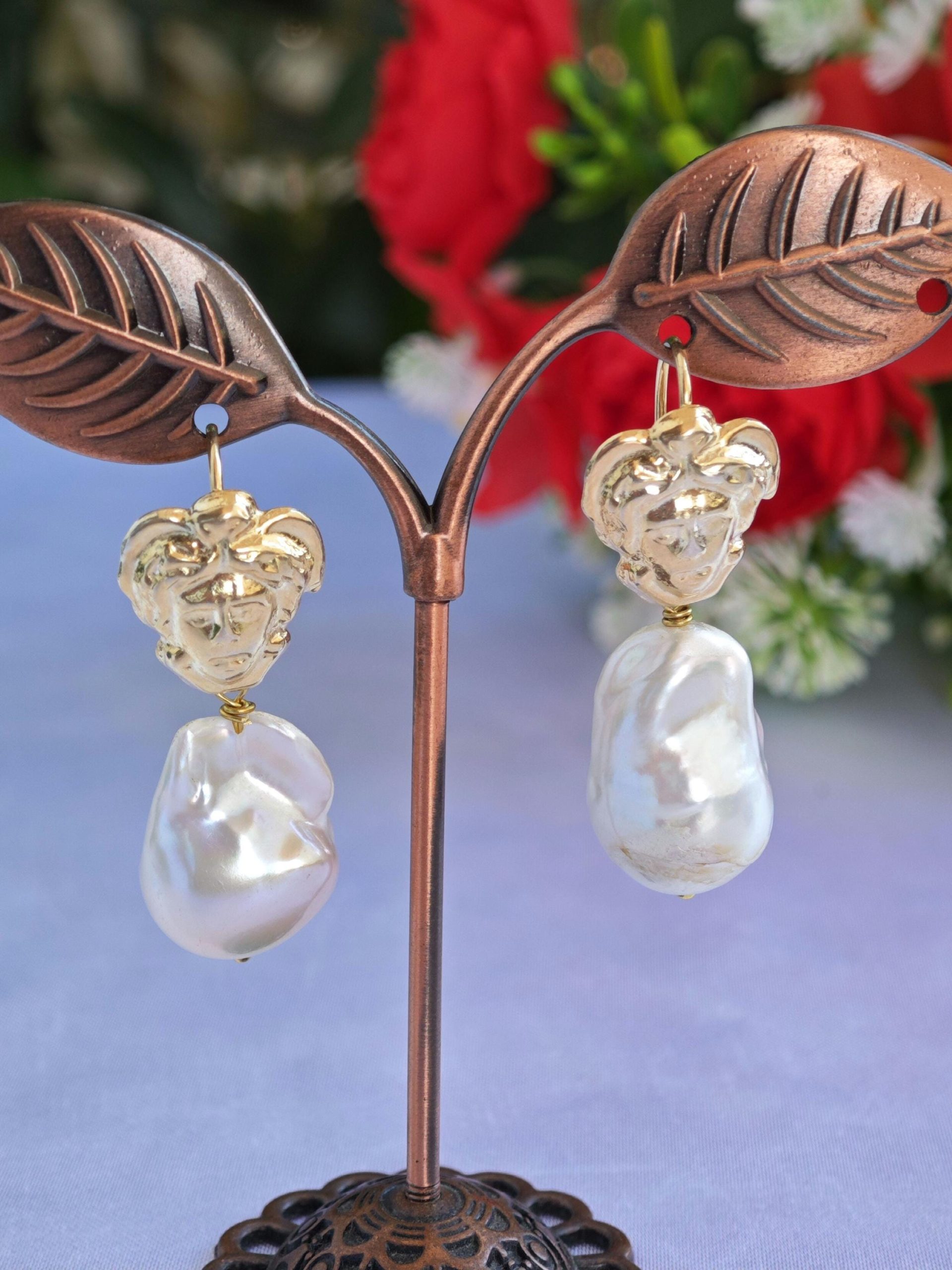 Orecchini perle barocche bianche e teste di moro argento 925 placcato oro, gioielli italiani