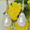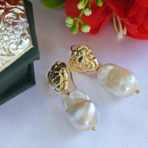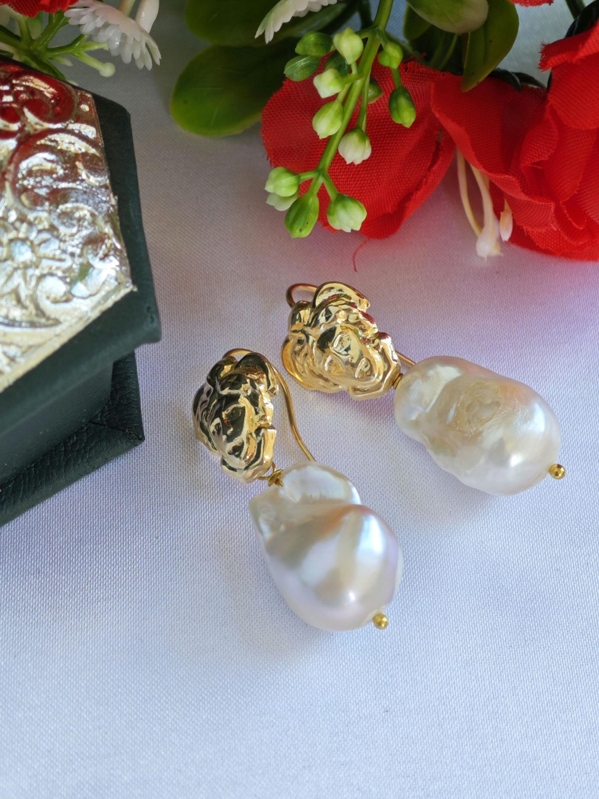Orecchini pendenti con perle barocche bianche , chiusura a monachelle in argento 925 placcato oro.