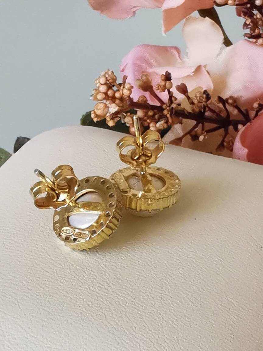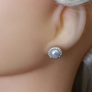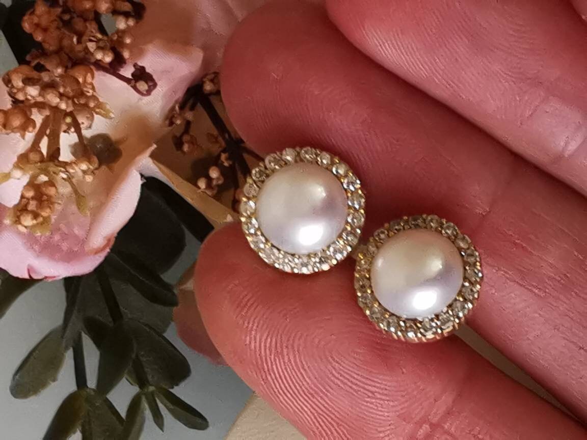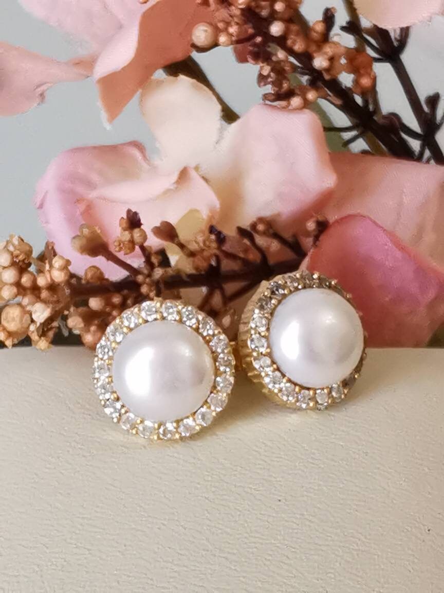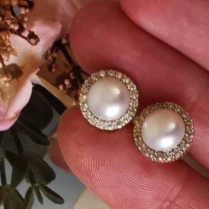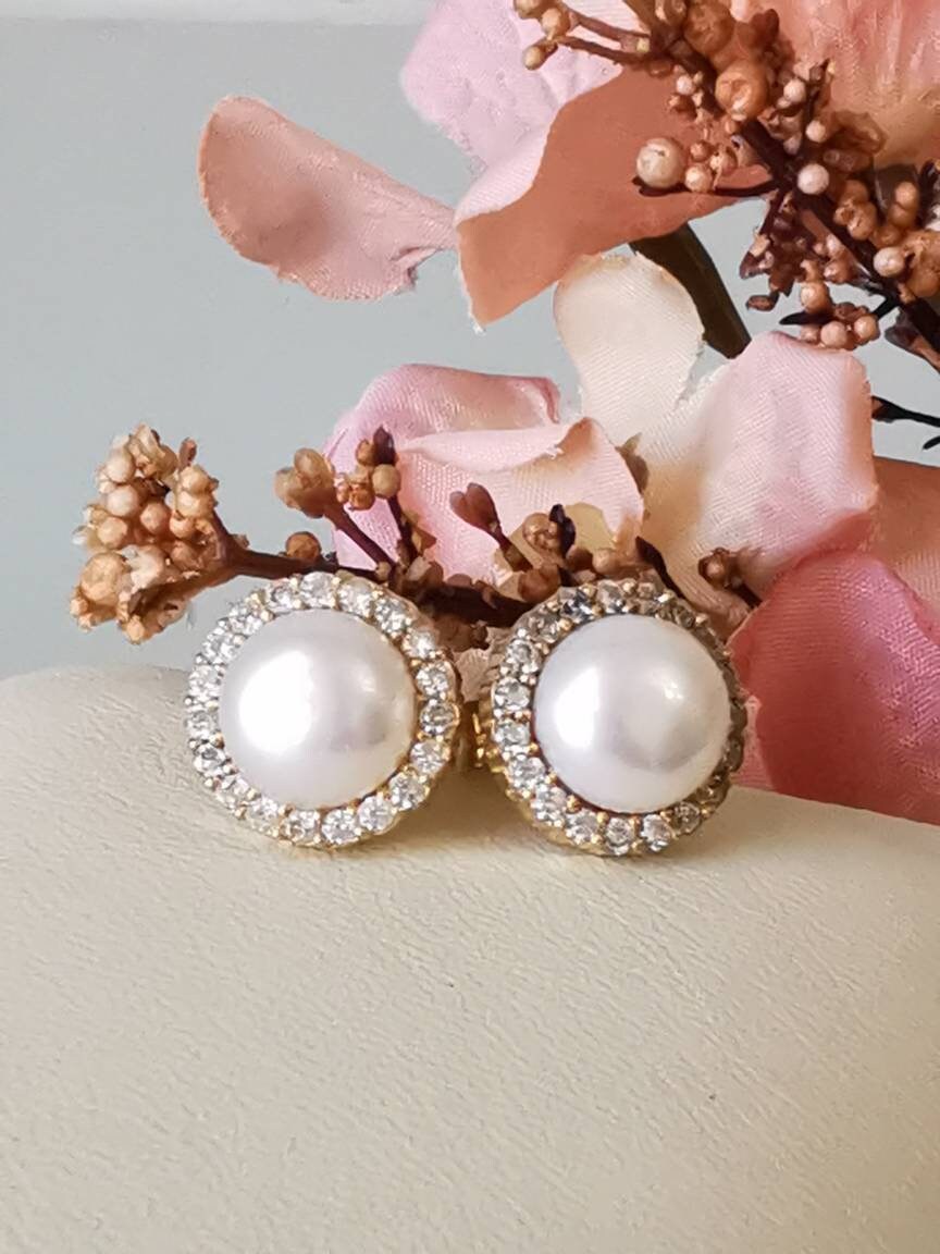 Orecchini artigianali in argento 925 placcato oro con perle bianche naturali e cornice zirconi bianchi.