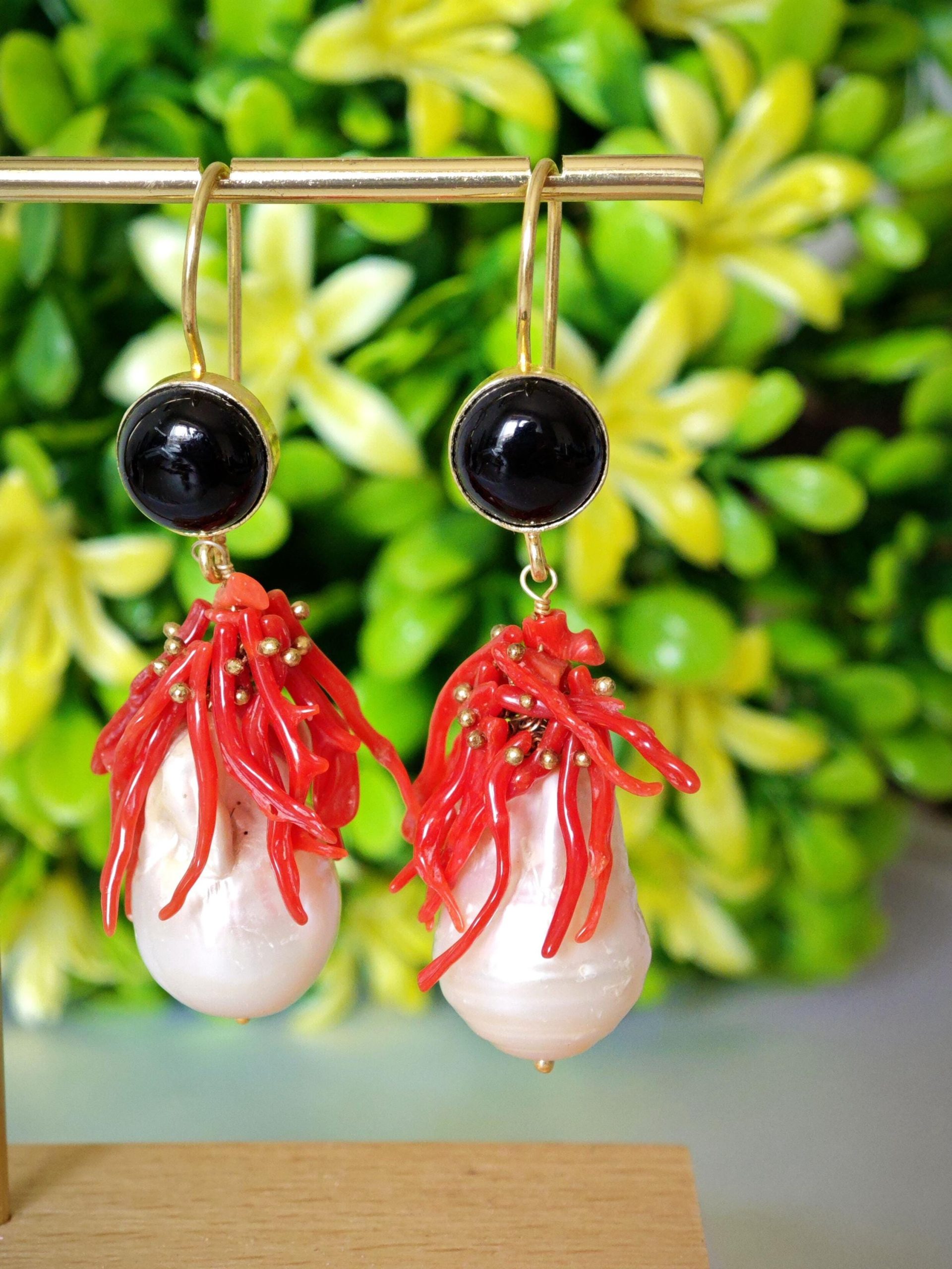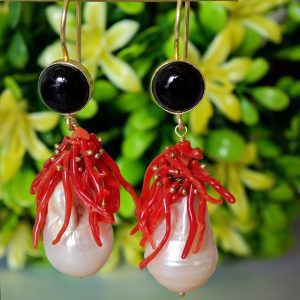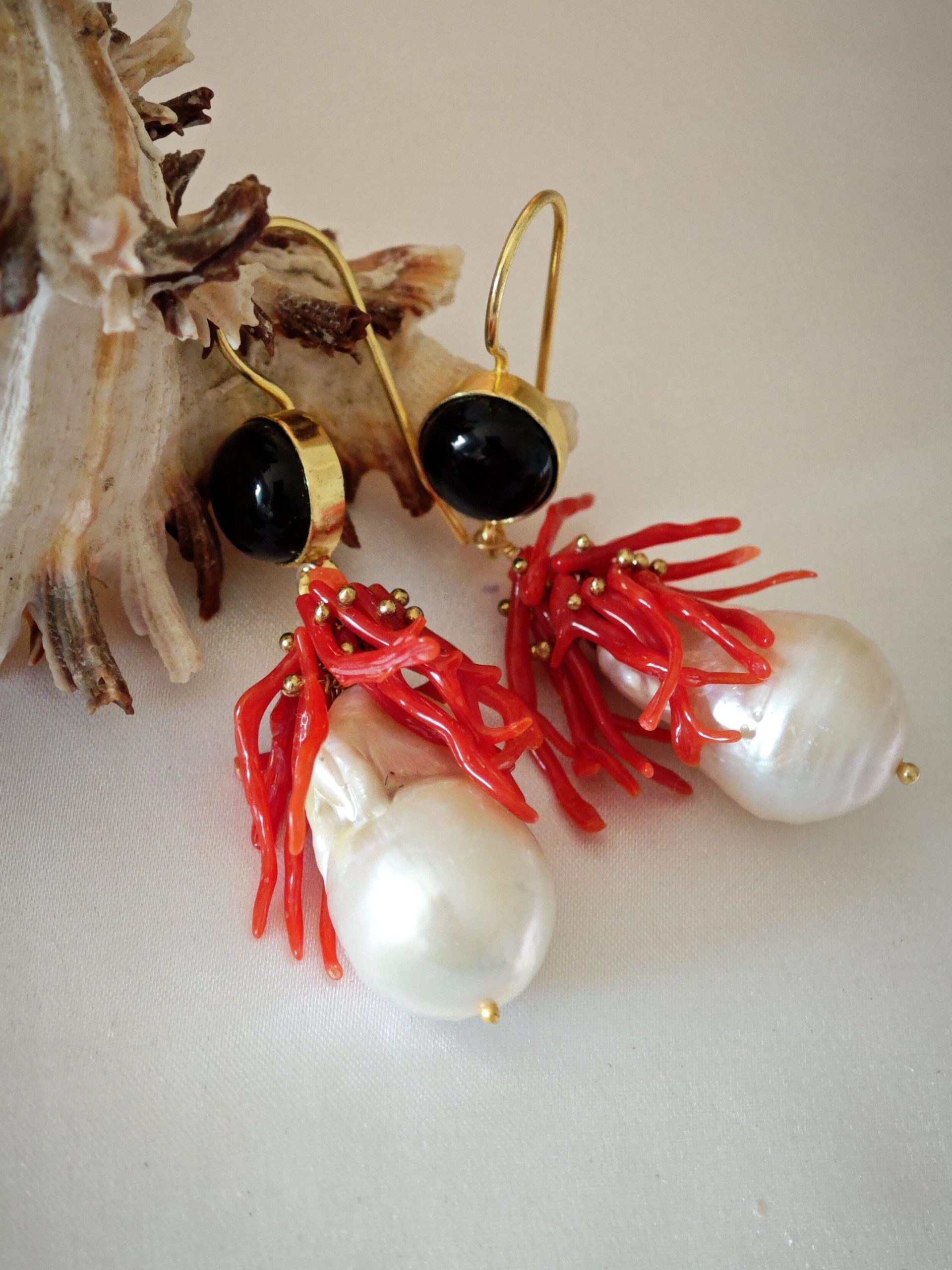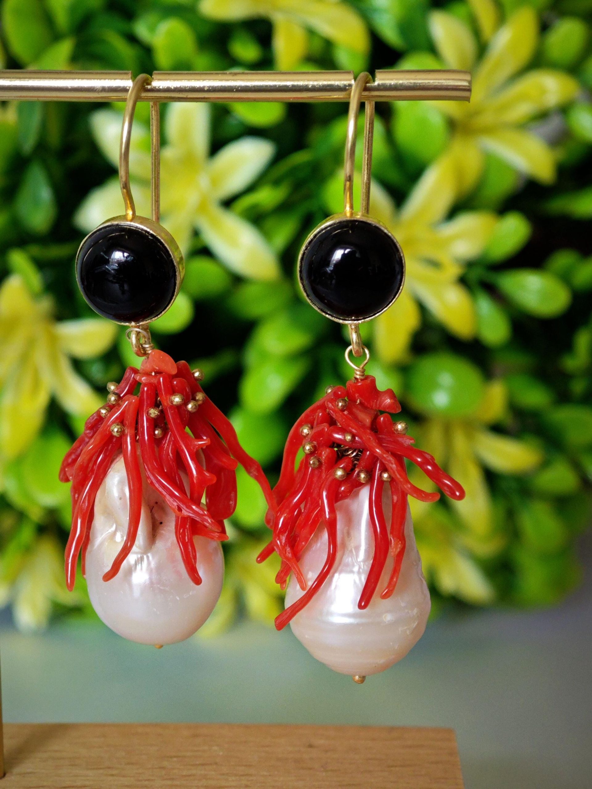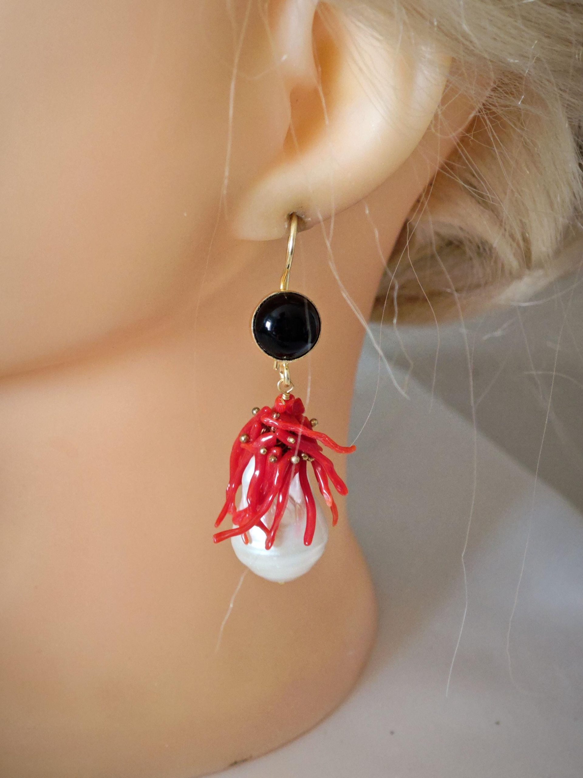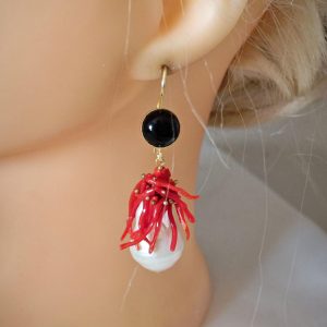 Orecchni realizzati con perle barocche bianche grandi e con rametti corallo rosso naturale mediterraneo.
