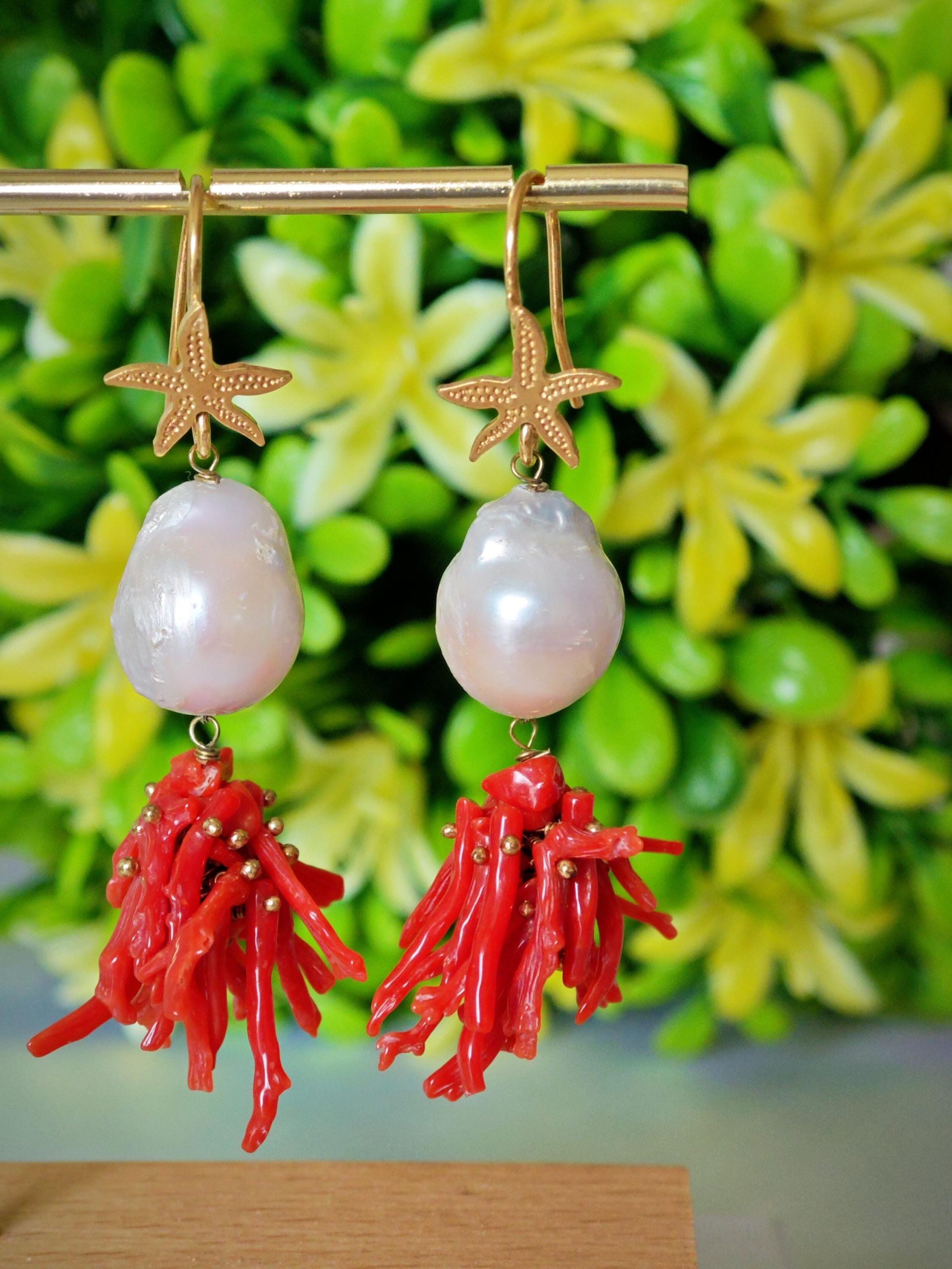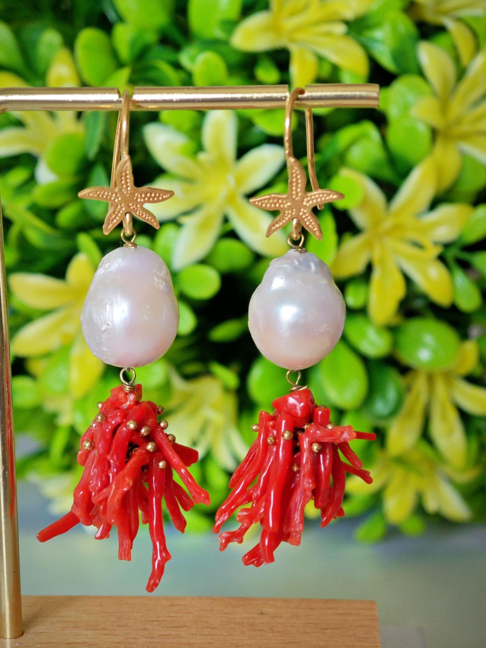 Orecchini perle bianche barocche , corallo rosso e stelle marine dorate, gioielli italiani