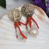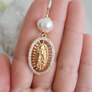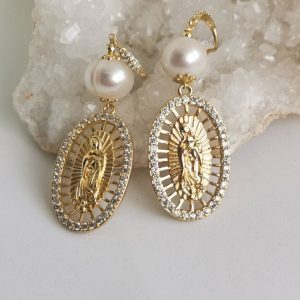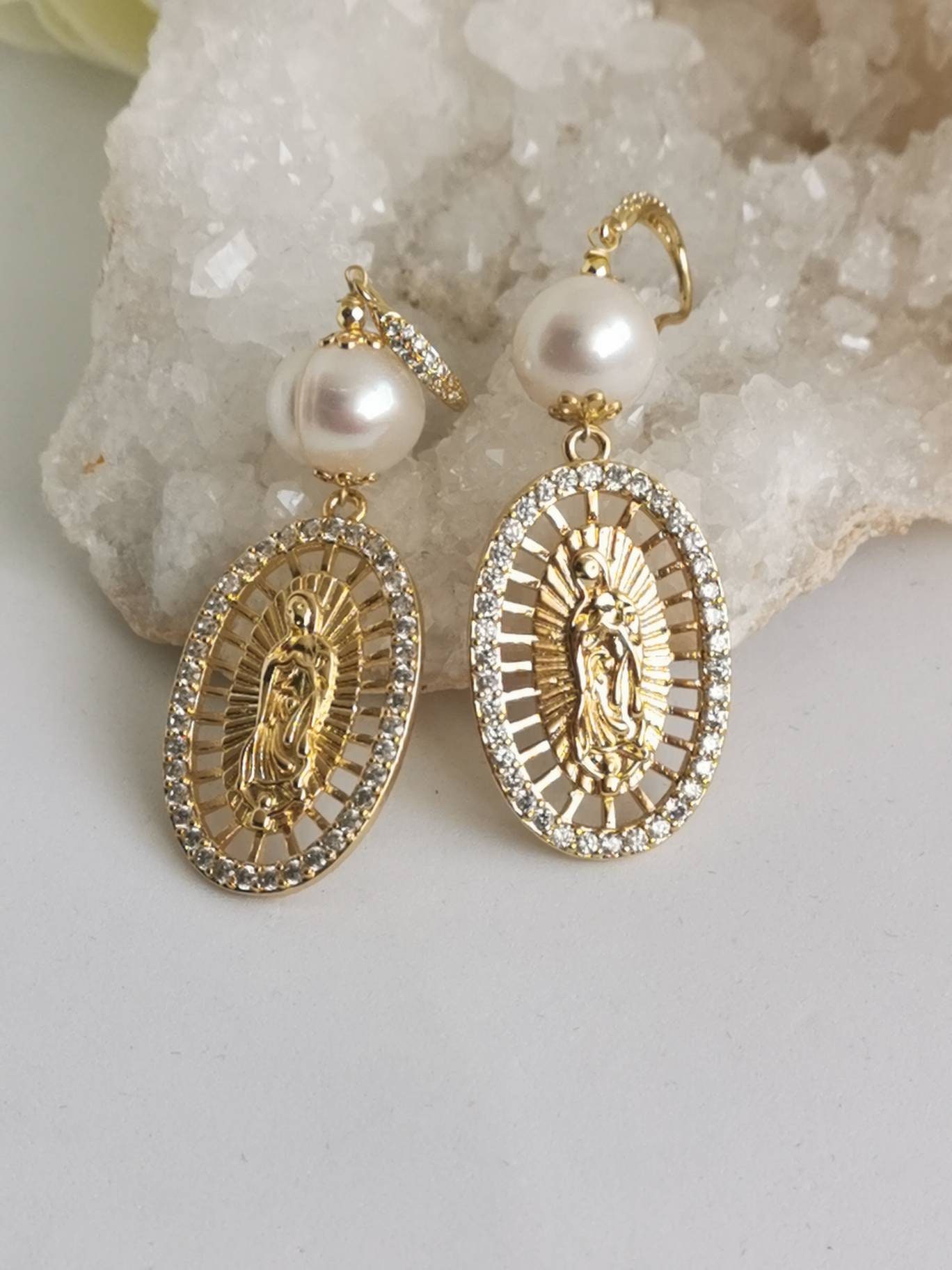 Orecchini pendenti con perle bianche naturali e medaglietta raffigurante Madonna 3×2 cm dimensioni in metallo dorato con cornice zirconi .