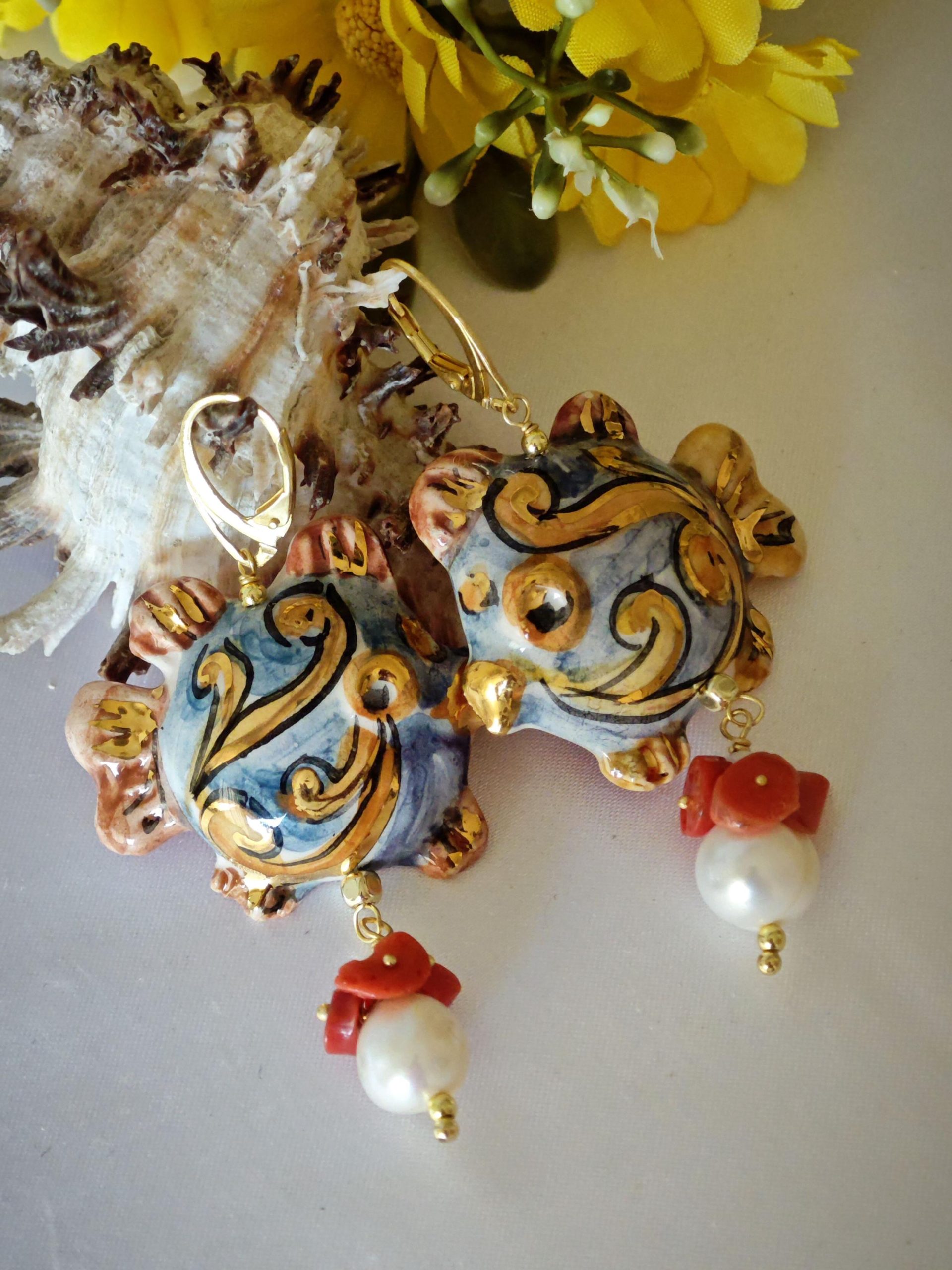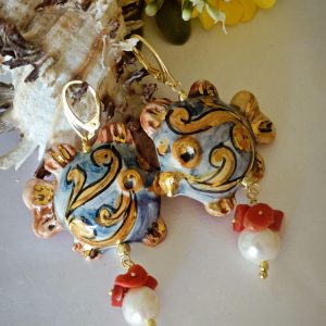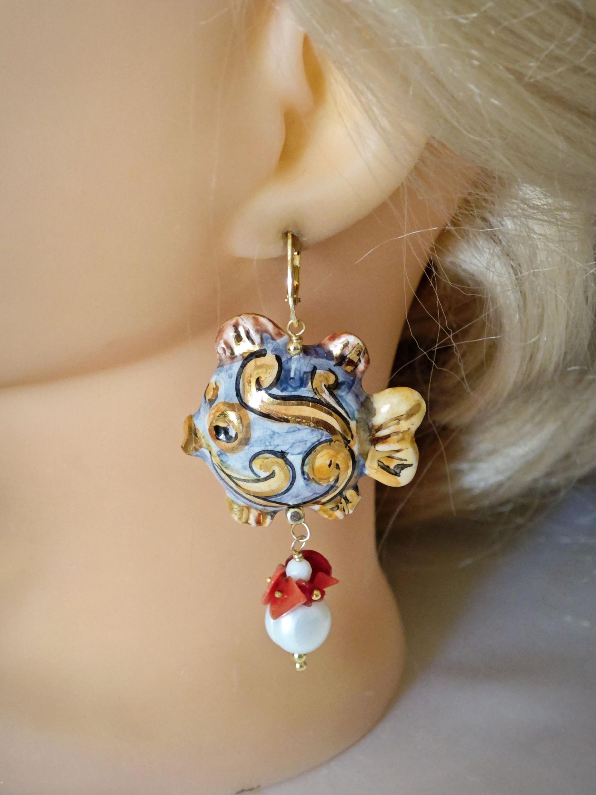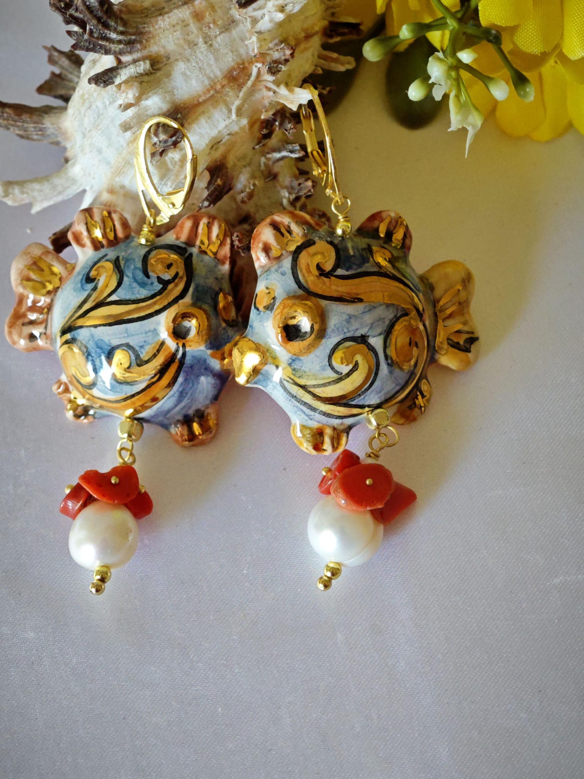 Orecchini pesci ceramica Caltagirone , orecchini perle bianche barocche e corallo naturale, orecchini siciliani