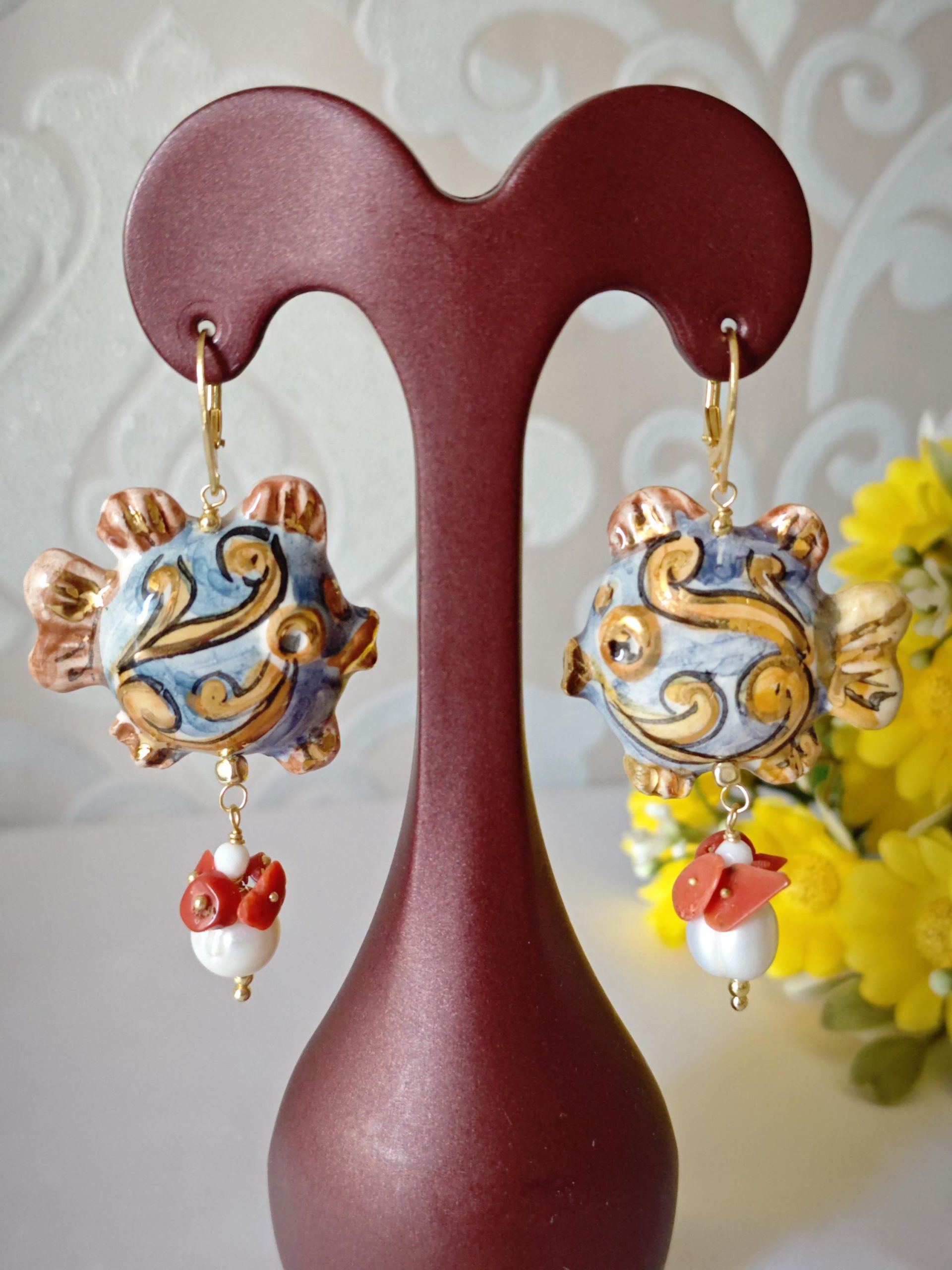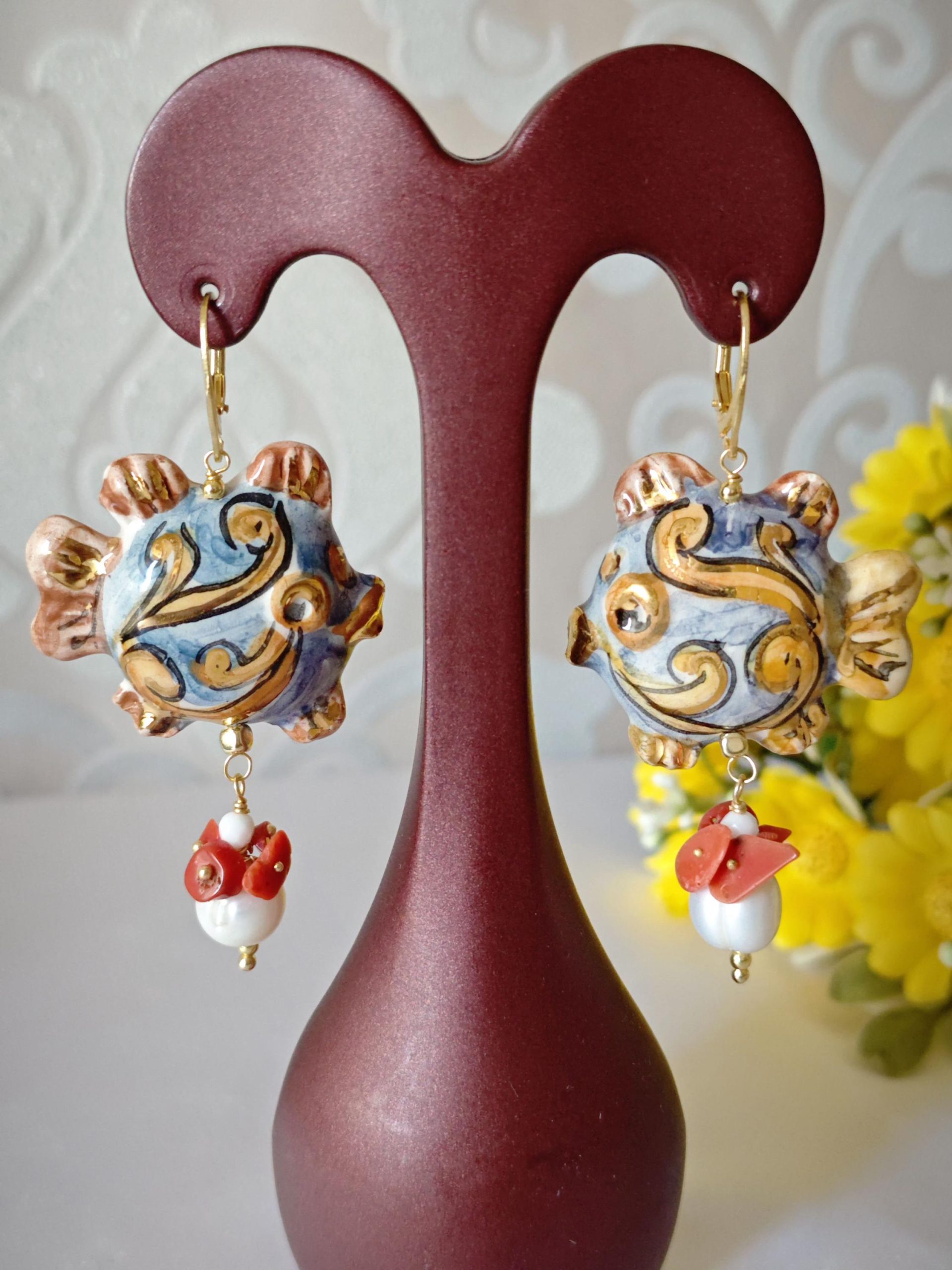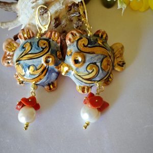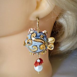 Orecchini pesci ceramica Caltagirone , orecchini perle bianche barocche e corallo naturale, orecchini siciliani