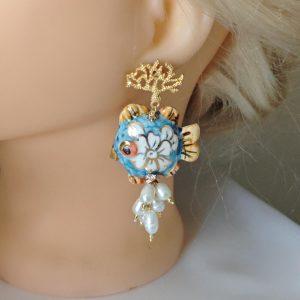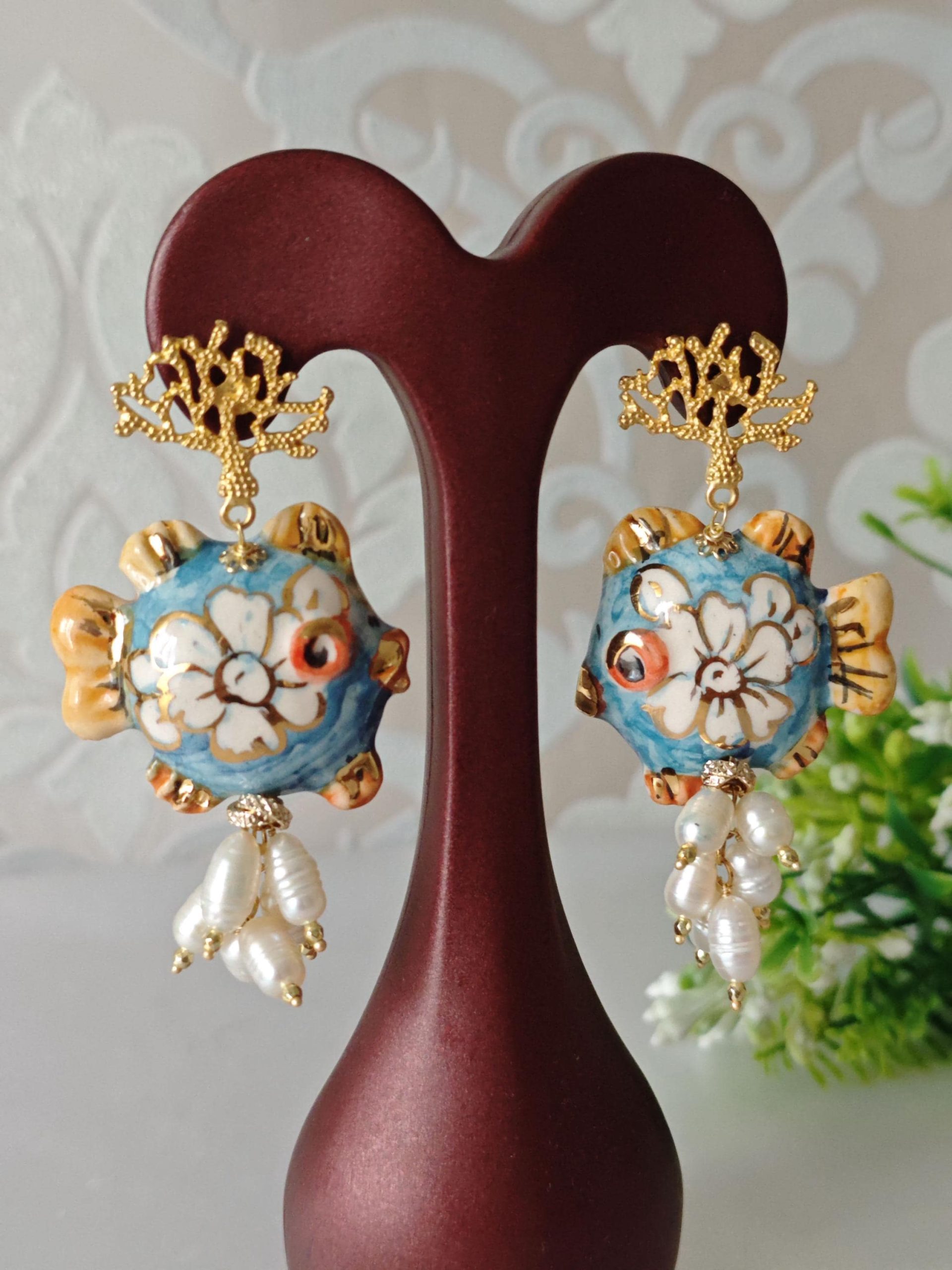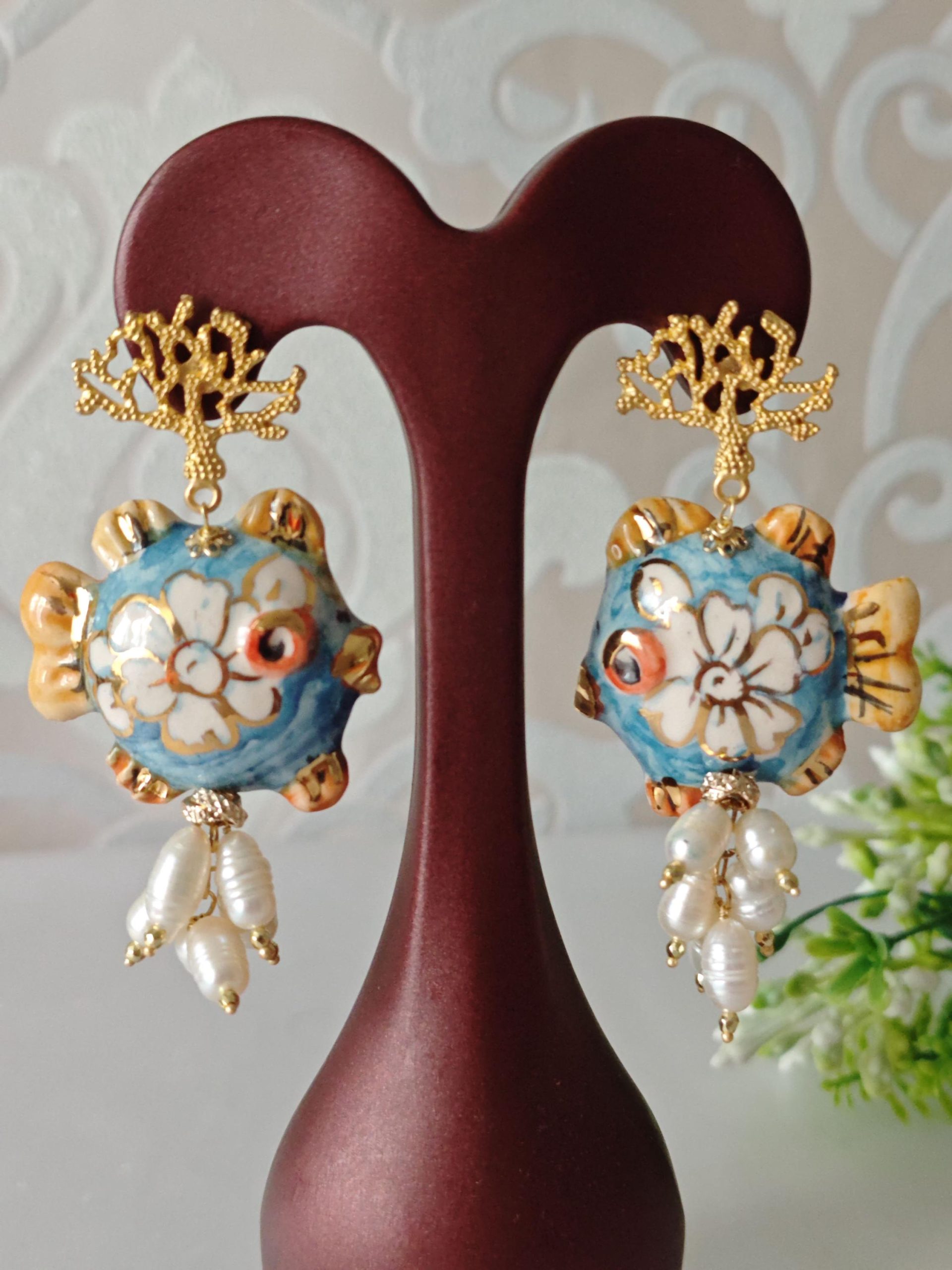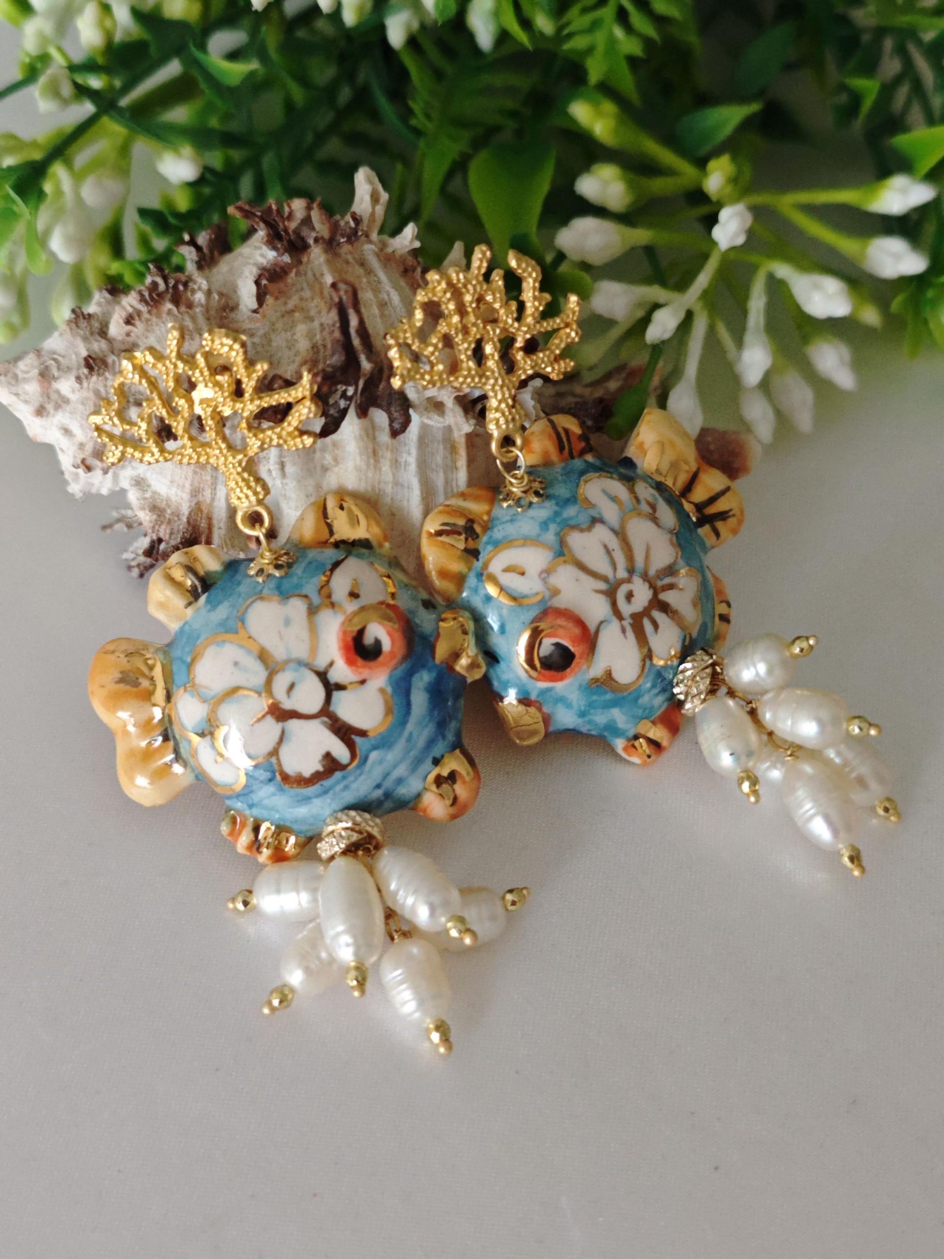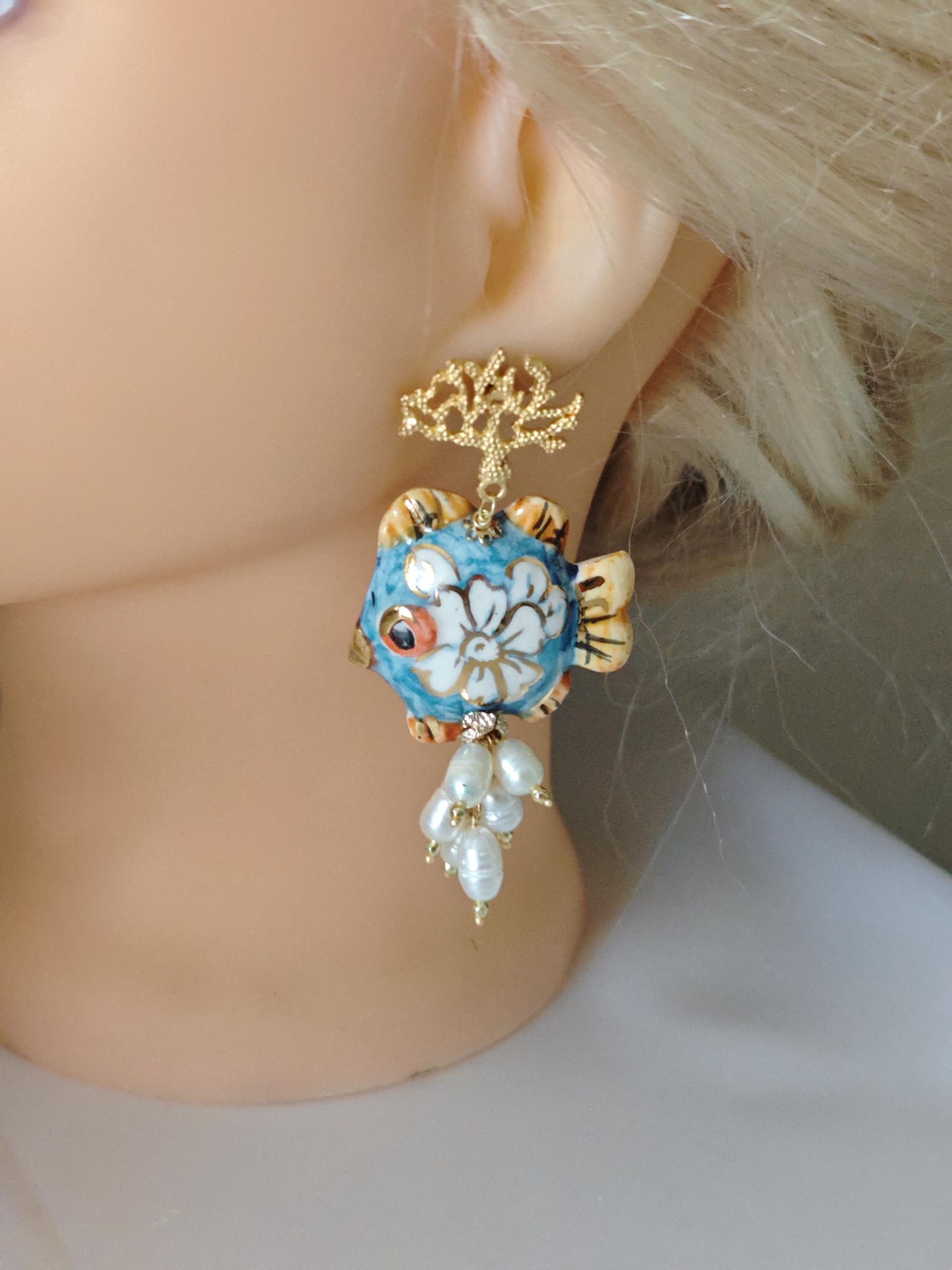 Orecchini pesci ceramica Caltagirone, orecchini perle bianche, orecchini siciliani