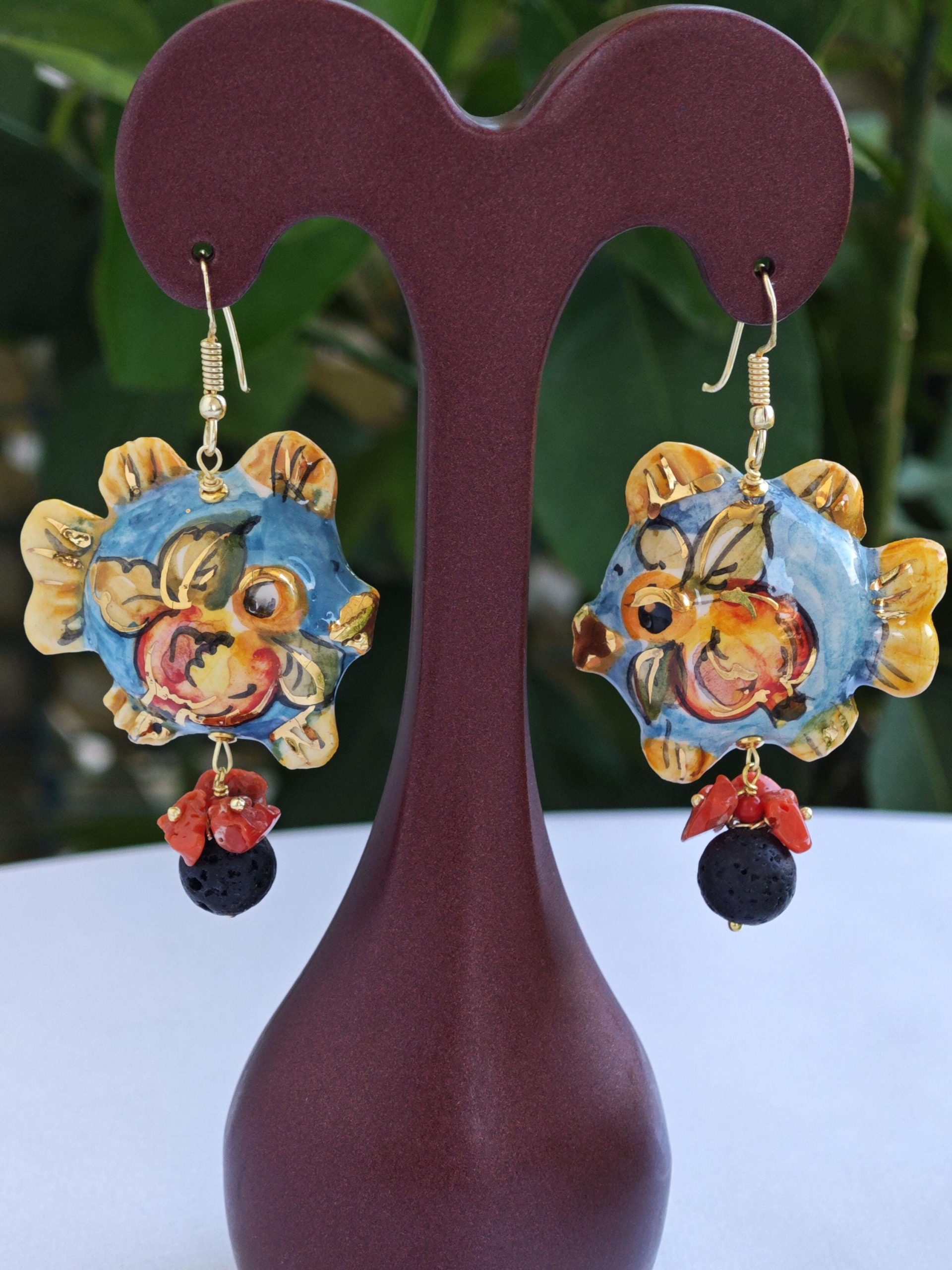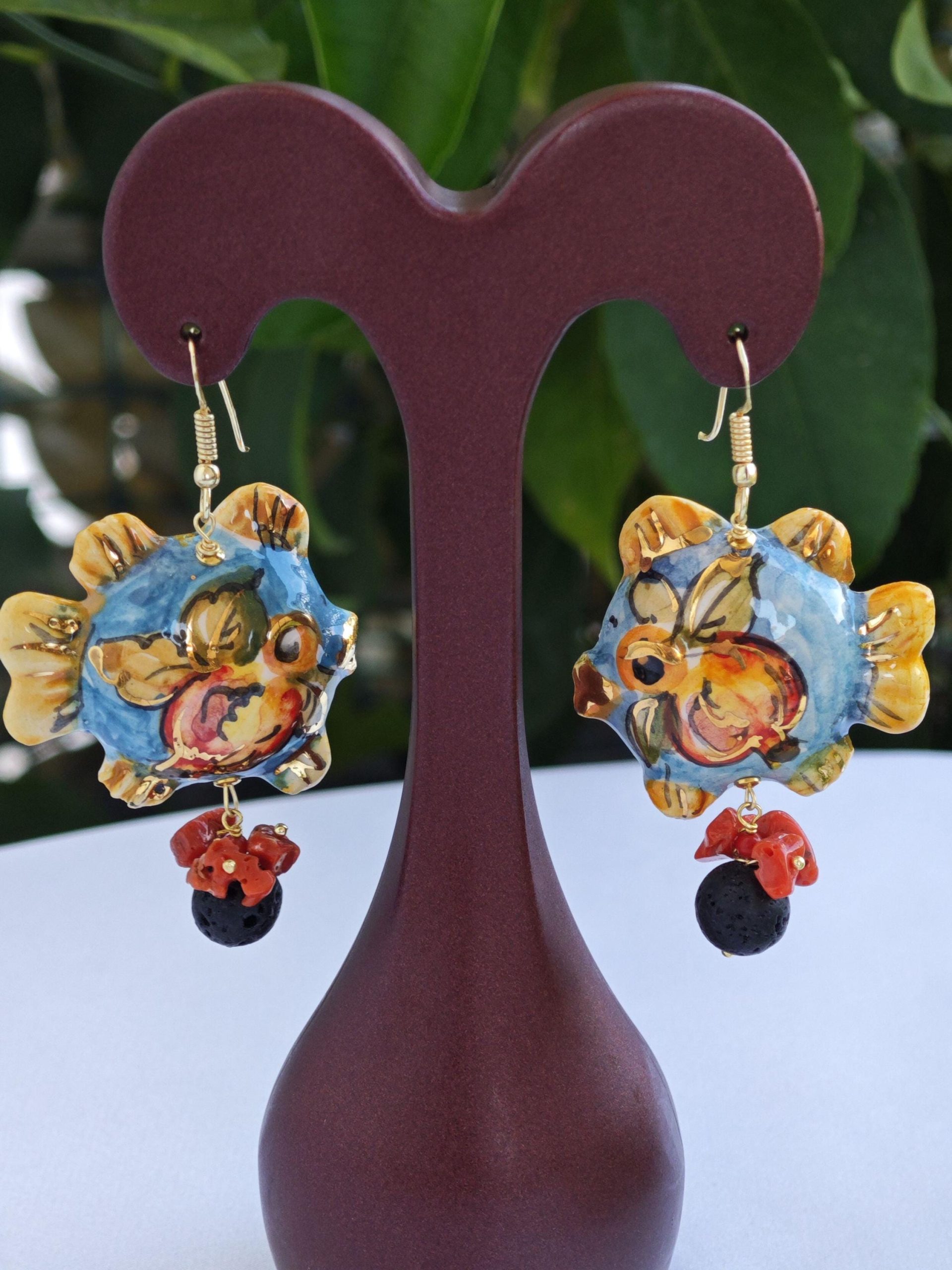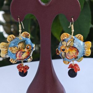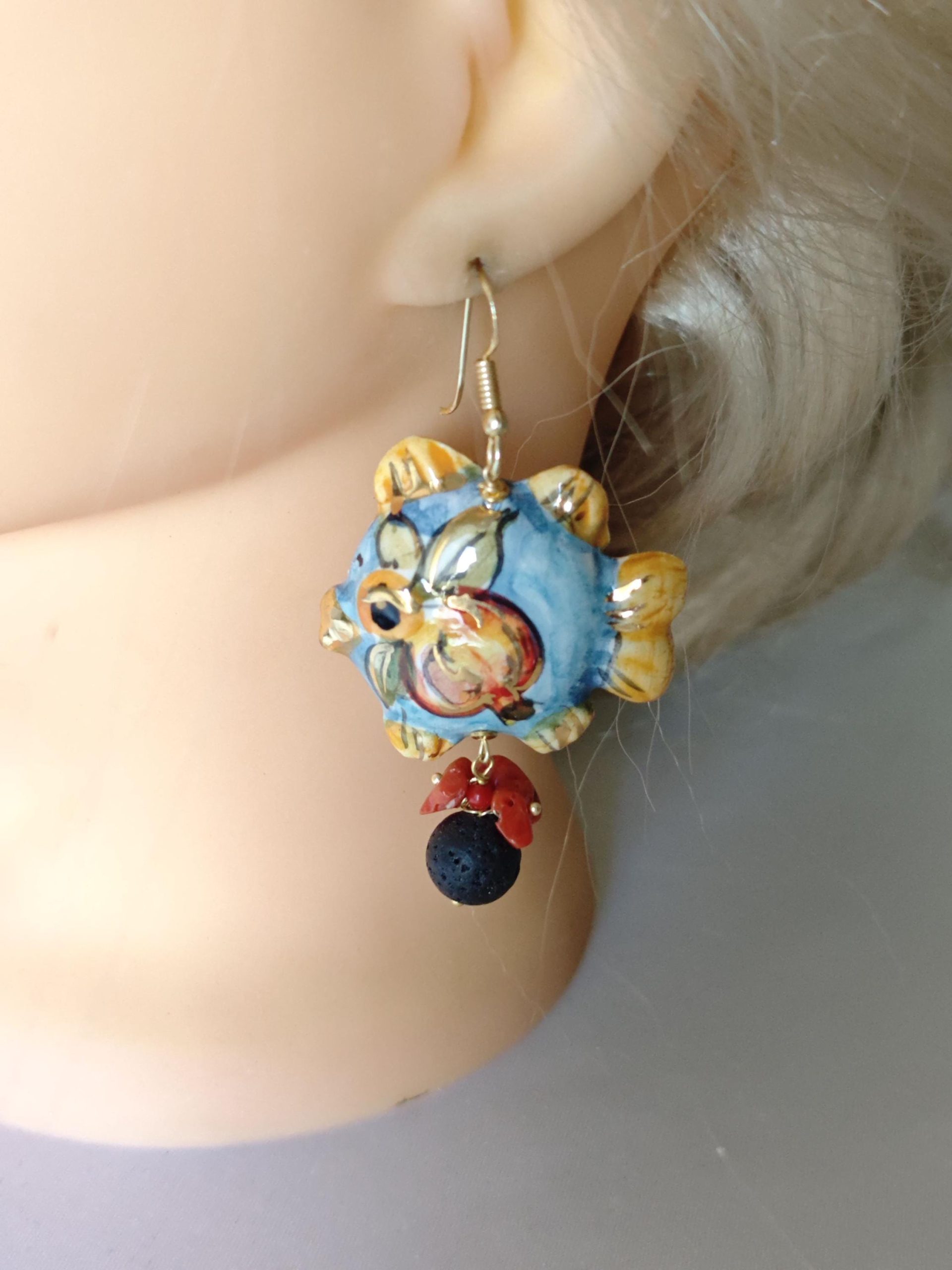 Orecchini pesci ceramica Caltagirone, orecchini pietra lavica e corallo rosso mediterraneo , orecchini siciliani