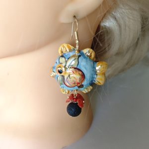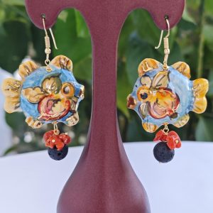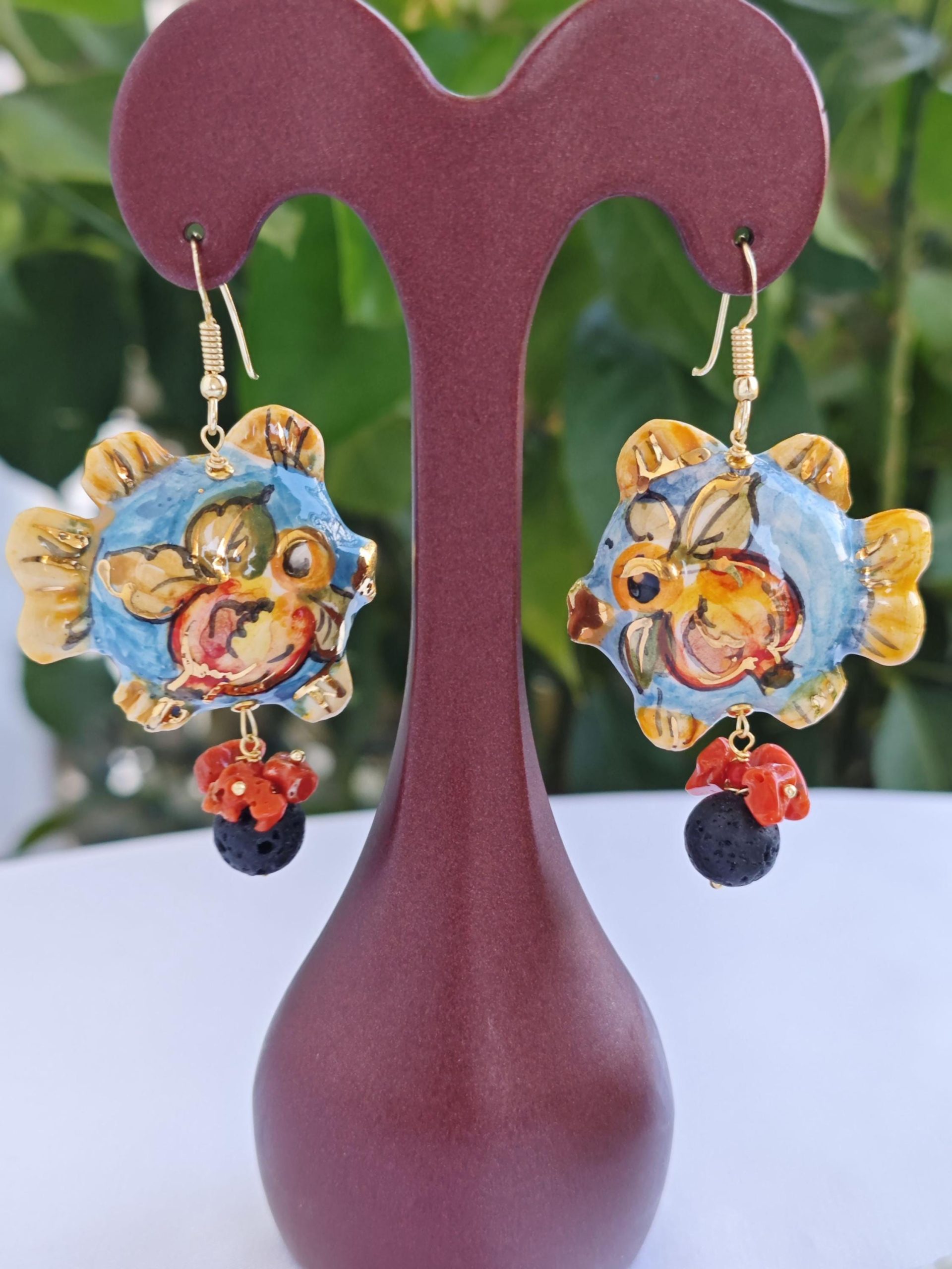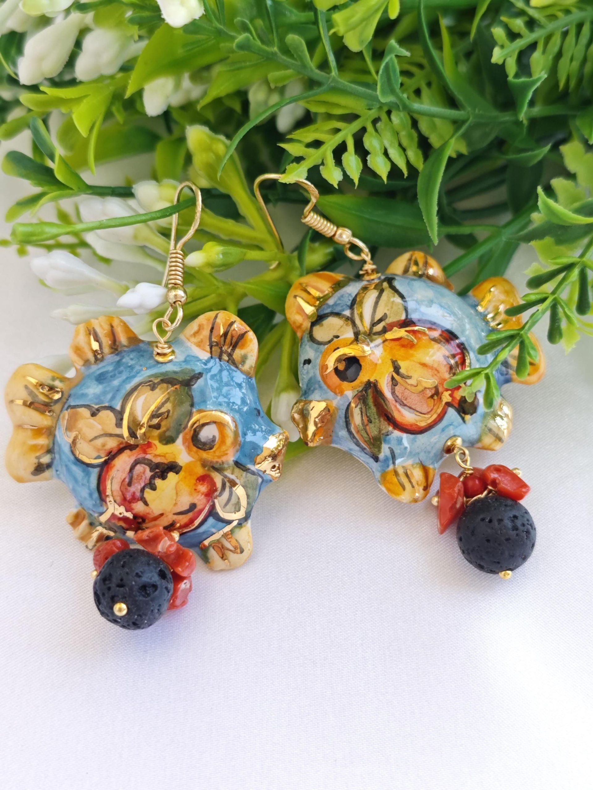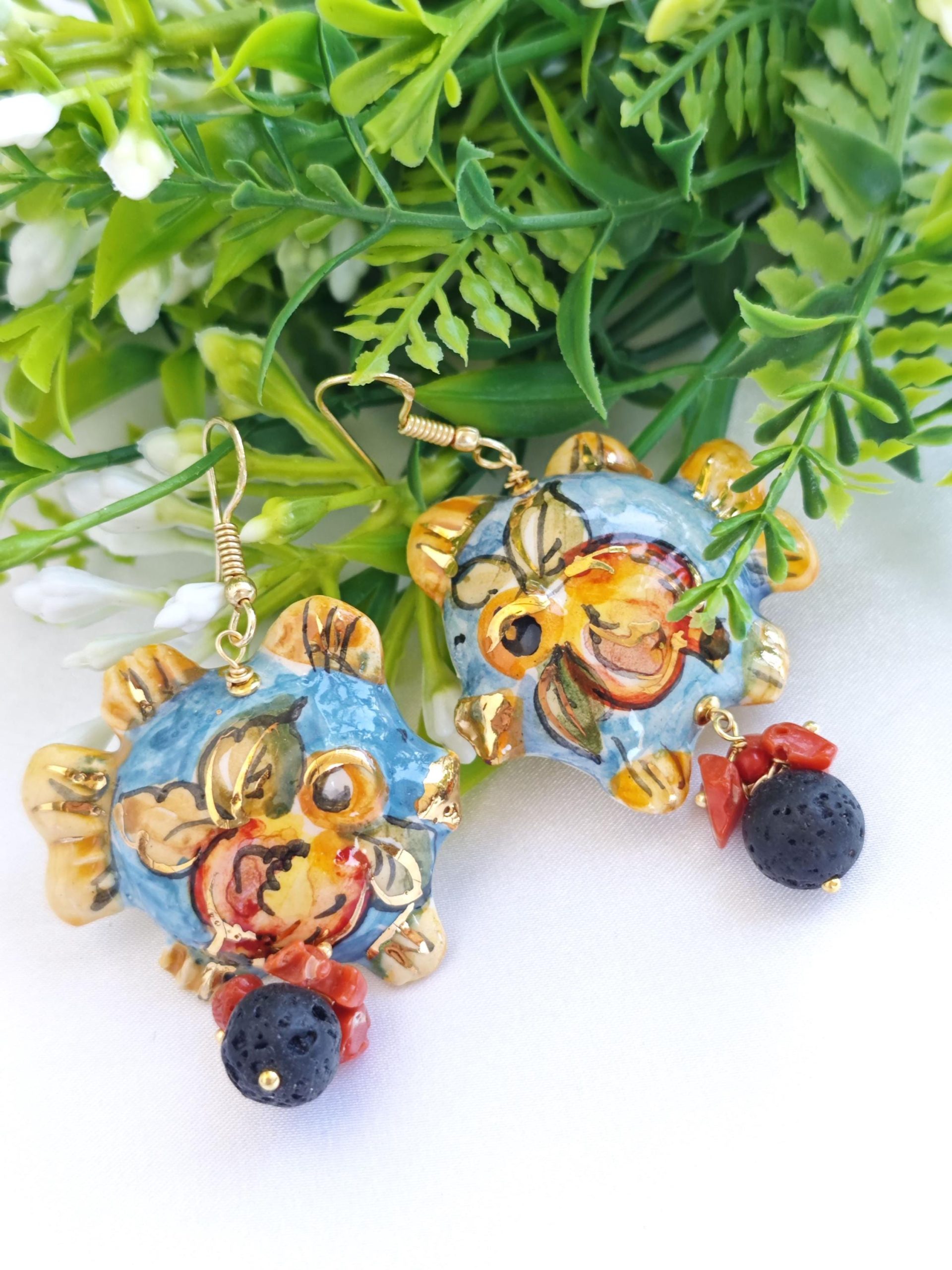 Orecchini pesci ceramica Caltagirone, orecchini pietra lavica e corallo rosso mediterraneo , orecchini siciliani