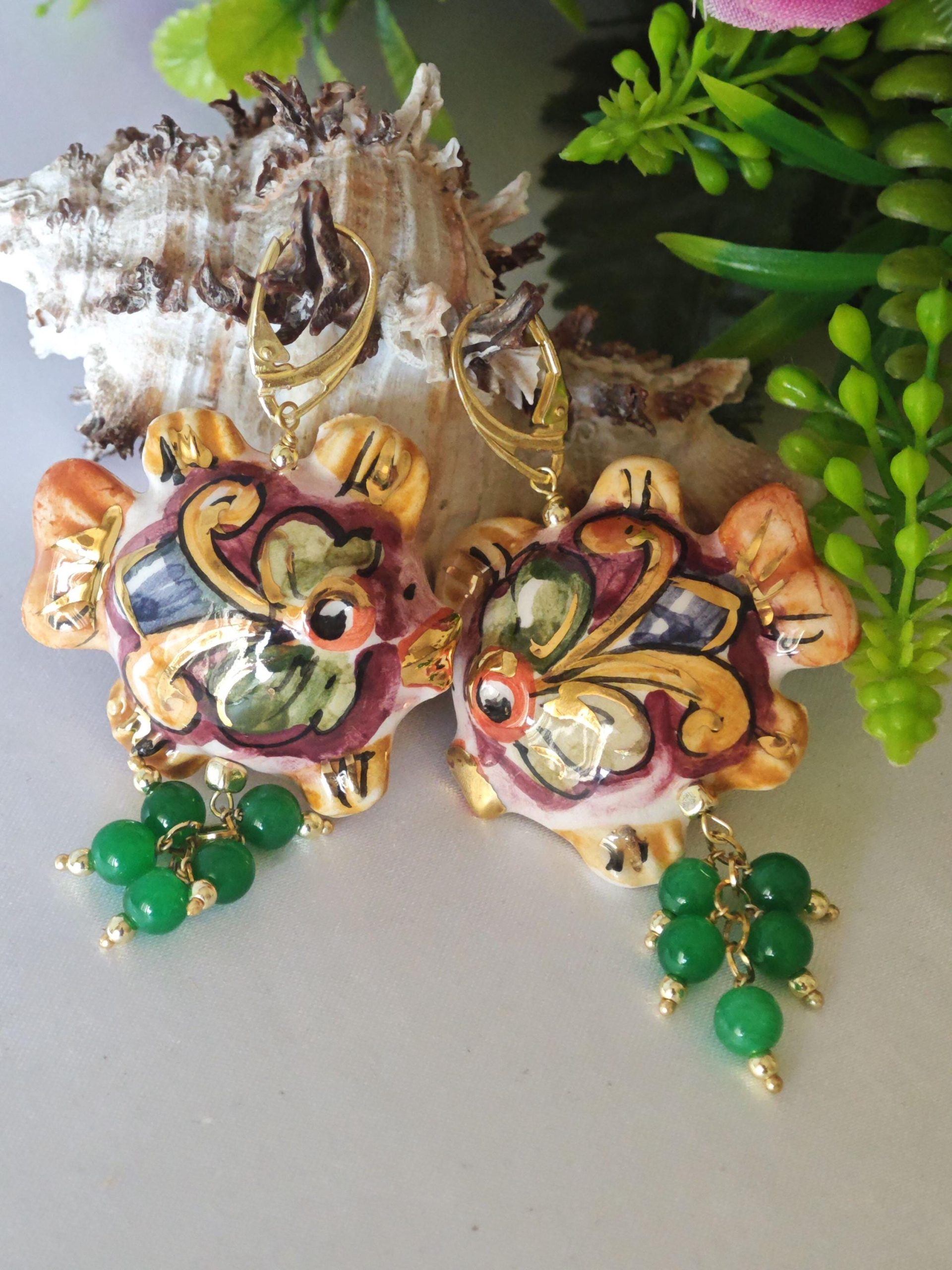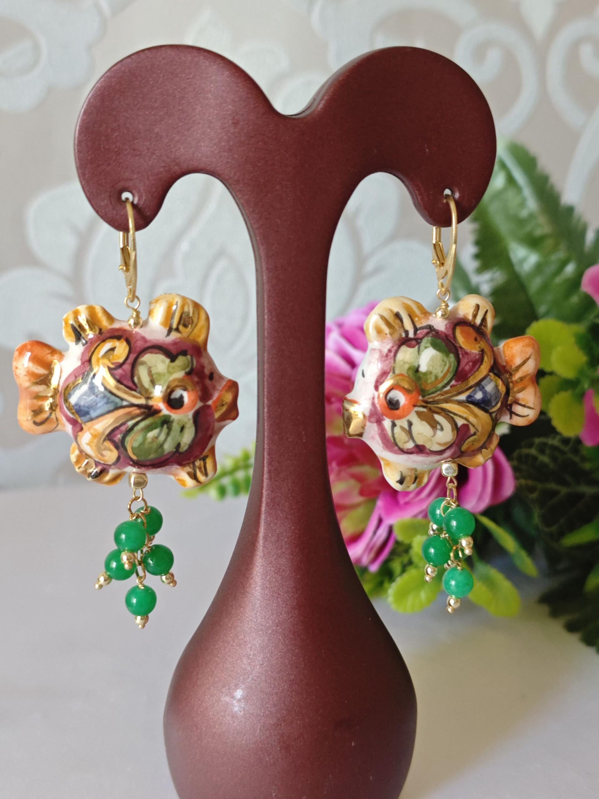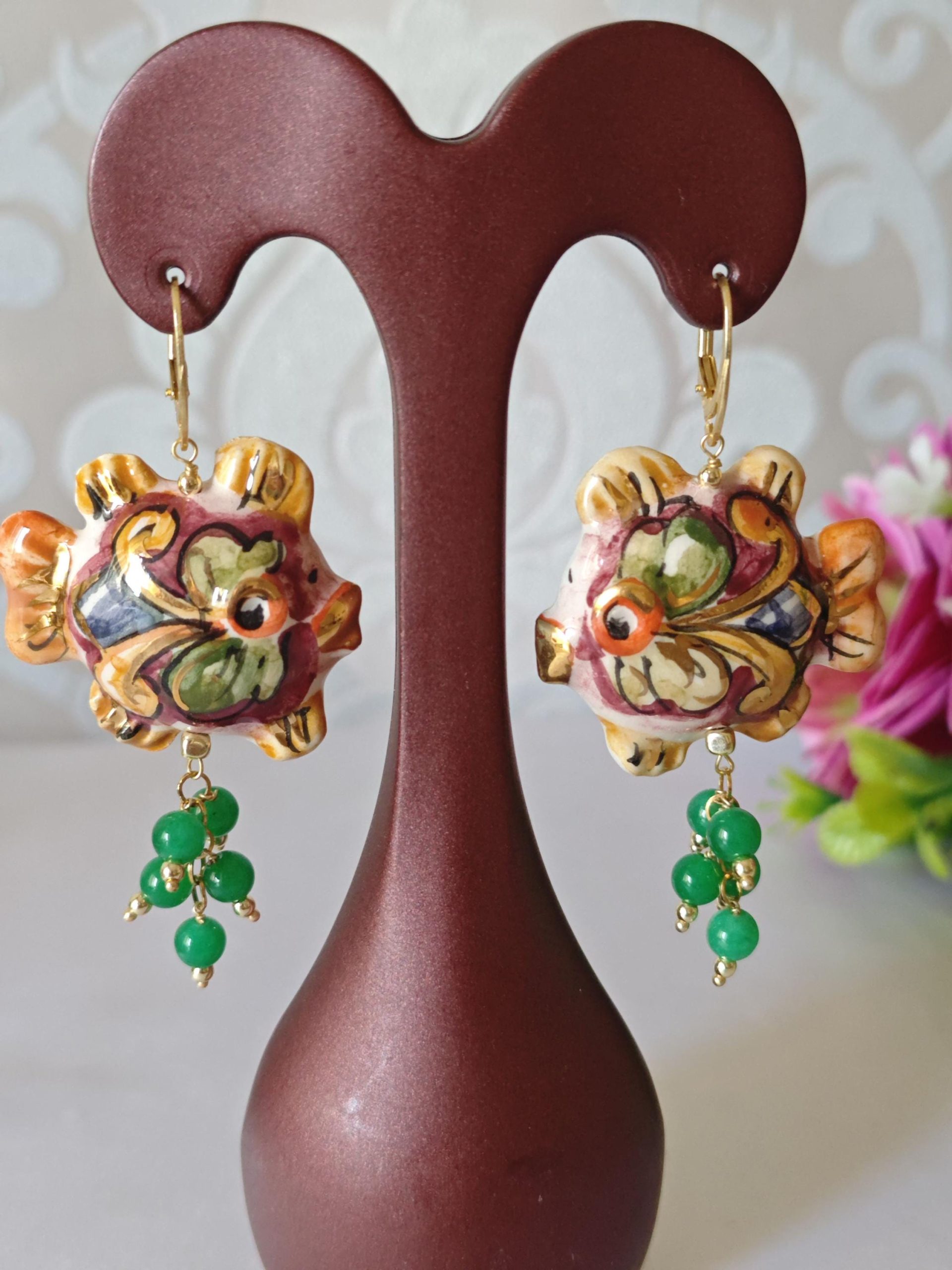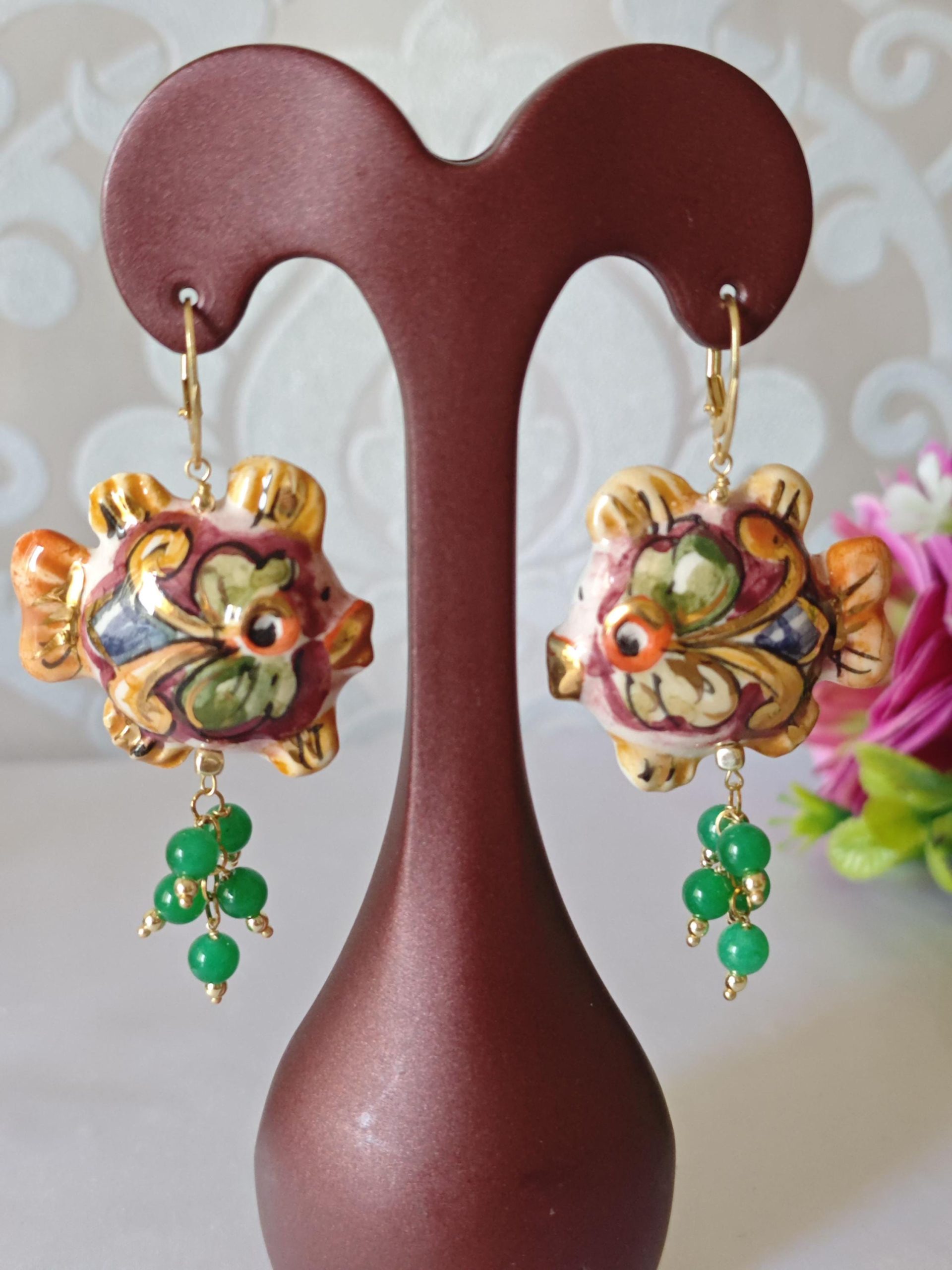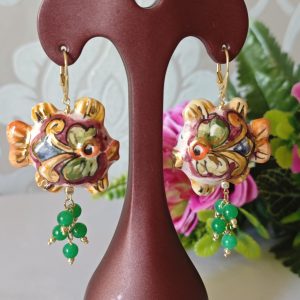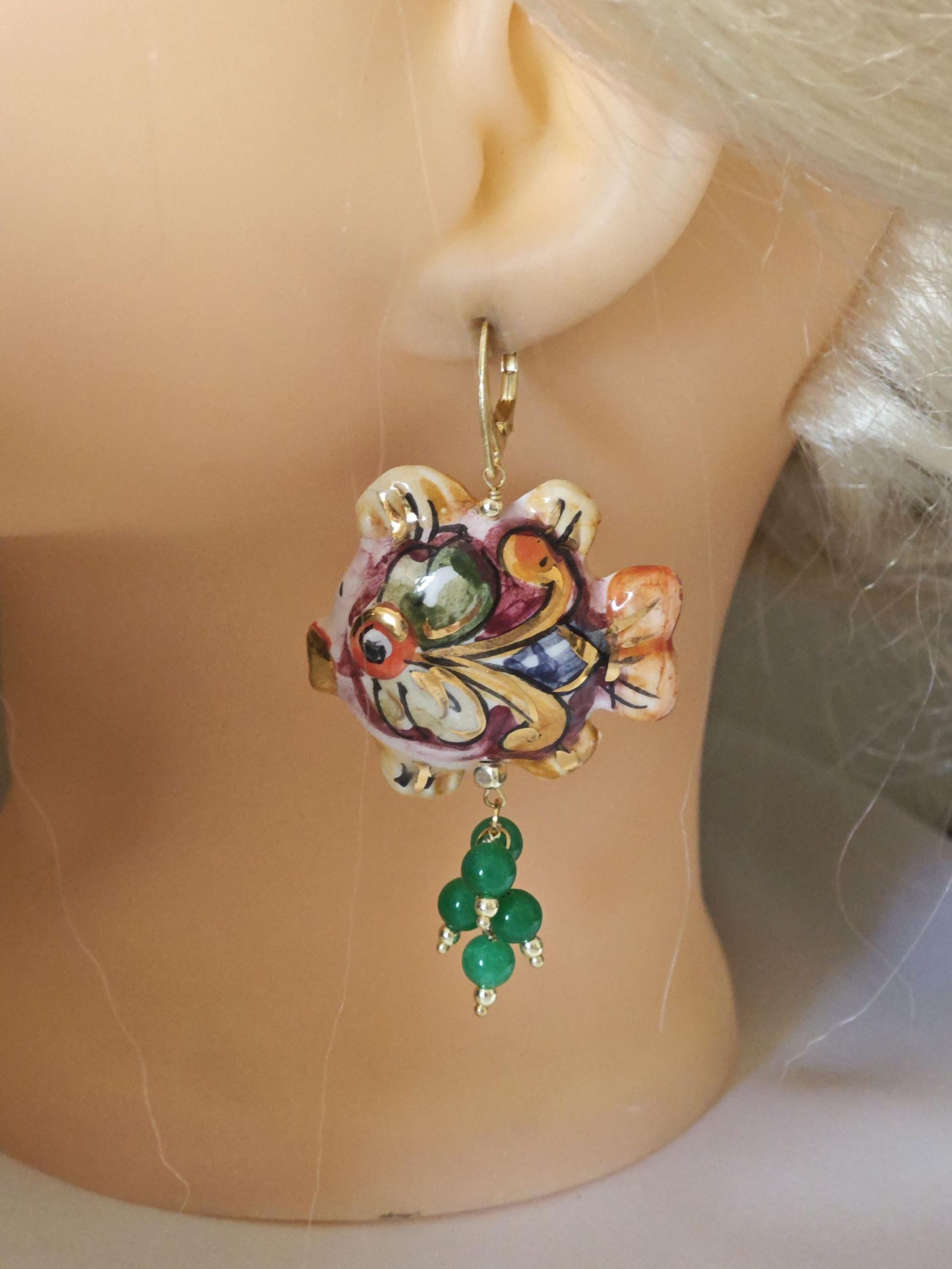 Orecchini pesci ceramica Caltagirone , orecchini pietre quarzo verde, orecchini siciliani