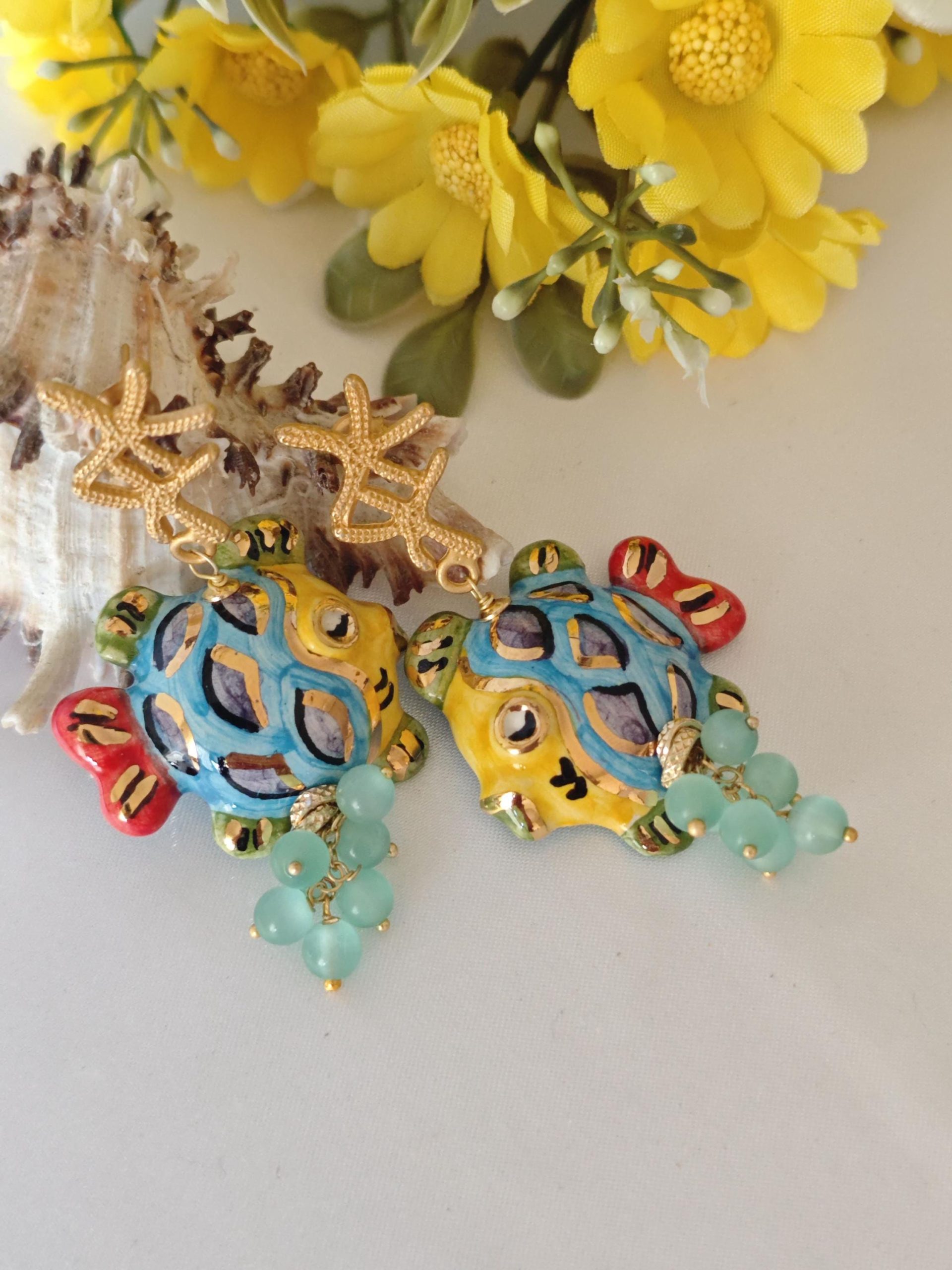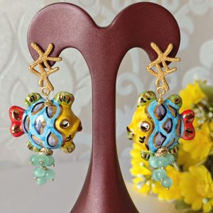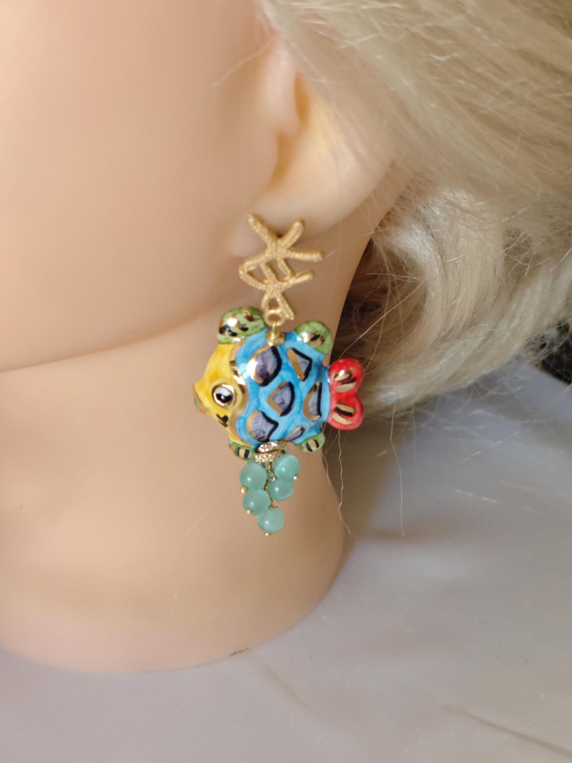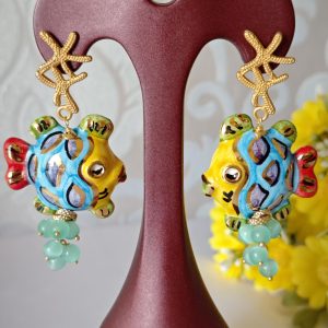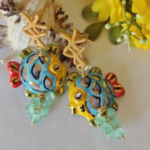 Orecchini pesci ceramica di Caltagirone con pietre quarzo , orecchini siciliani