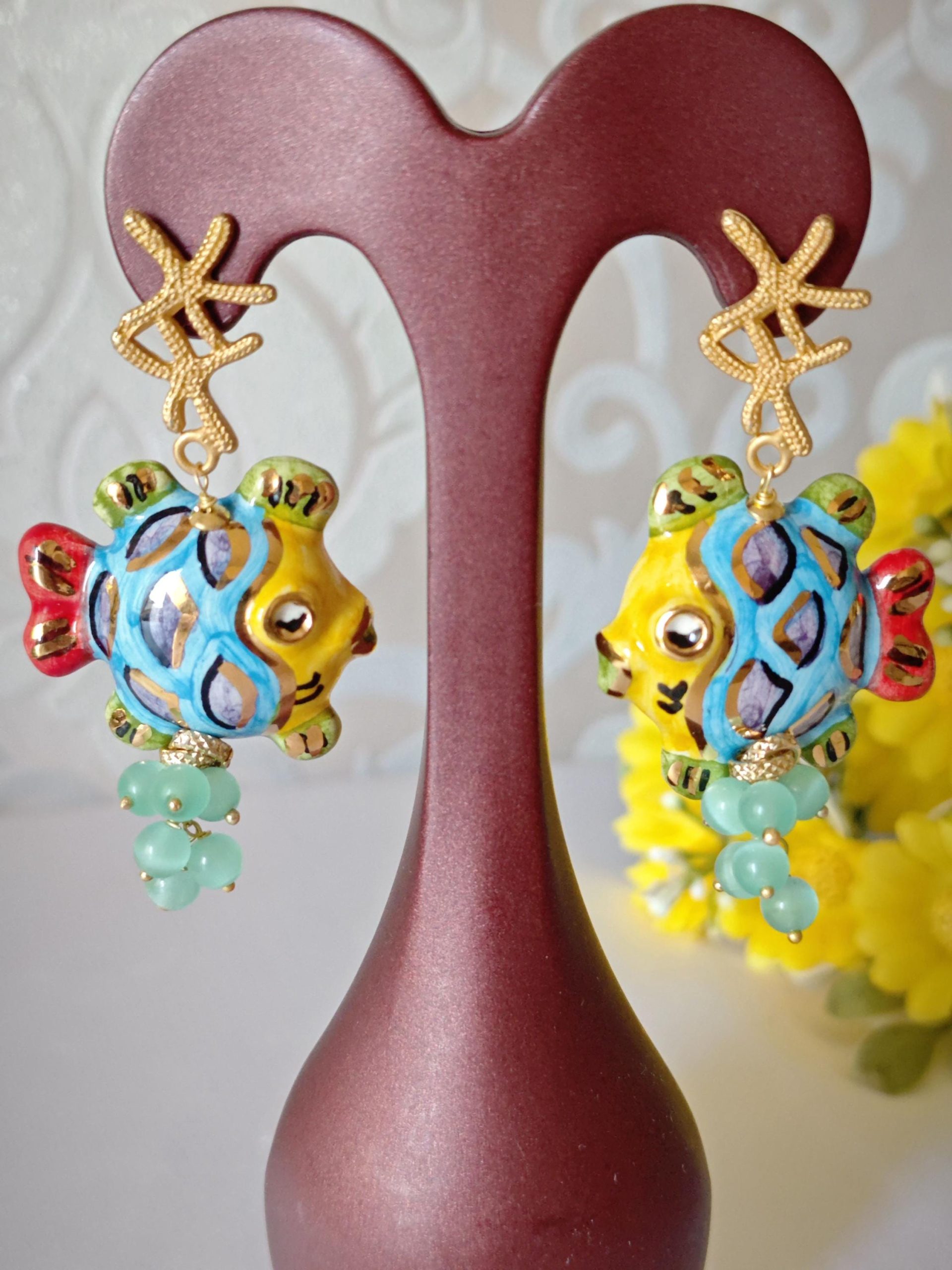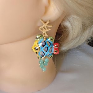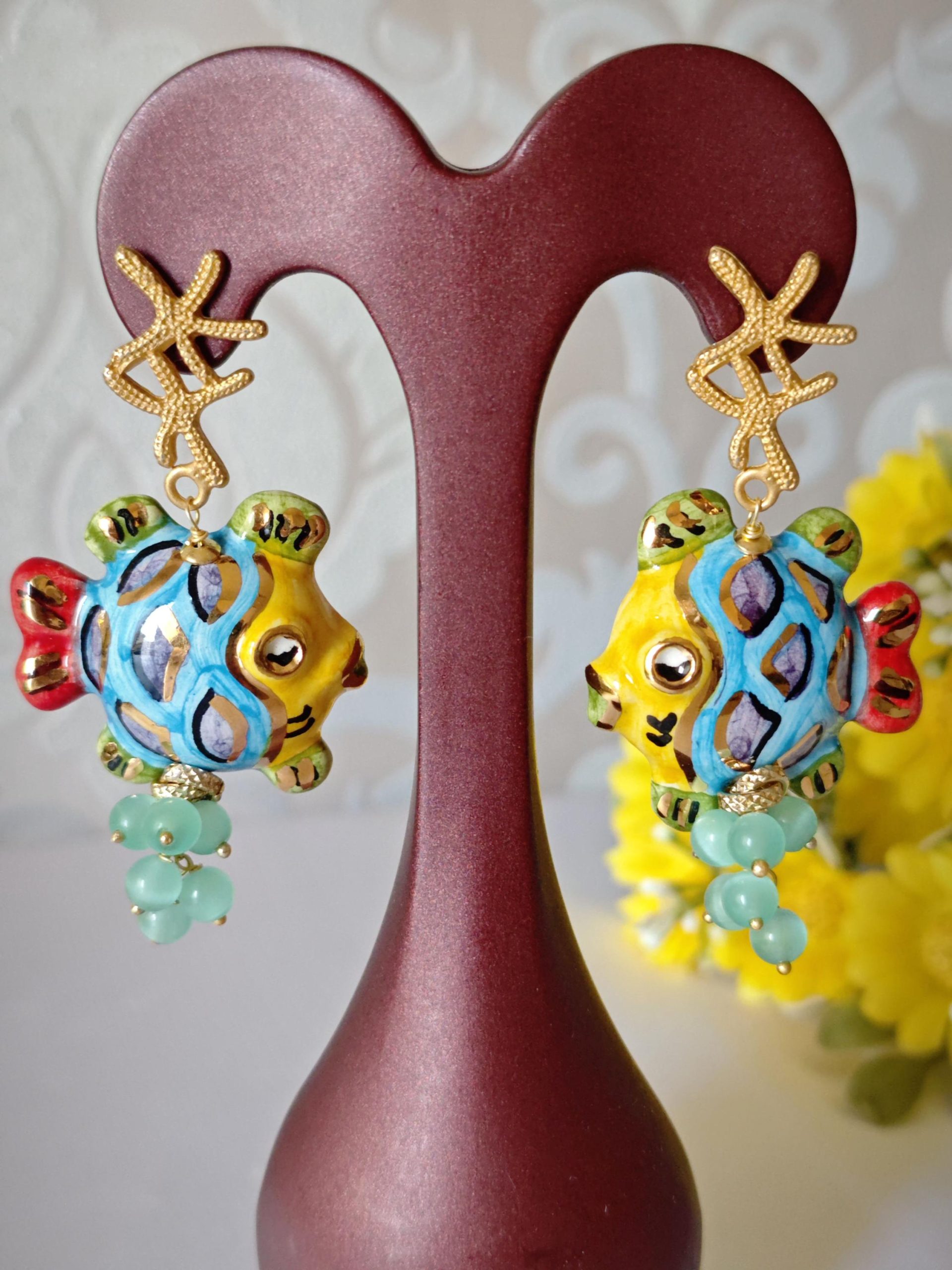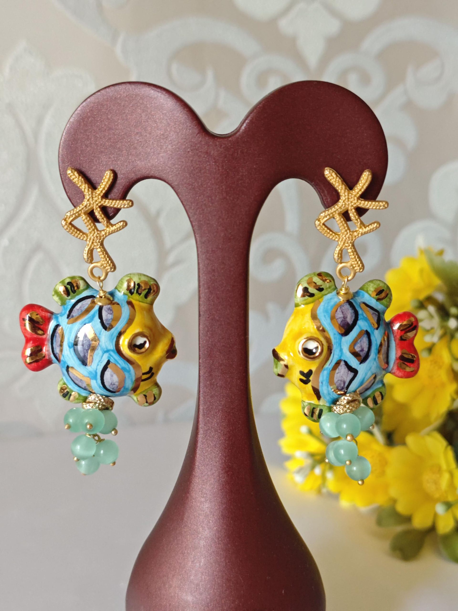 Orecchini pesci ceramica di Caltagirone con pietre quarzo , orecchini siciliani