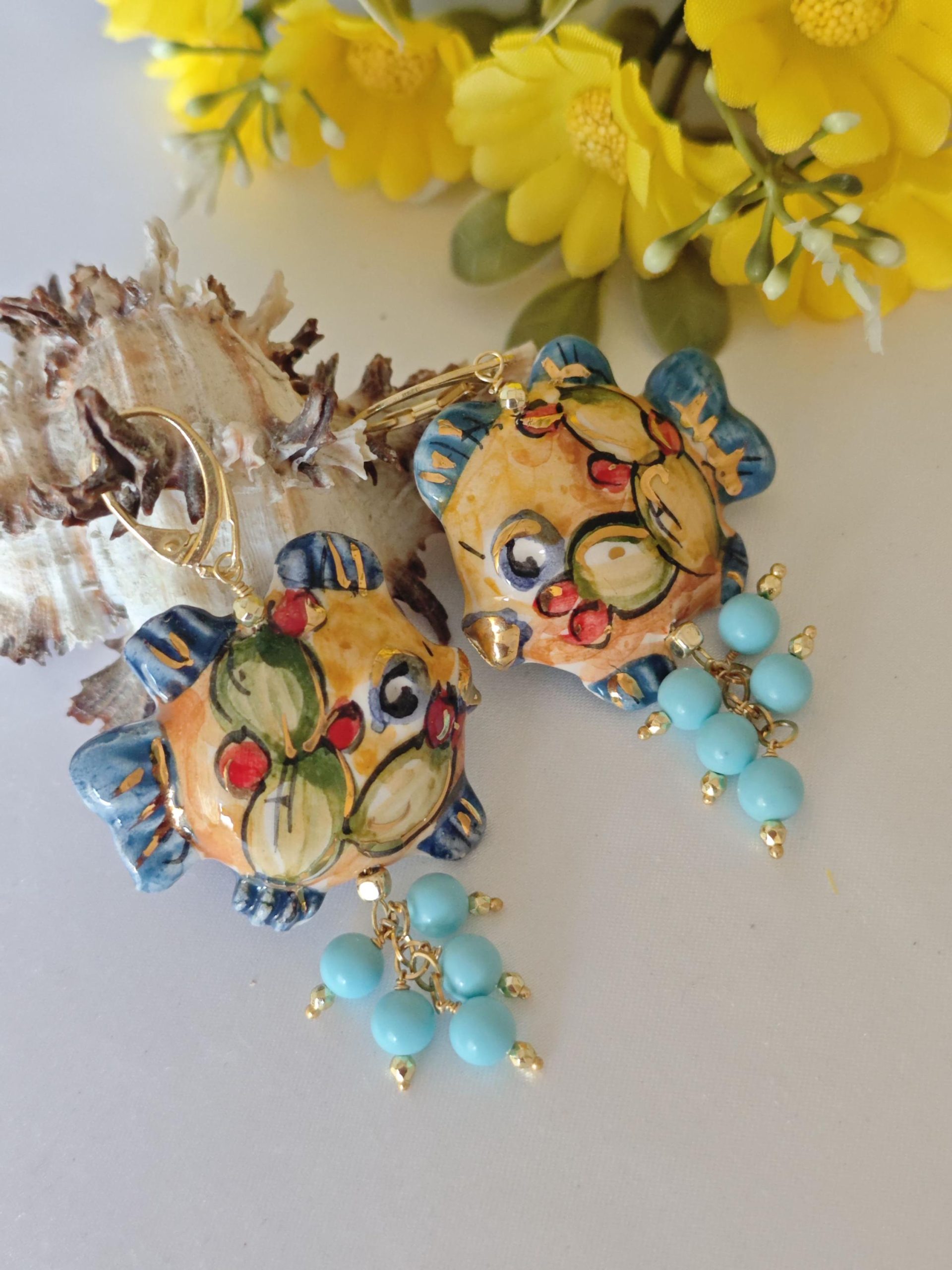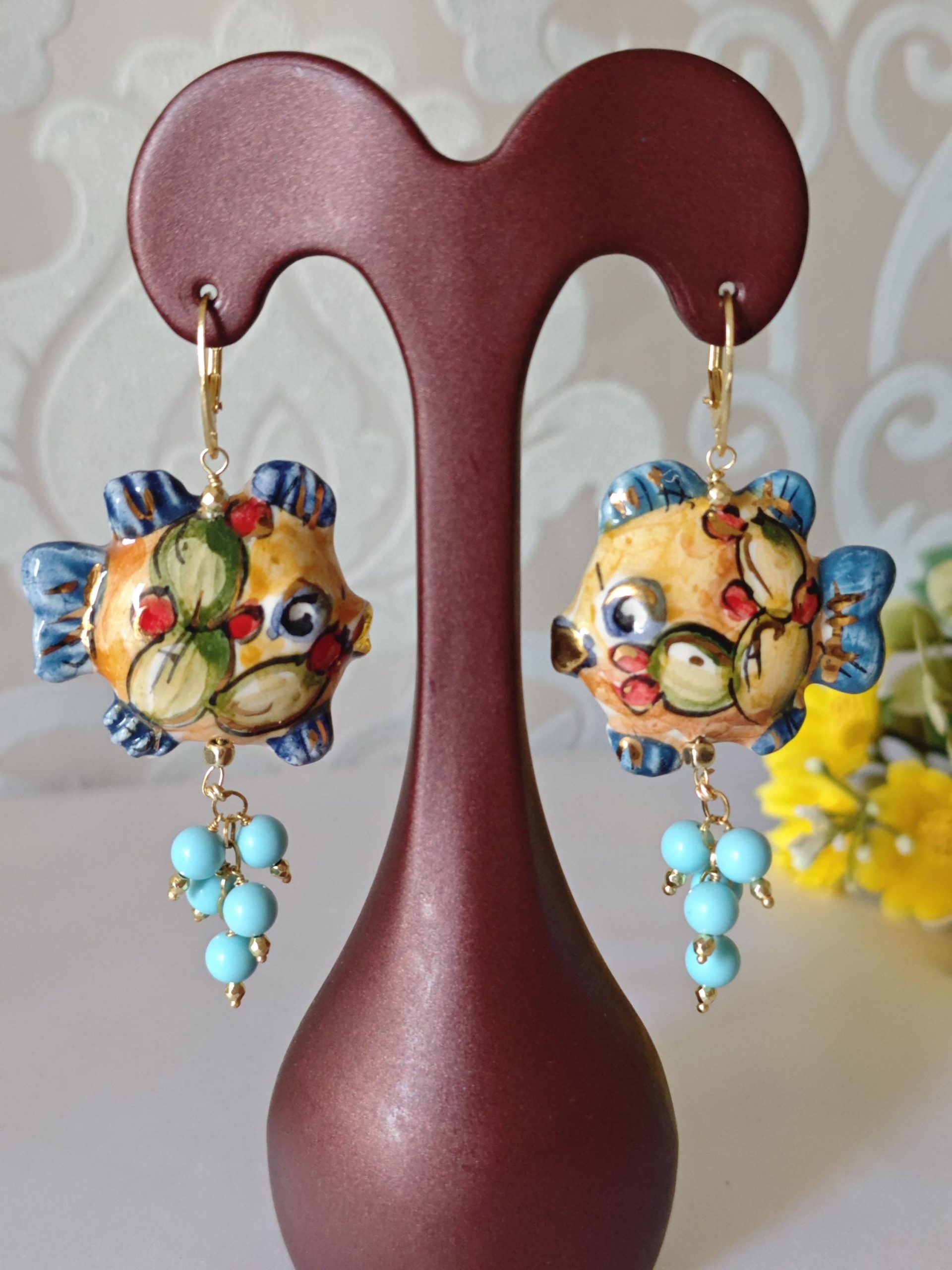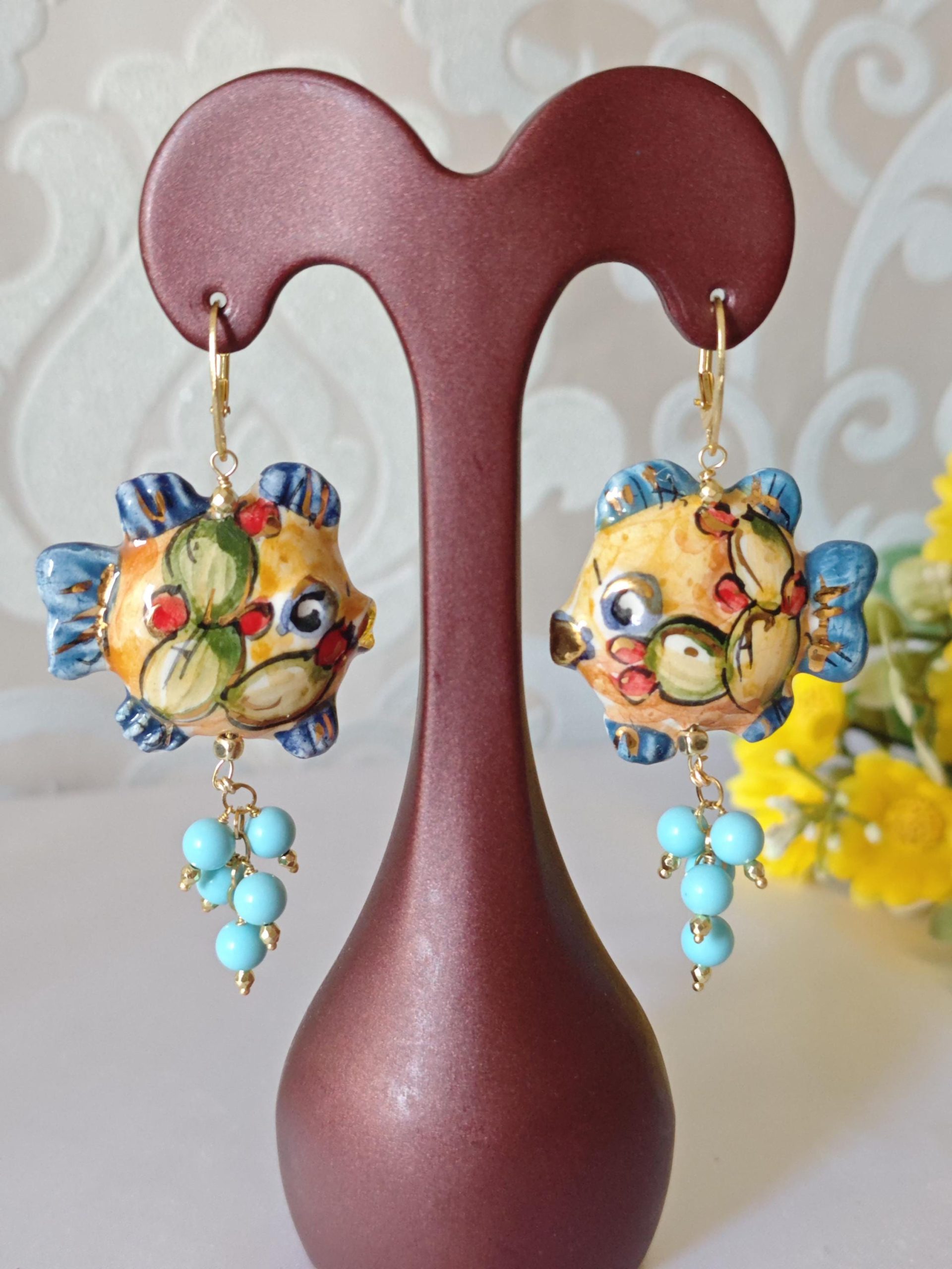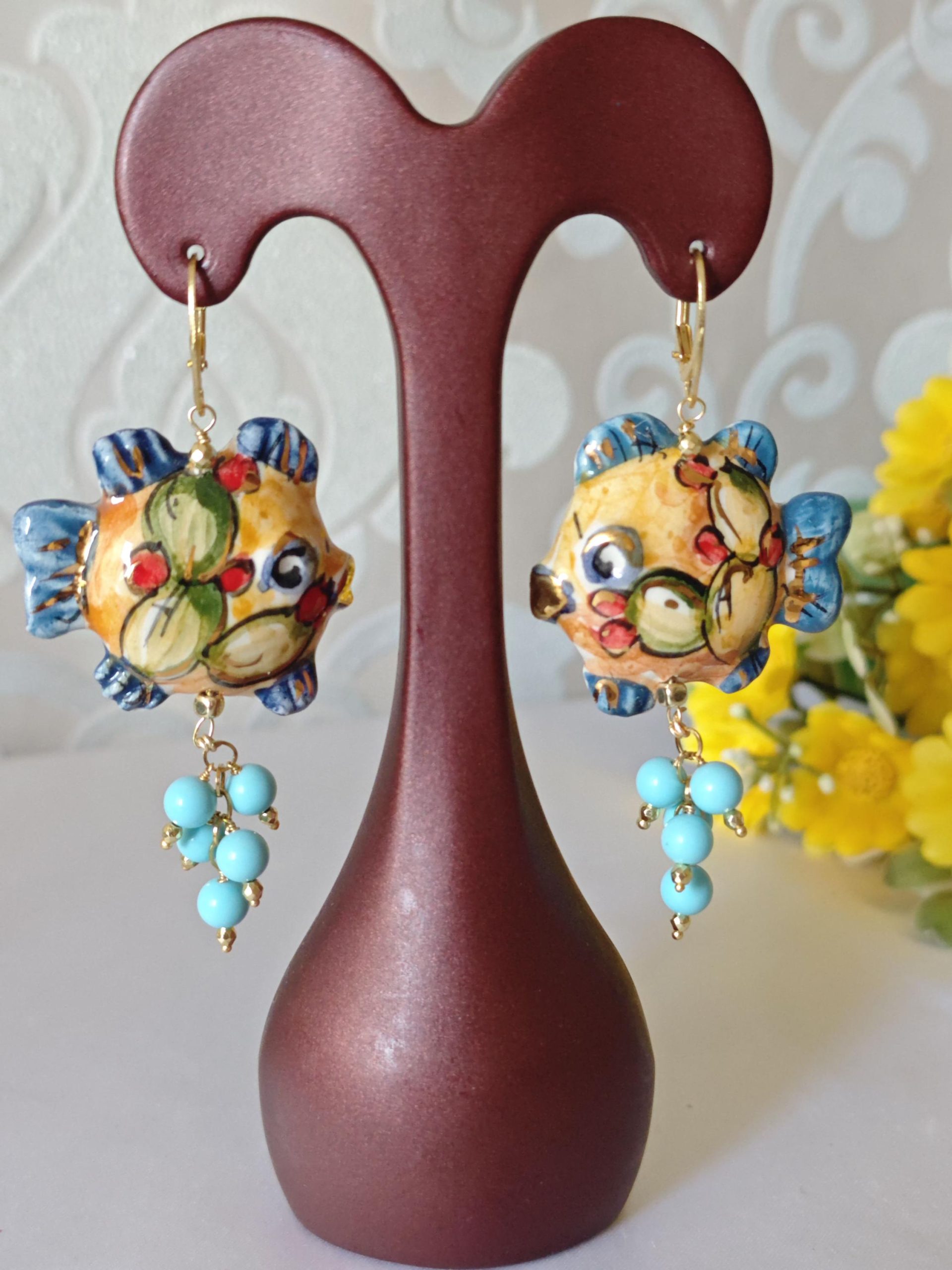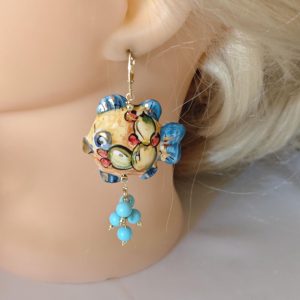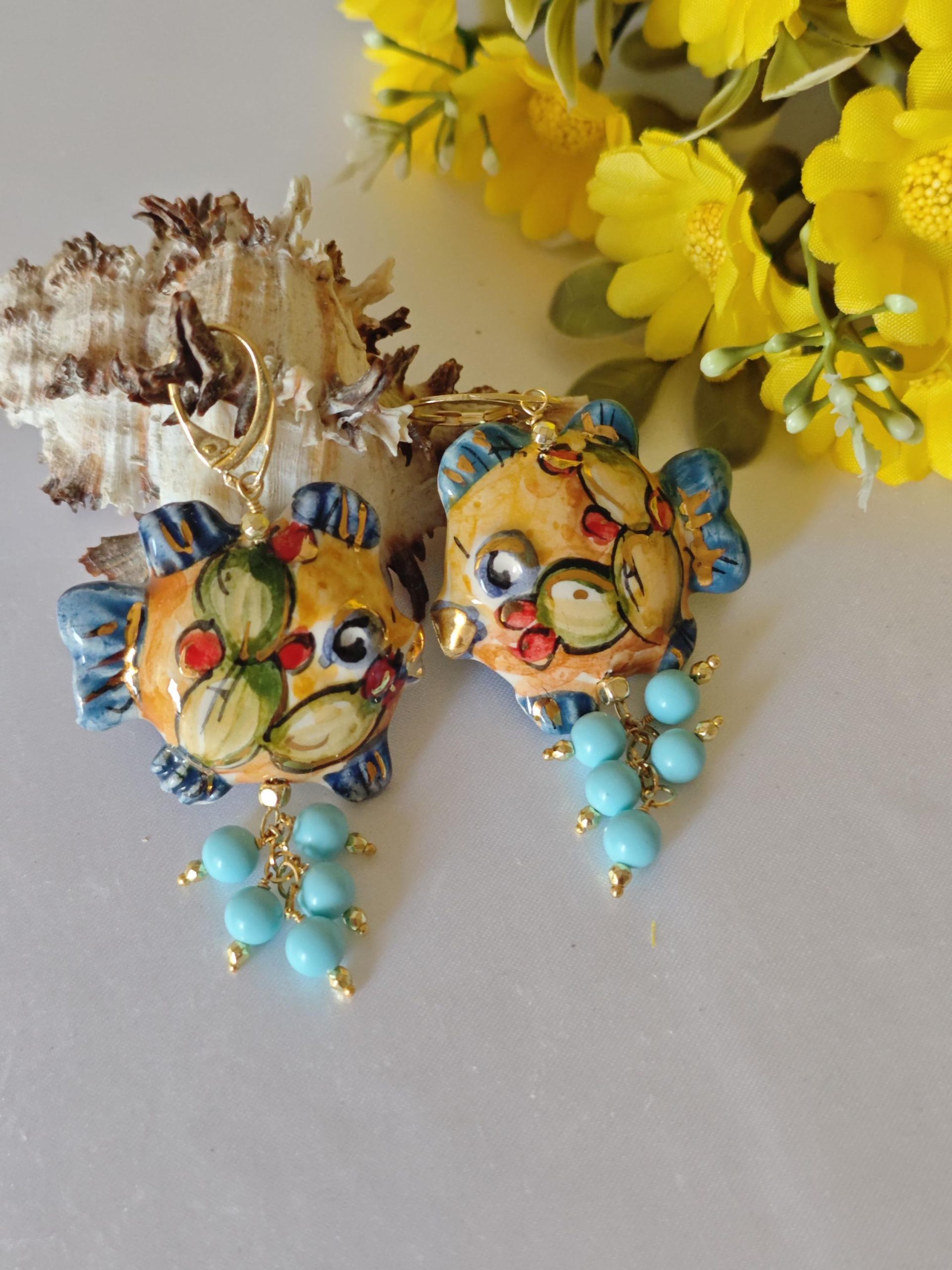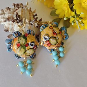 Orecchini pesci ceramica di Caltagirone, orecchini perle turchese , orecchini siciliani