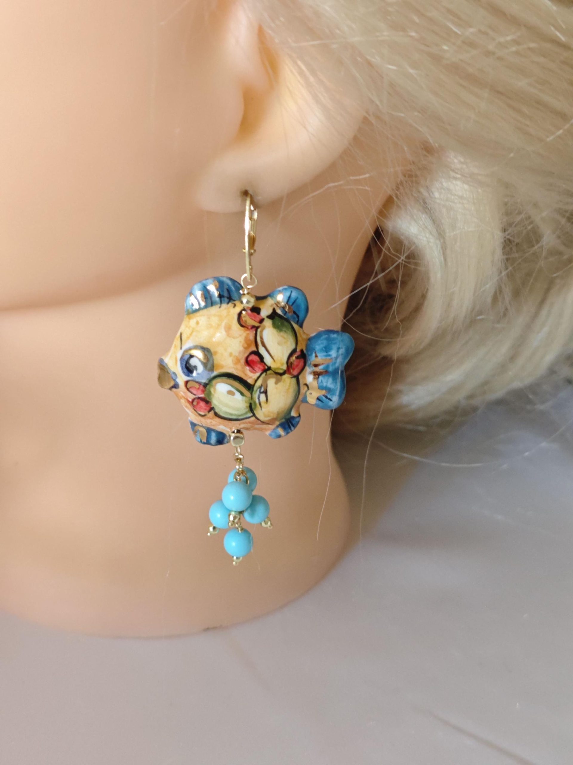 Orecchini pendenti con pesciolini in ceramica Caltagirone, realizzata e dipinta a mano, 2,5×3,5 cm dimensioni , grappolo perle pasta di turchese .